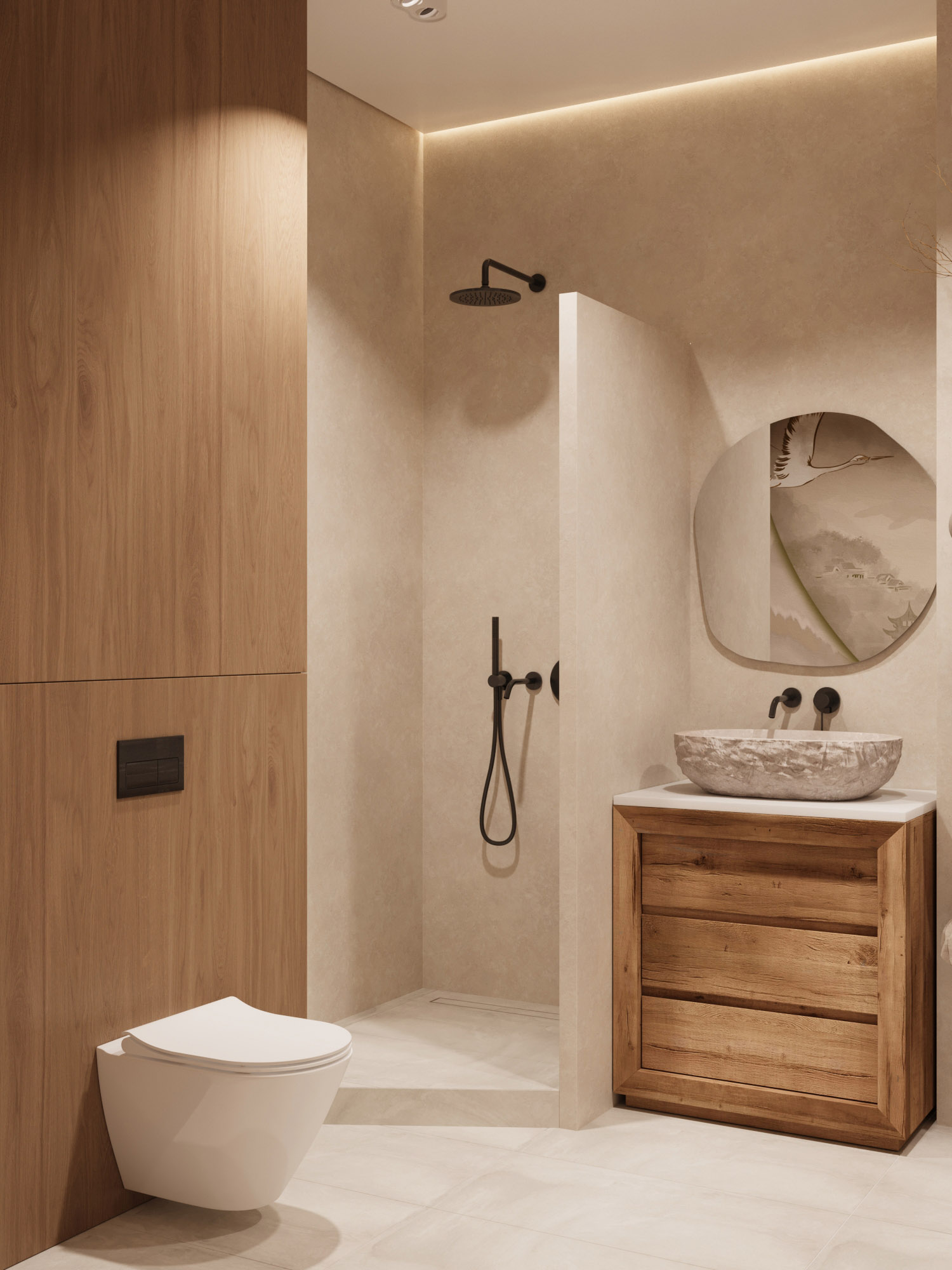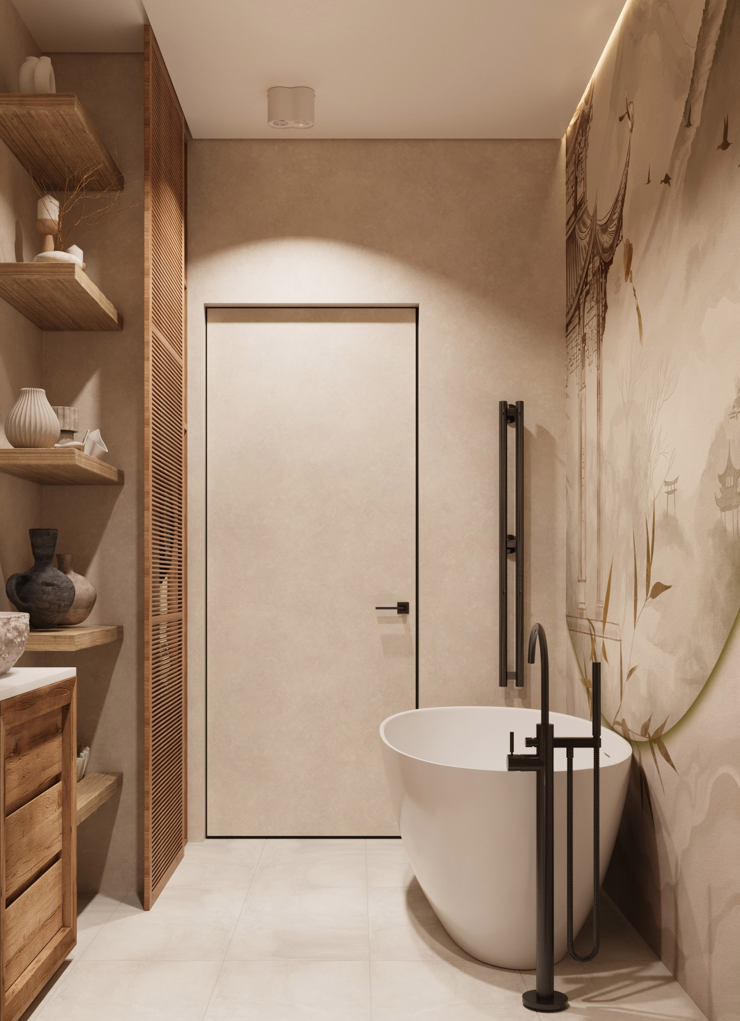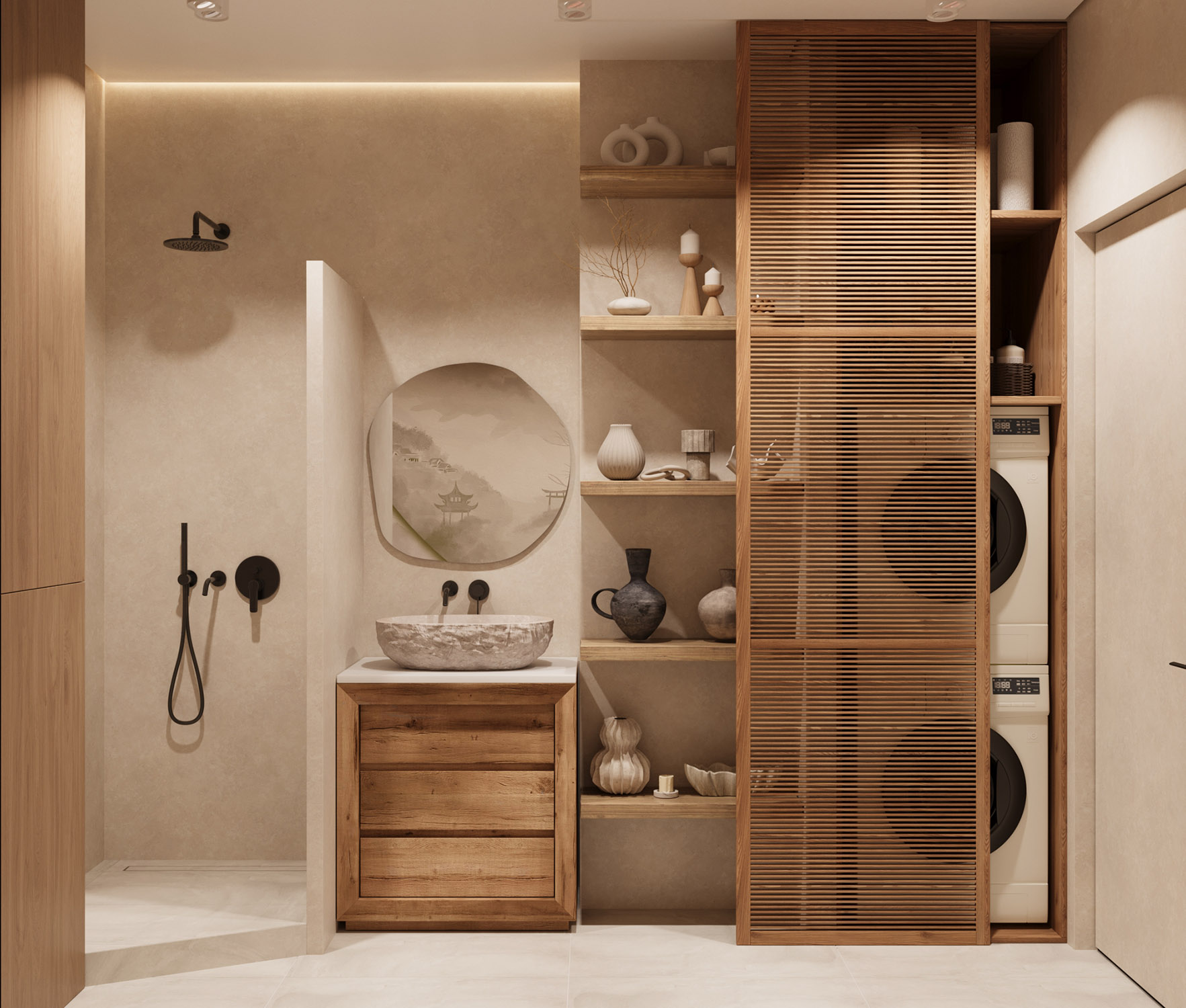 Ванная комната площадью 8 м² в стиле Джапанди для квартиры с посуточной арендой, г. Краснодар. Высота потолков здесь — 3 метра. Задача была разместить большую ванну 180х80, душевую и постирочную зоны. При этом оставить воздух, не захламить пространство и привнести атмосферу Spa.