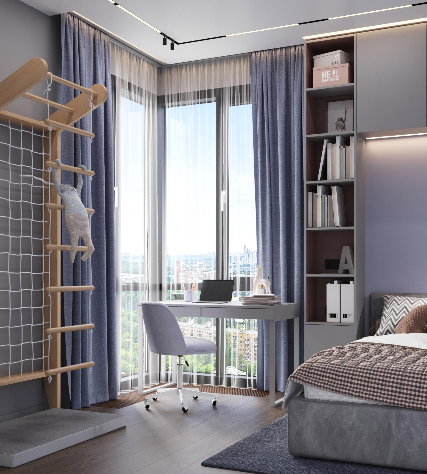 Проект в ЖК «Фили сити», г. Москва. Квартира для семьи с двумя детьми. Детская площадью 10,6 м² в светлых нейтральных тонах для ребенка шести лет. Обои из коллекции «Childhood Space». Влюбленным в космос она открывает завесу галактических тайн и приглашает в увлекательное