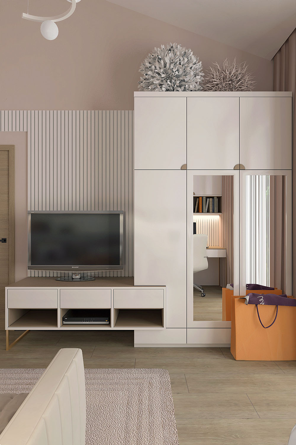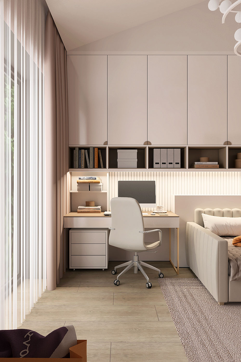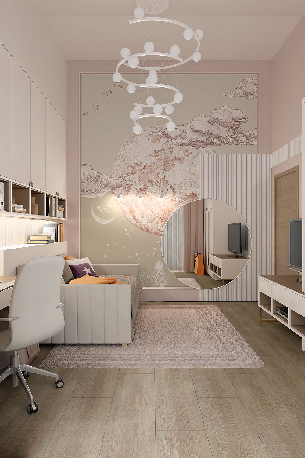 Детская для девочки дошкольного возраста в частном доме, г. Смоленск. Площадь комнаты — 15 м². Заказчики — семейная пара с двумя детьми. Пожеланиями были цветовая гамма в пыльно-розовых и серо-бежевых оттенках, стиль — неоклассика, спокойное, не загруженное мебелью пространство для отдыха, игр и подготовки к учебе.