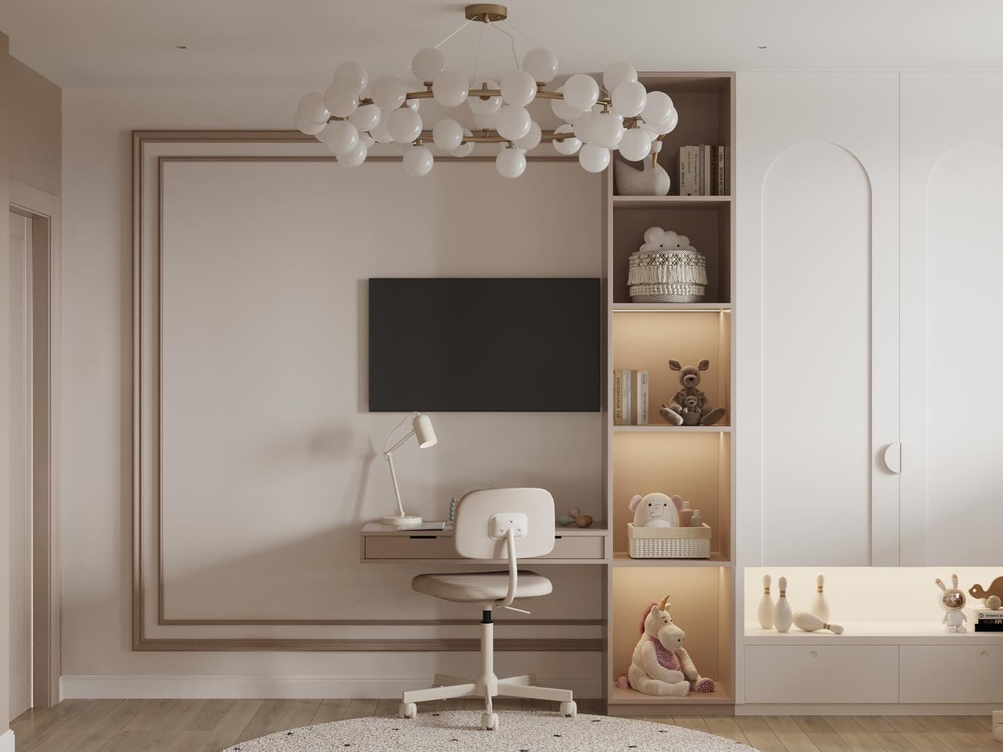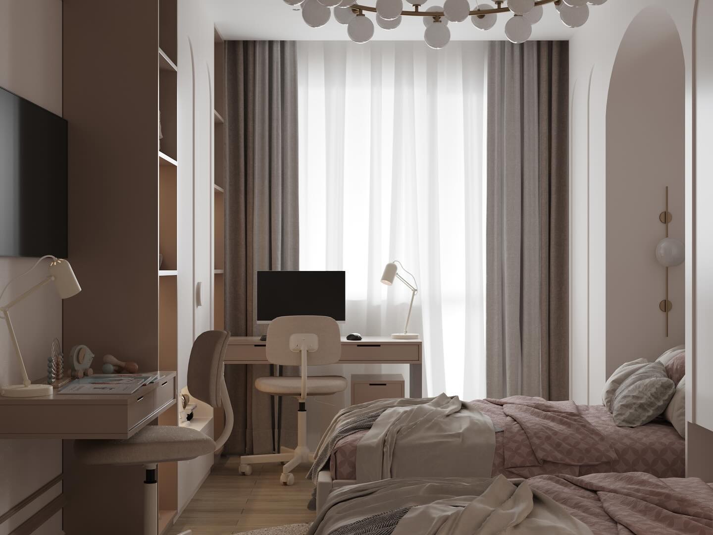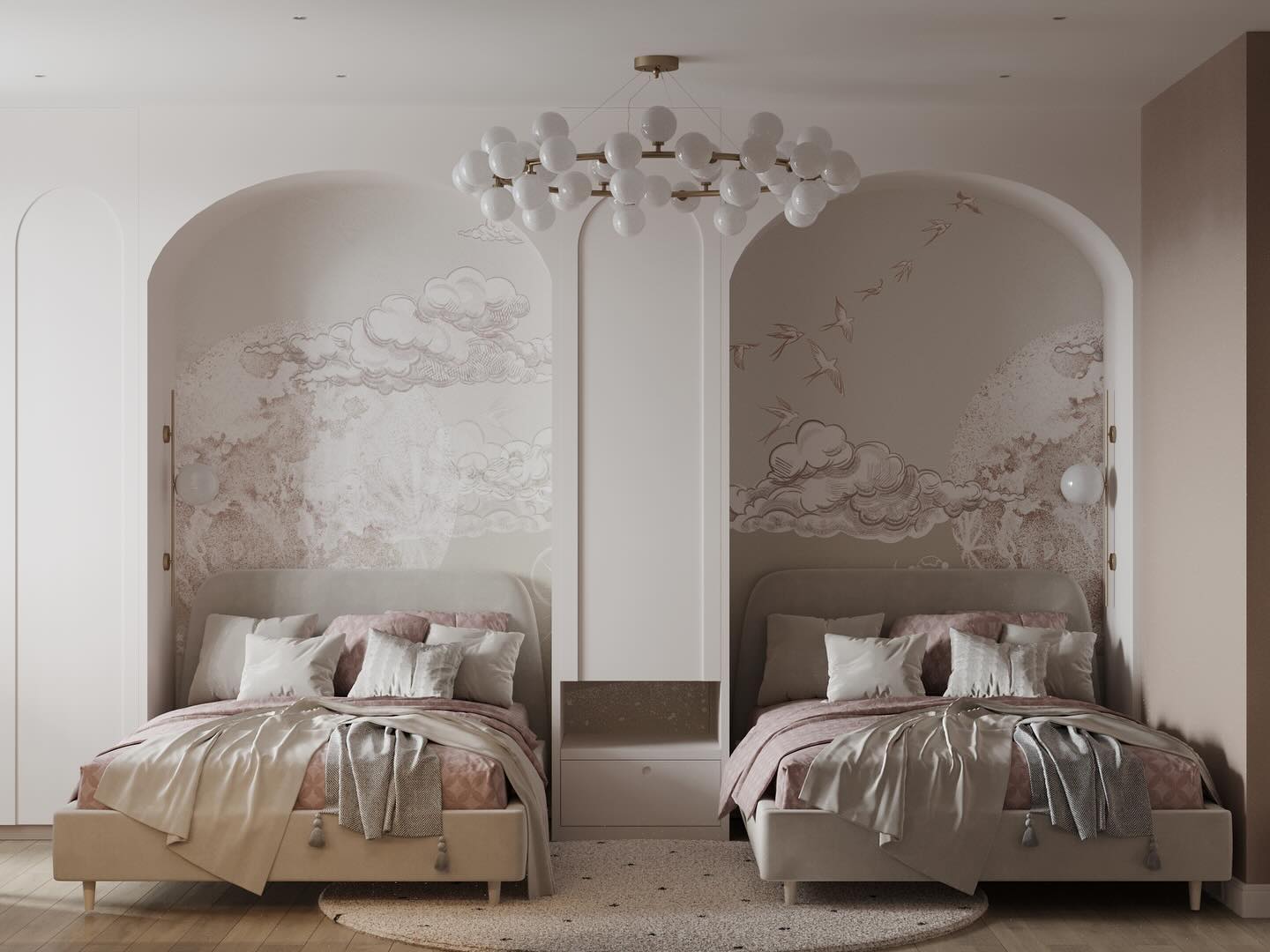 Комната двух для девочек из проекта квартиры в Горячем ключе. Обои из коллекции COSMOS. Коллекция делает комнату современной, стильной и подчеркивает индивидуальность хозяек.