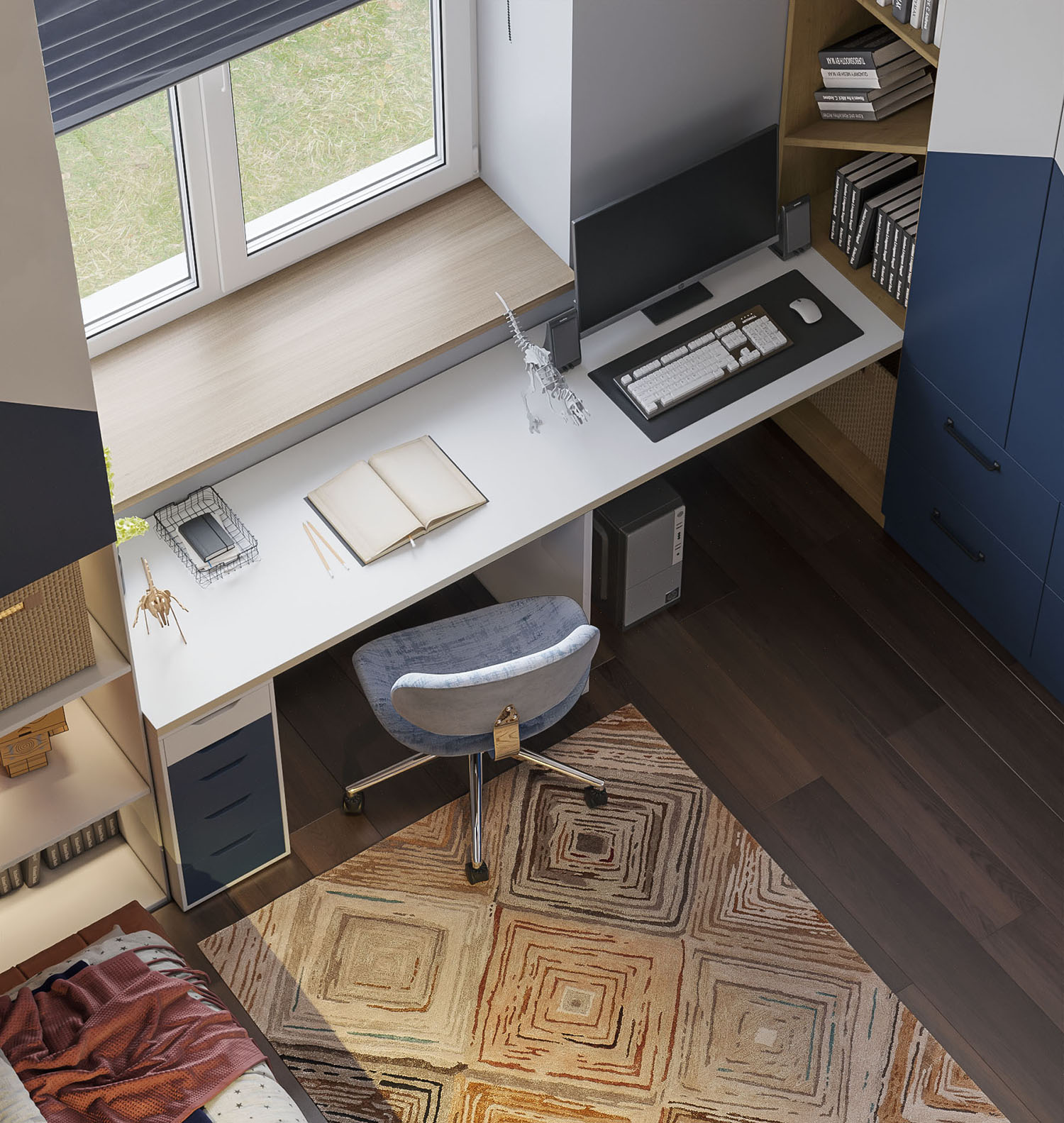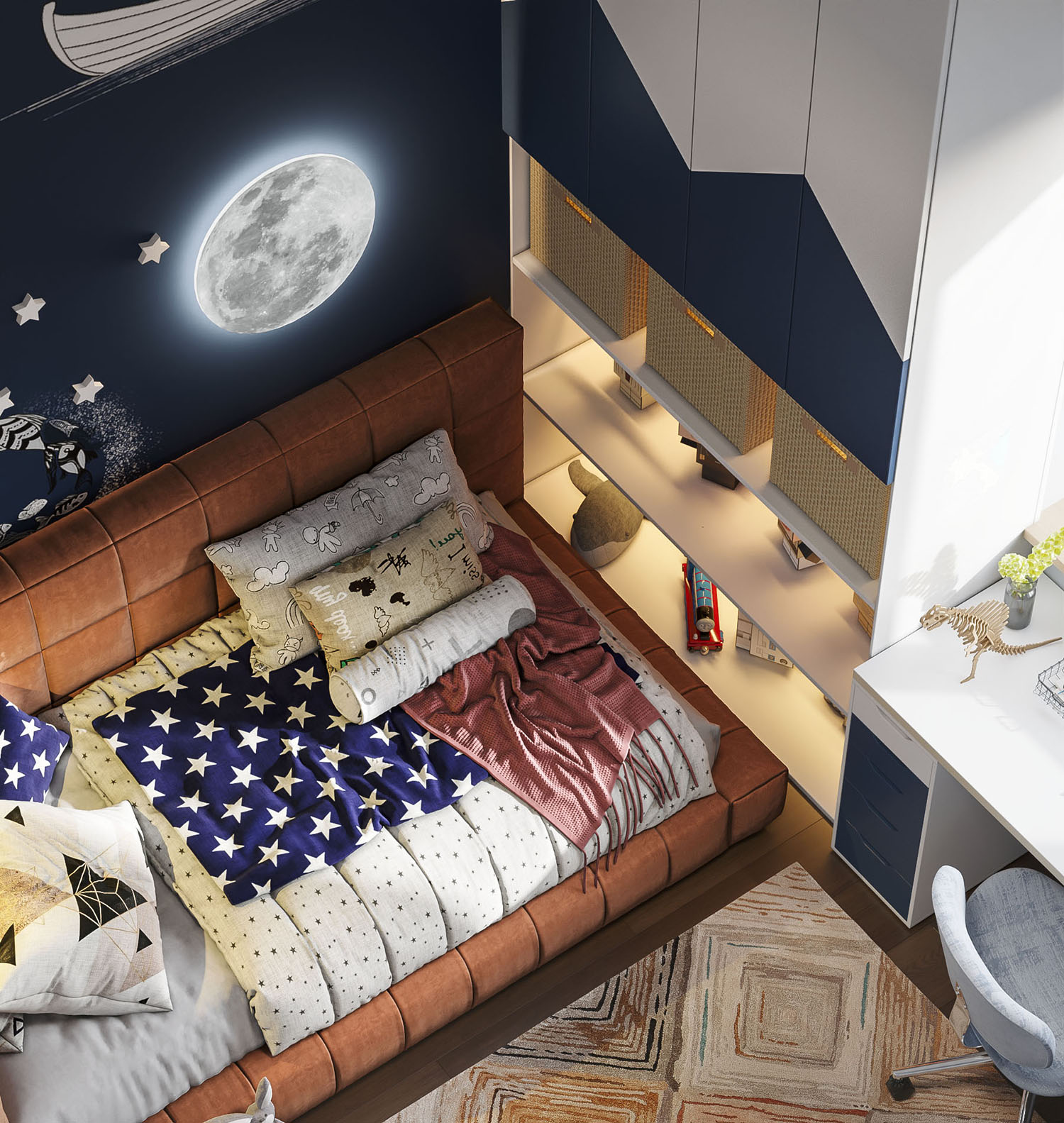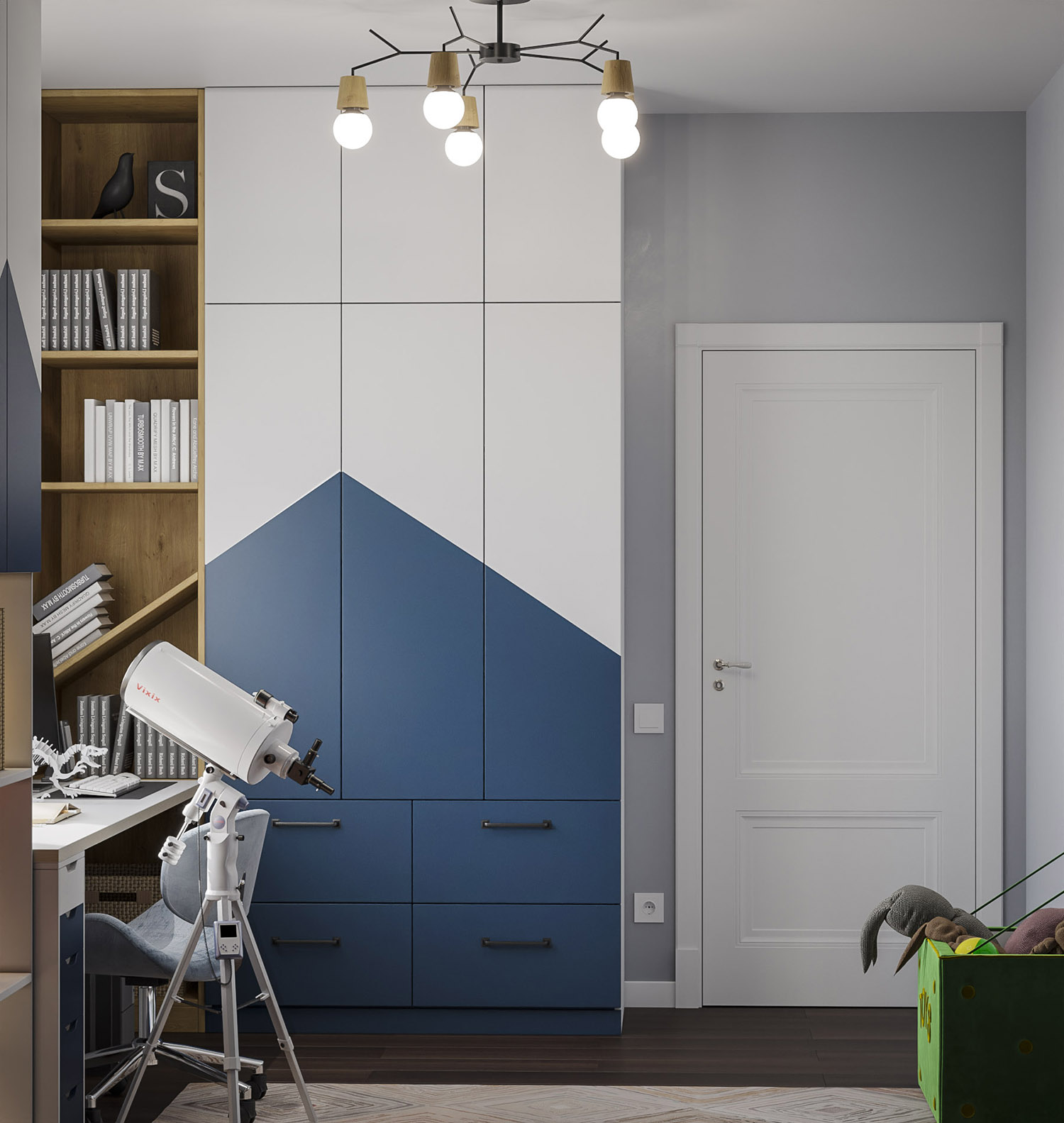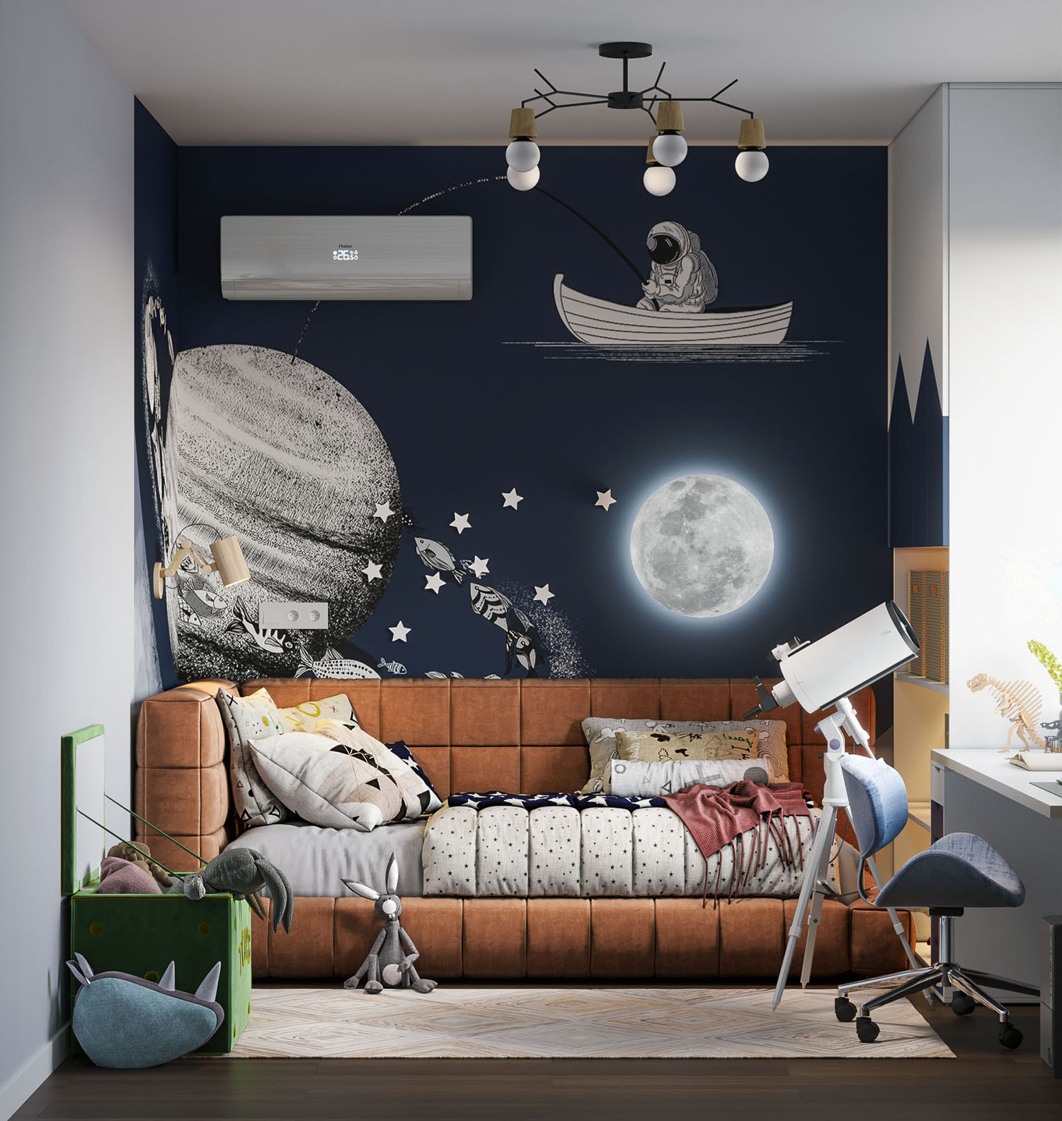 Детская комната для мальчика площадью 12,4 м². Фреска из коллекции Cosmos. Заказчики — молодая активная семья. Главным пожеланием был классный современный интерьер с трендовыми фишками.