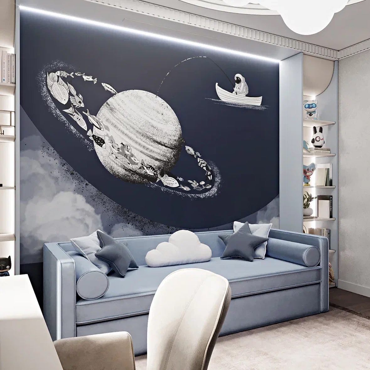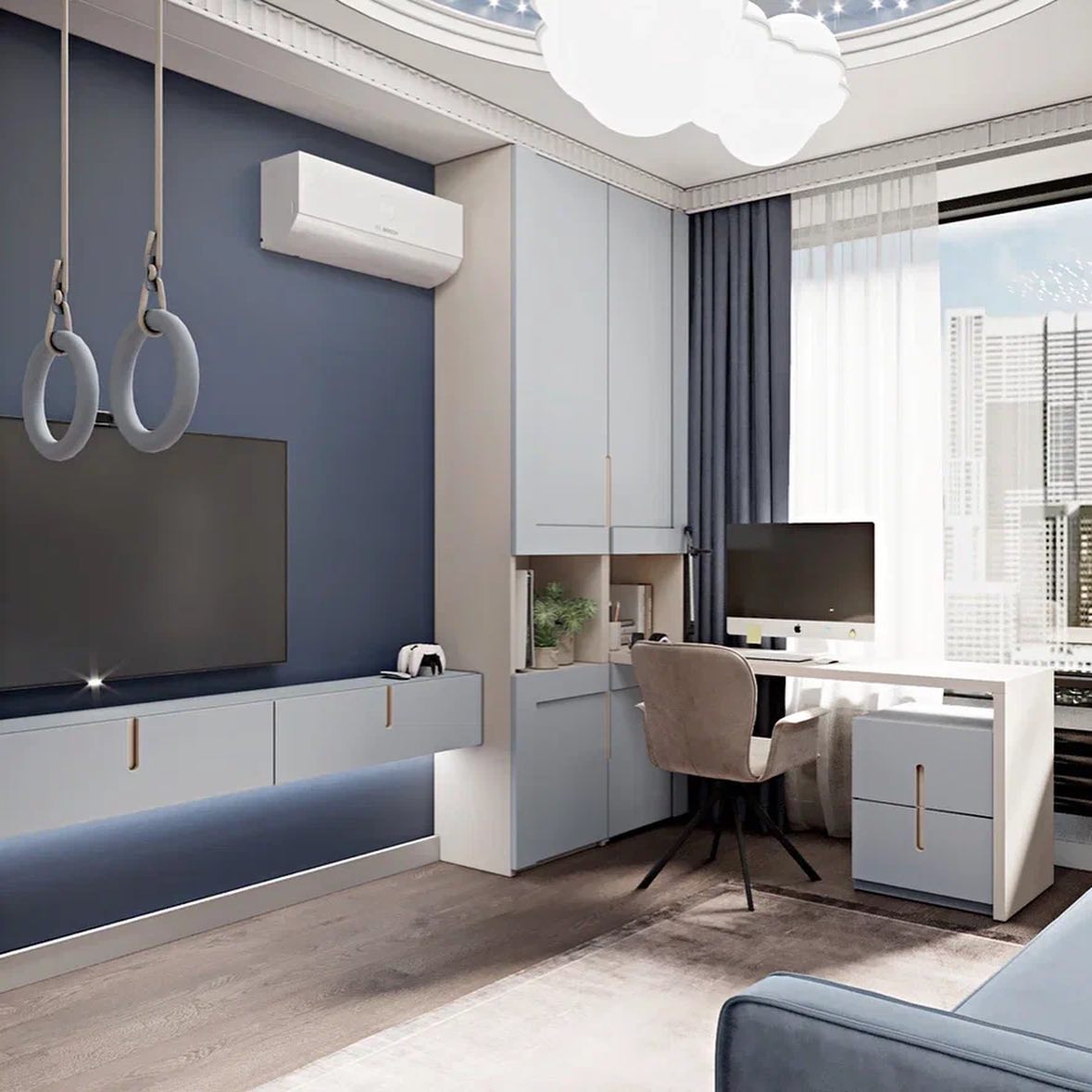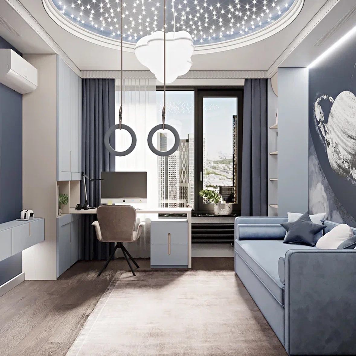 Детская комната для мальчика в сдержанной цветовой гамме. Функциональное пространство с зоной для физической активности и рабочим местом у окна. Обои из коллекции COSMOS и звездное небо на потолке поддержали космическую тему — главное увлечение юноши.