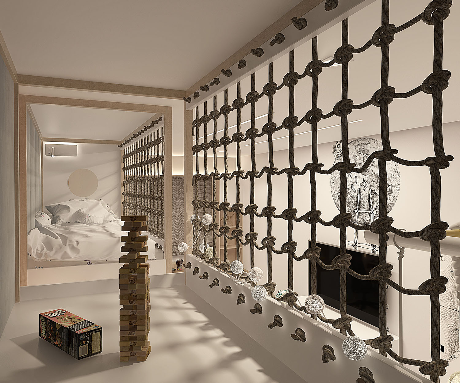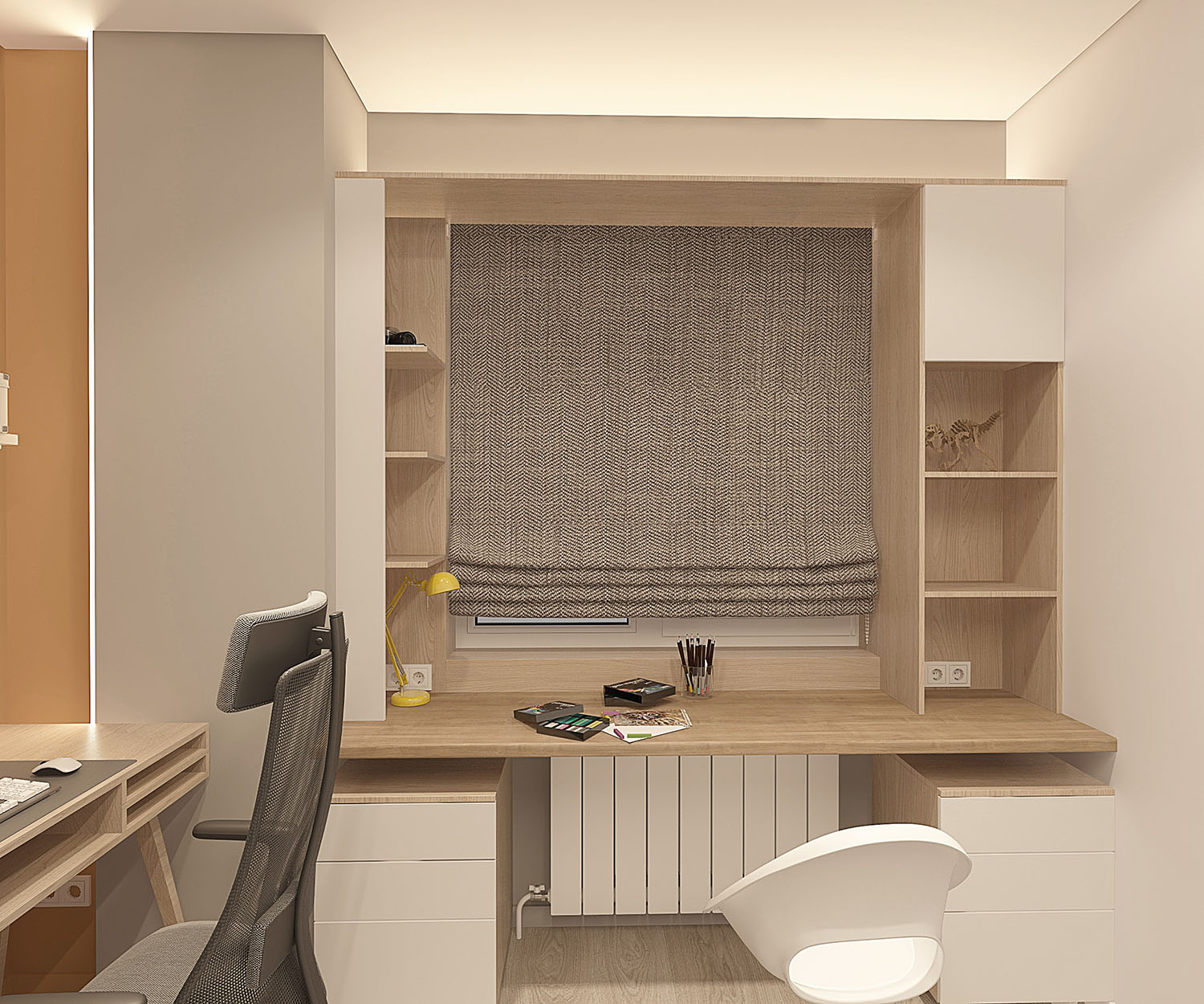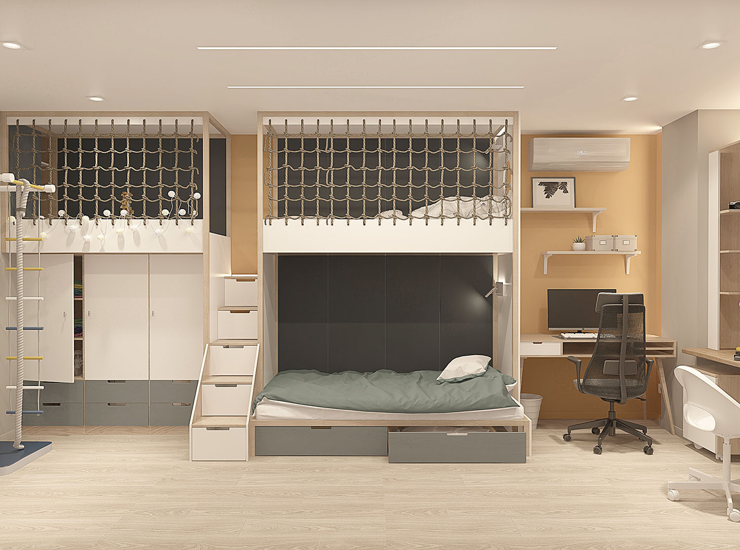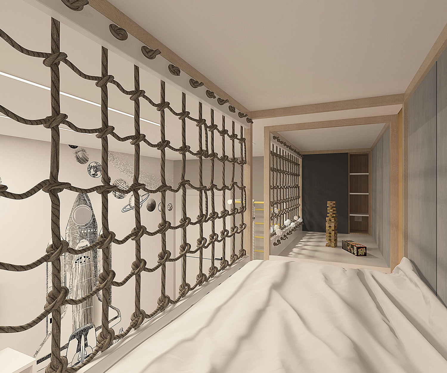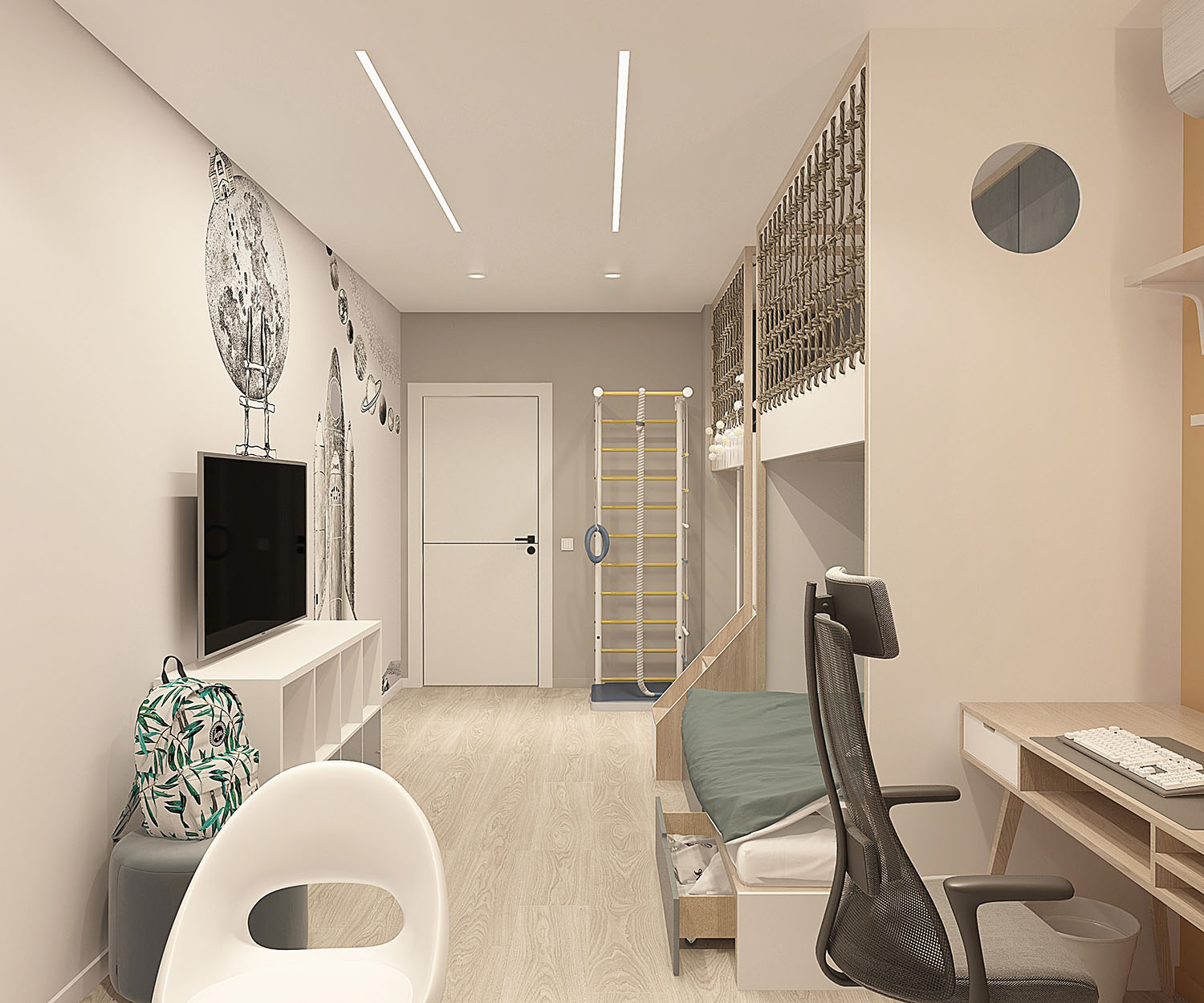 Нижний ярус кровати шириной 120 см — для старшего мальчика, а верхние, более узкие — для младших братьев. На момент разработки проекта третий ребенок был совсем малыш, поэтому в зоне над шкафами ярус без спального места исполняет роль форта. На стенах мягкие панели для шумоизоляции и безопасности. Ступени с выдвижными ящиками для хранения одежды или игрушек. Два рабочих места тоже не случайно: маме хотелось отделить зону учёбы от зоны ПК.