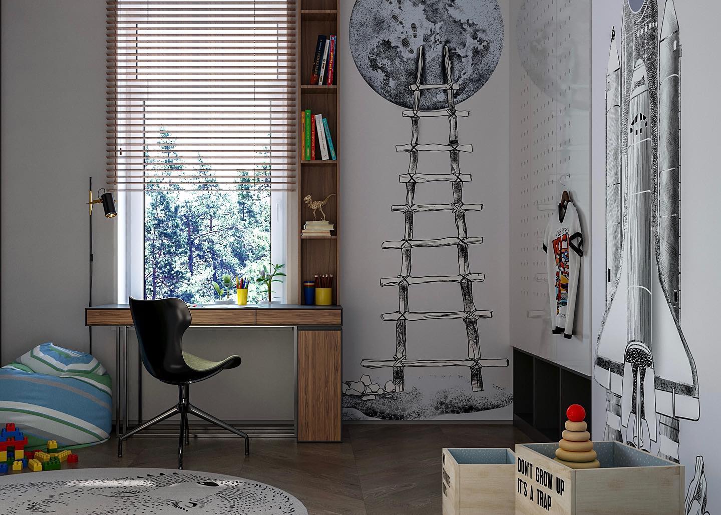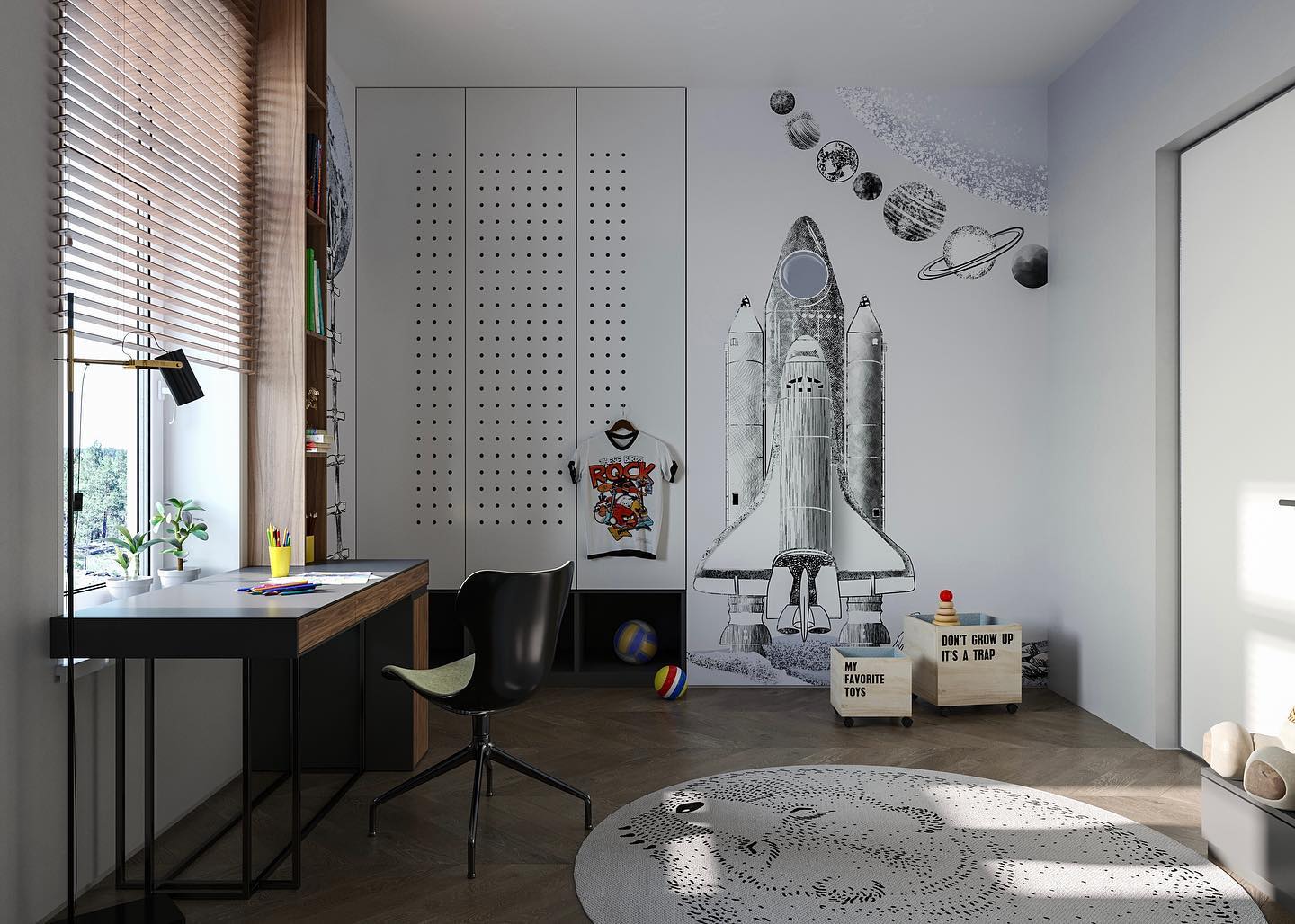 Комната для школьника-мальчишки. Пространство функциональное, познавательное и уютное. Несмотря на то, что основные цвета — белый и серый, интерьер не кажется холодным и аскетичным. Он живет. Невозможно даже предположить, что в такой детской может вырасти человек без вкуса, цели и мыслей. Интерьер воспитывает всегда и меняет человека.
