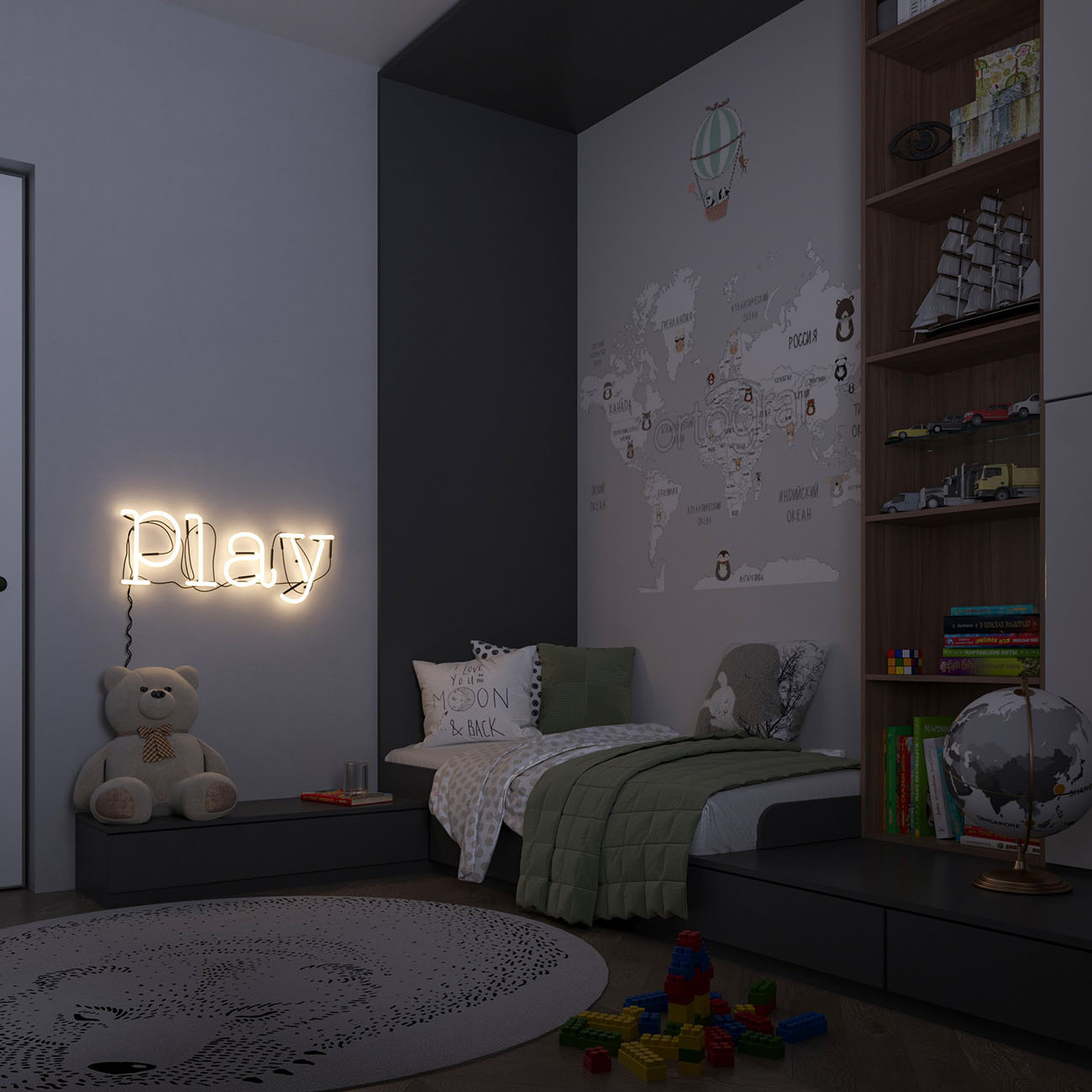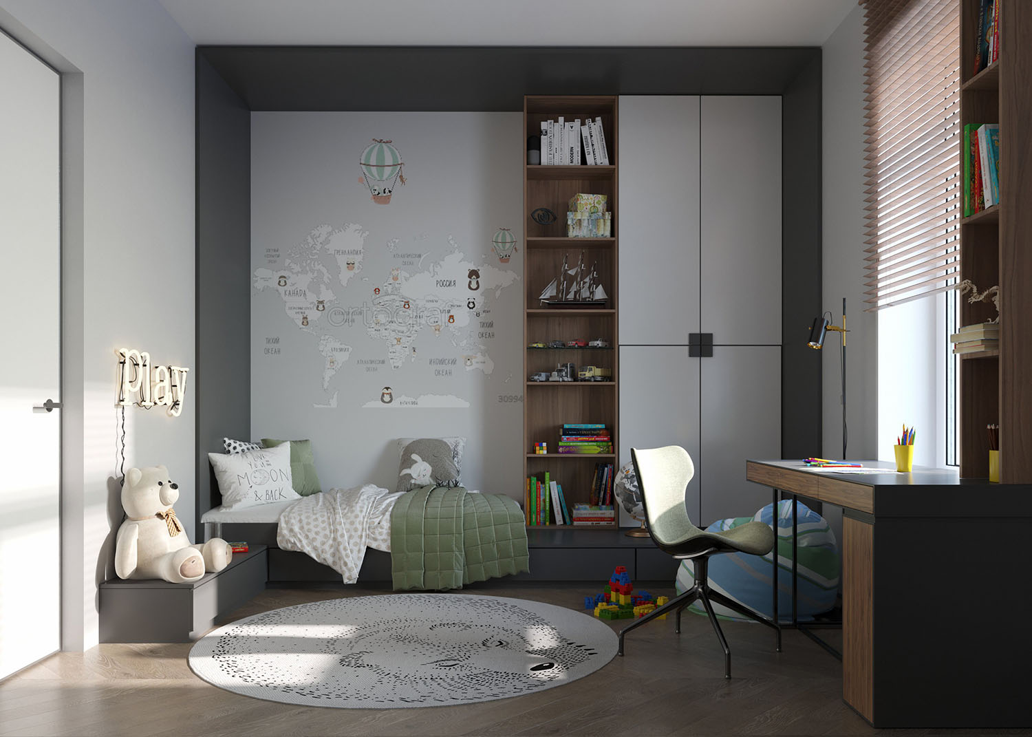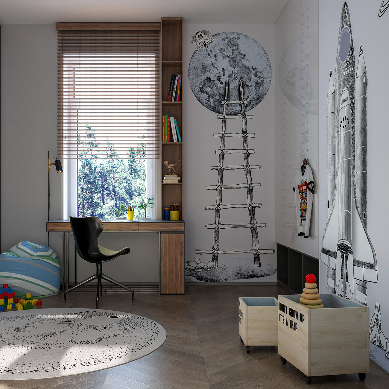 Проект интерьера всего дома был выполнен для молодой семьи в стиле минимализм. Комната для сына получилась функциональной, уютной и познавательной. Несмотря на то, что основные цвета белый и серый, интерьер не кажется холодным и аскетичным. Он живёт. Невозможно поверить, что в таком интерьере может вырасти человек без вкуса, цели и мыслей. Интерьер воспитывает и меняет человека. У ребенка «космическая» фамилия, поэтому не было вариантов выбрать другую тему.