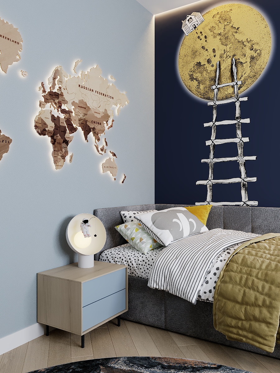 Дизайн детской комнаты в частном доме для мальчика 6 лет. Обои из коллекции «Cosmos». Коллекция настолько многогранна, что вмещает и мультяшных котиков, уснувших на полумесяце, и графичные ракеты, и далекие космические миры с чудесными планетами, парящими в воздухе китами и яркими звездами. Все это будто отражает наши сны.