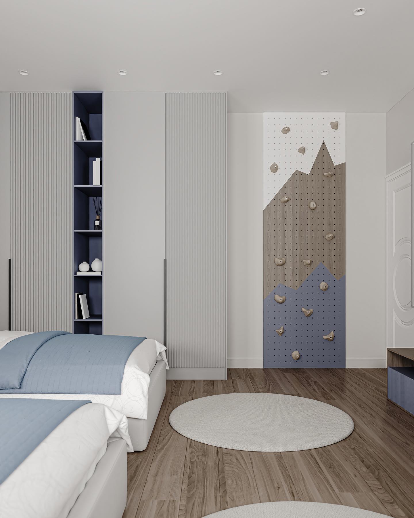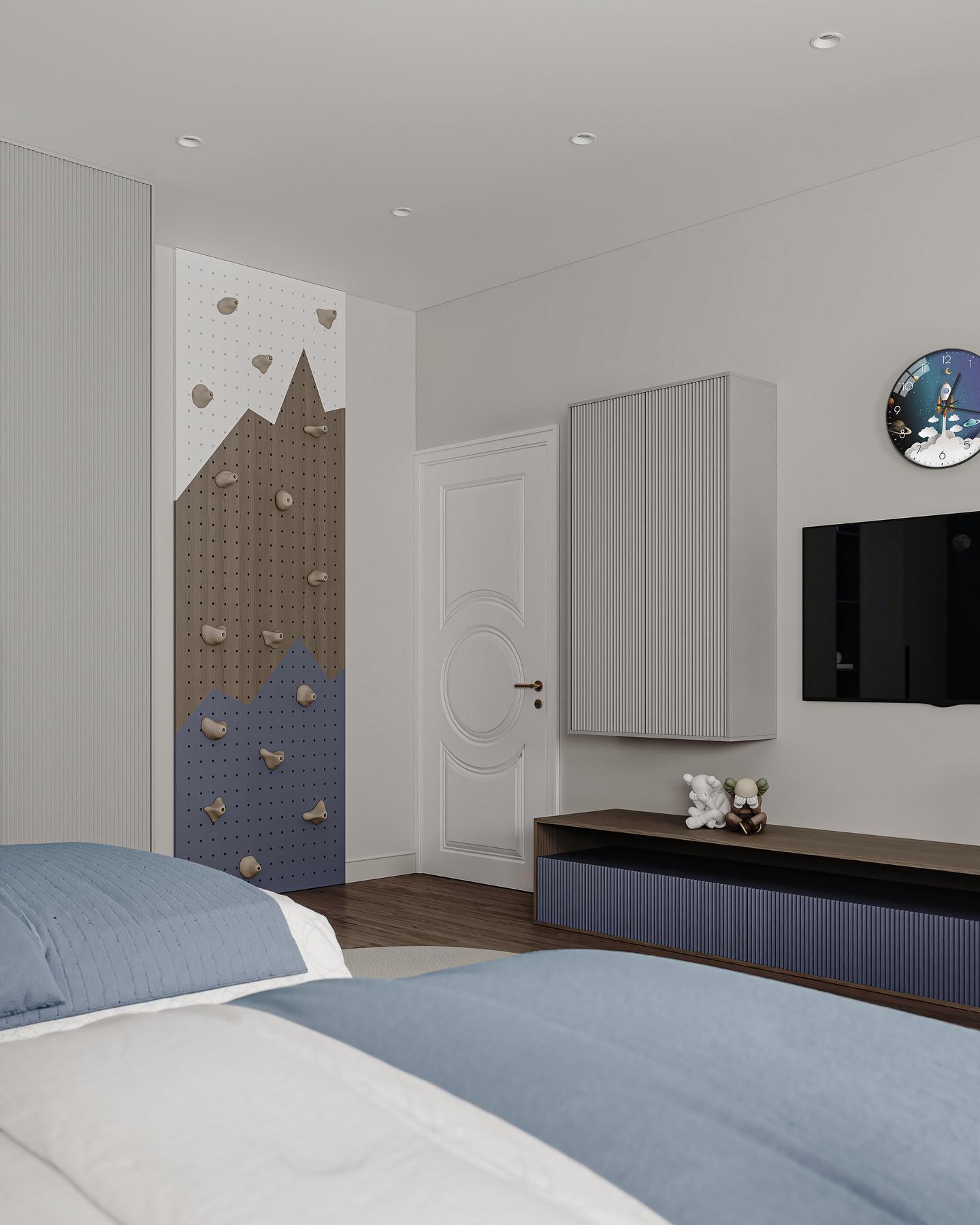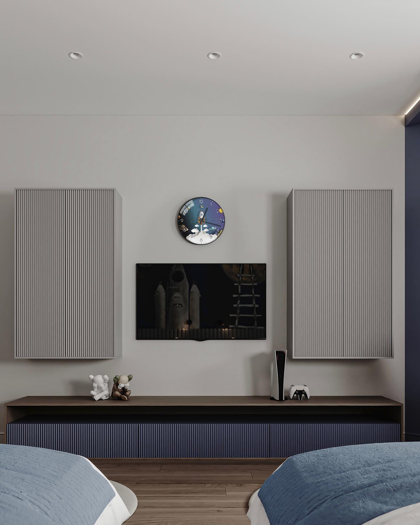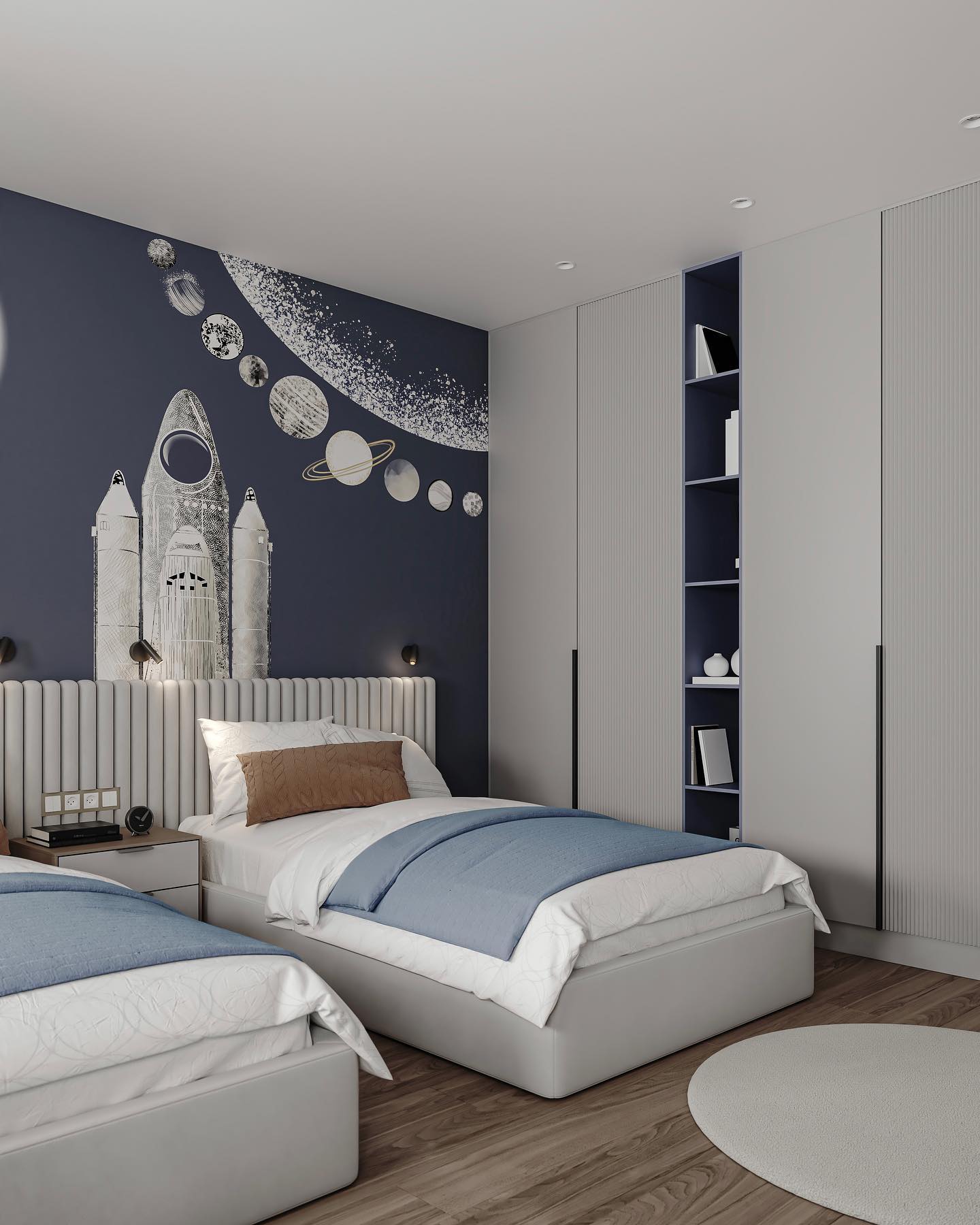 Детская комната для двух мальчишек. Обои из коллекции COSMOS. Коллекция настолько многогранна, что вмещает и мультяшных котиков, уснувших на полумесяце, и графичные ракеты, и далекие космические миры с чудесными планетами, парящими в воздухе китами и яркими звездами. Все это будто отражает наши сны.