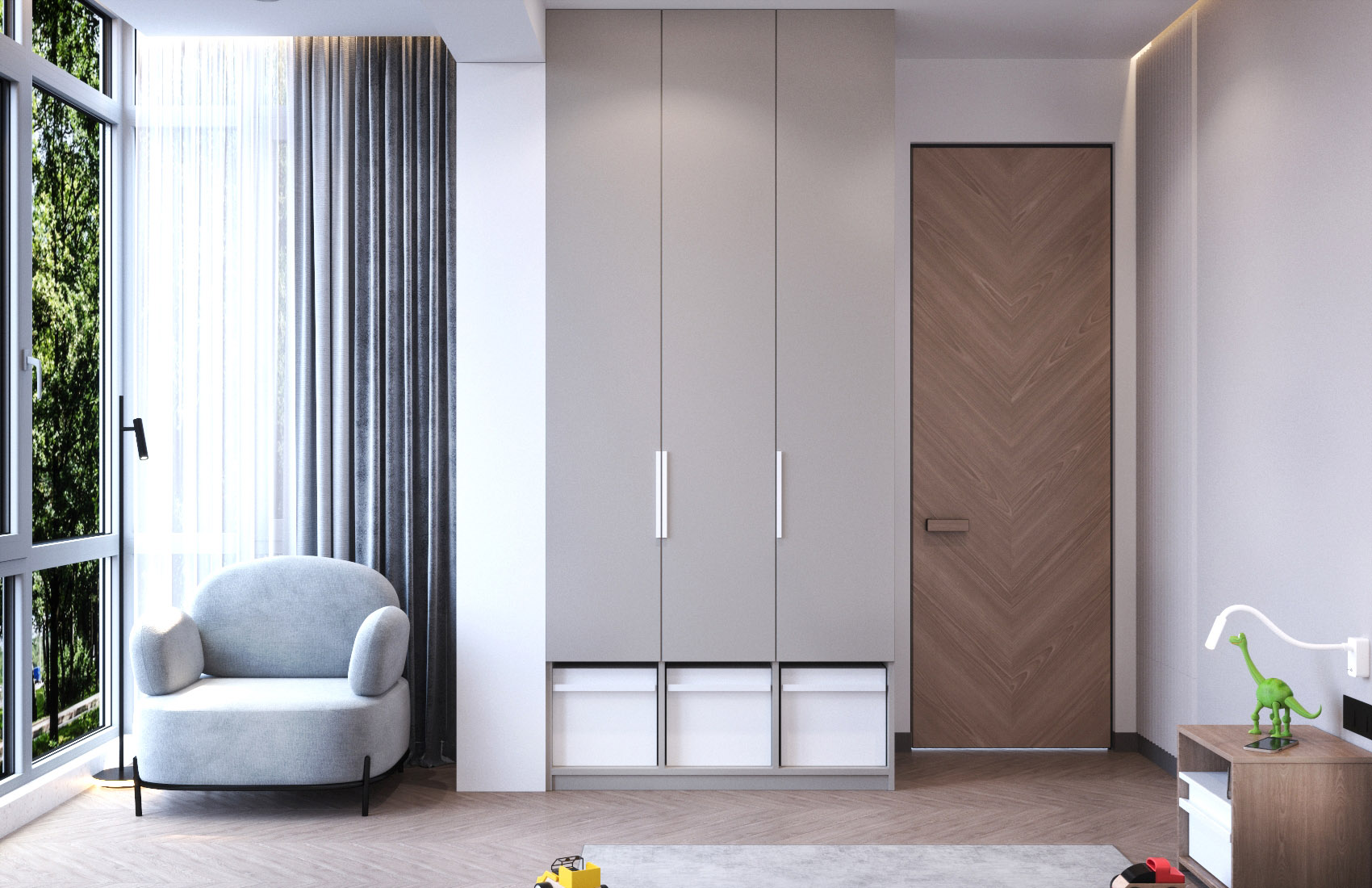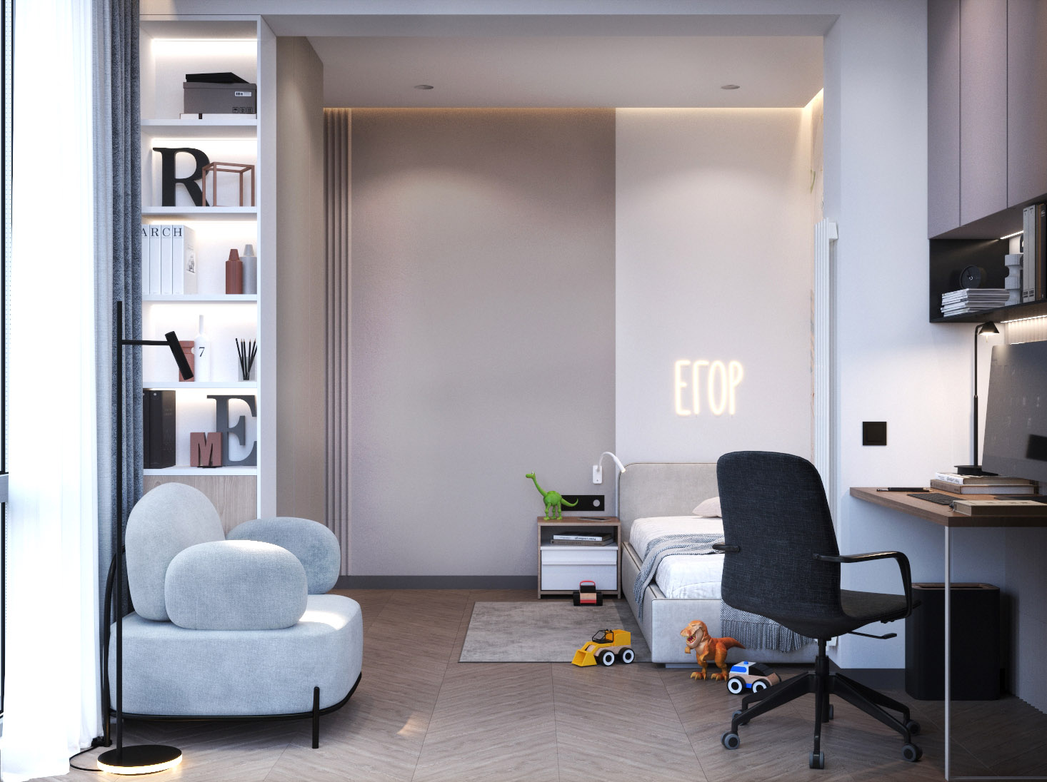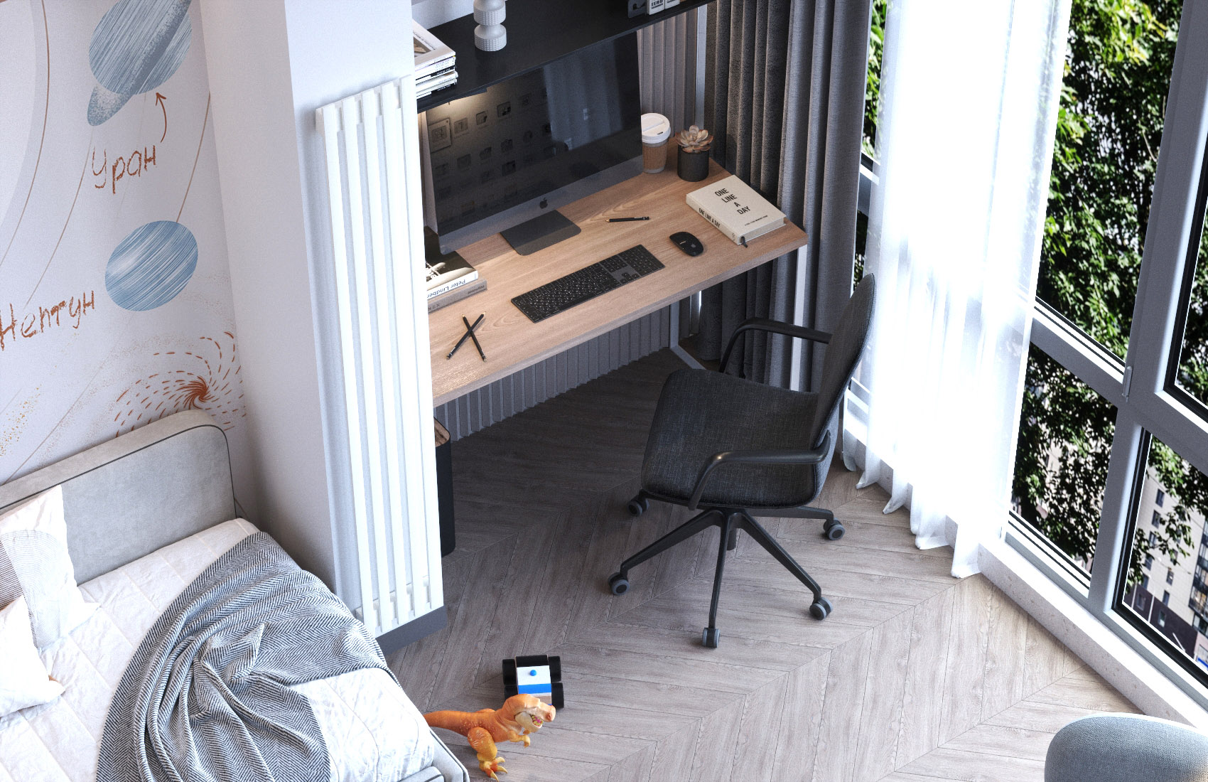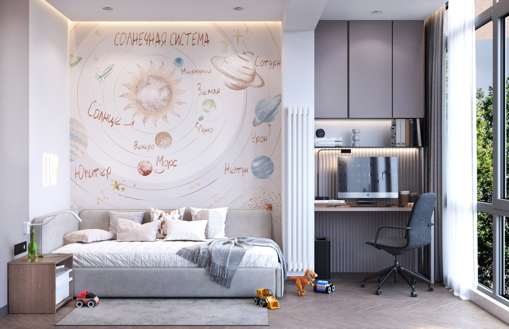 Интерьер этой комнаты для мальчика украсили обои из коллекции «Cosmos». Помимо волшебных миров, коллекция предлагает вполне реалистичные картины Солнечной системы. Это позволяет не только украсить комнату, но и чему-то научиться, если речь идет об обоях для детской. Вы сможете сейчас быстро назвать пятую планету от Солнца? А с обоями КОСМОС сможете и вы, и ваш ребенок!