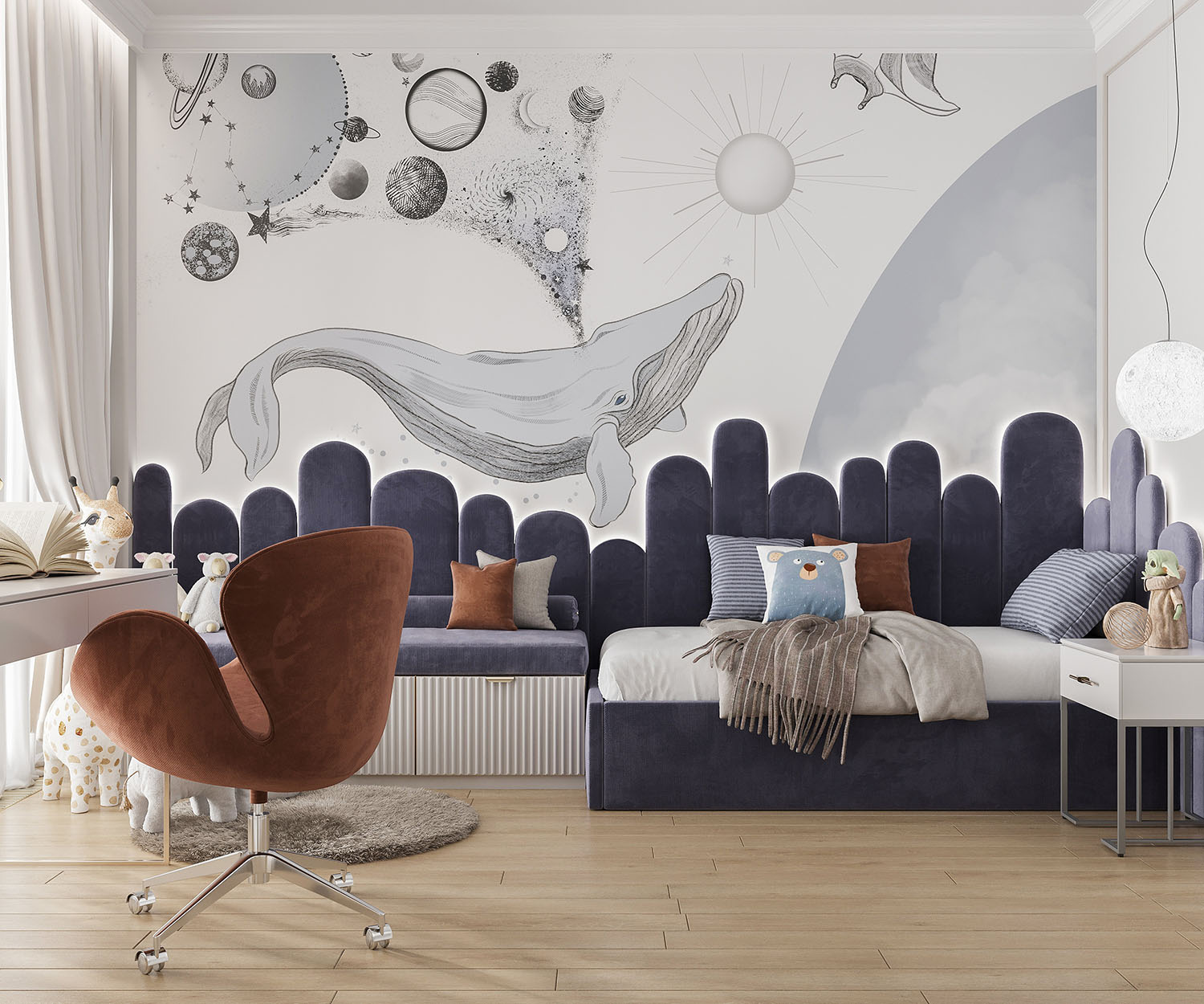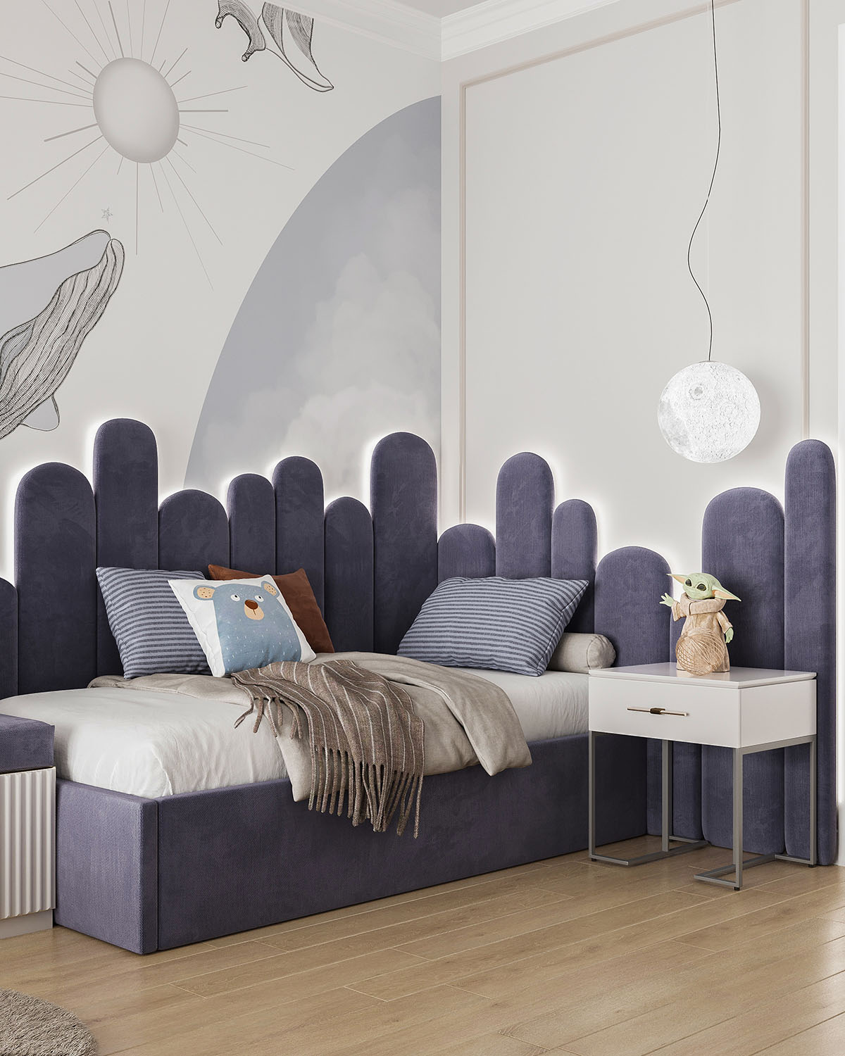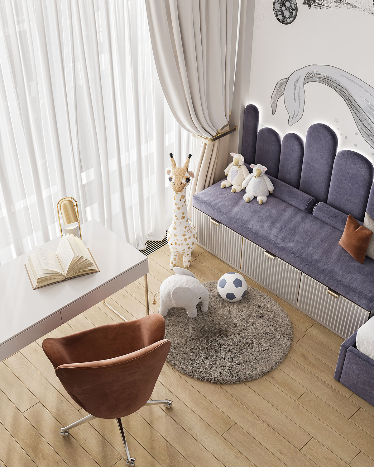 Детская комната из проекта квартиры для молодой пары с двумя детьми дошкольного возраста. Так как детишки примерно одного возраста, стояла задача спроектировать комнаты, похожие по планировке и наполнению, но в разных цветовых гаммах и с интересными индивидуальными деталями. С помощью обоев на одной из стен удалось добиться поставленной цели.