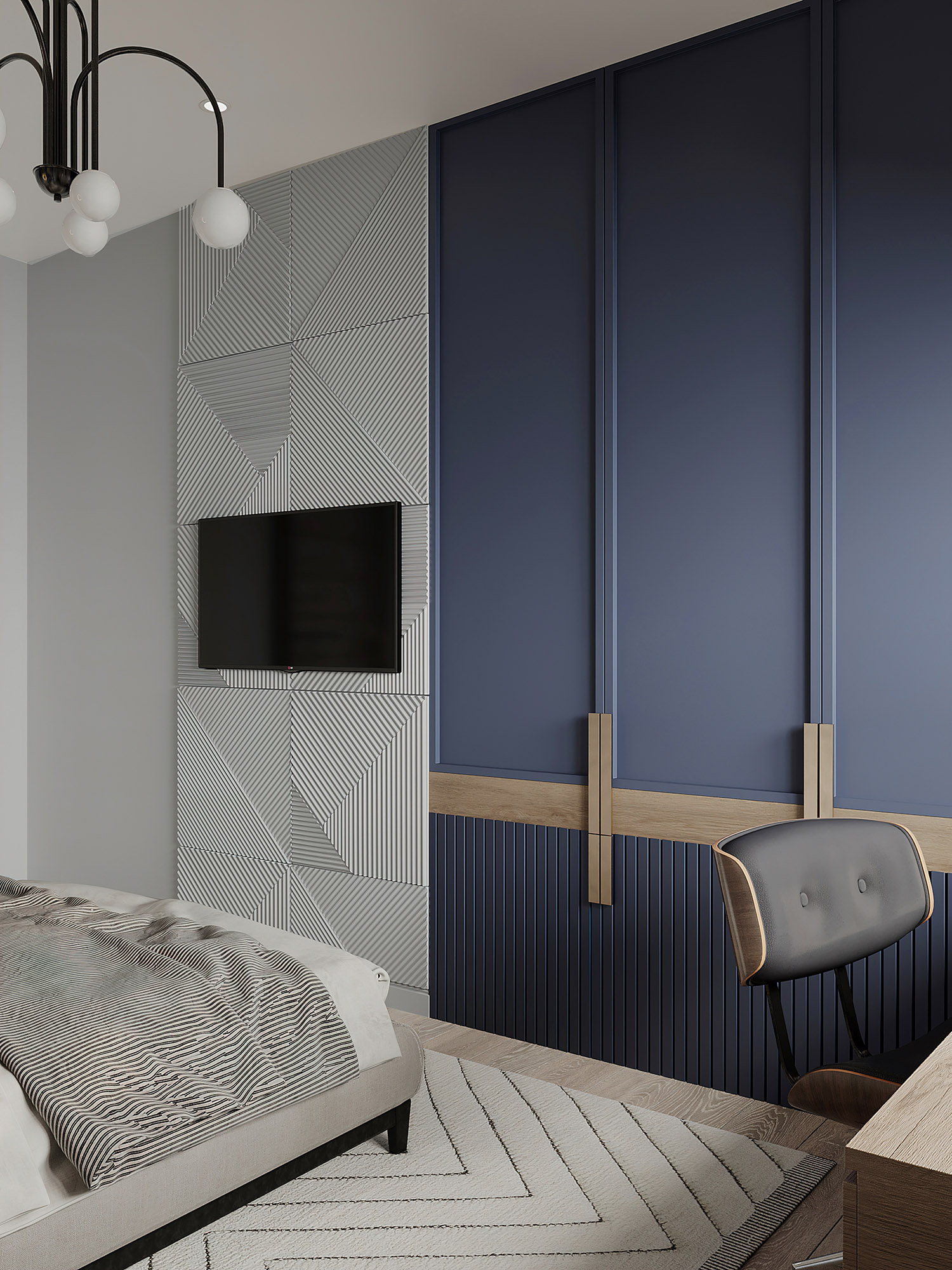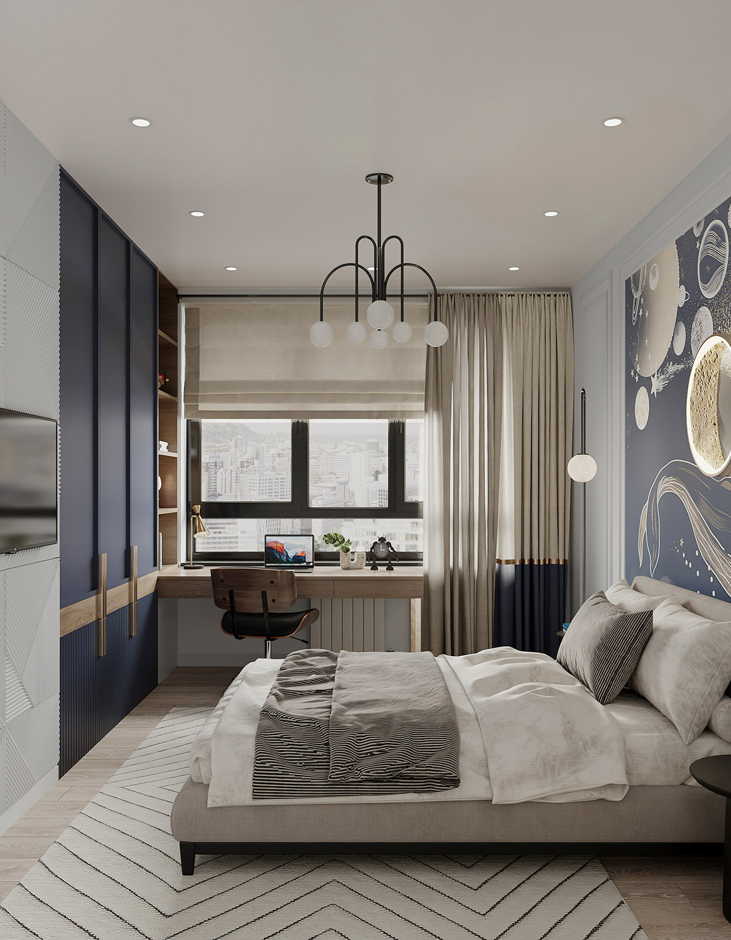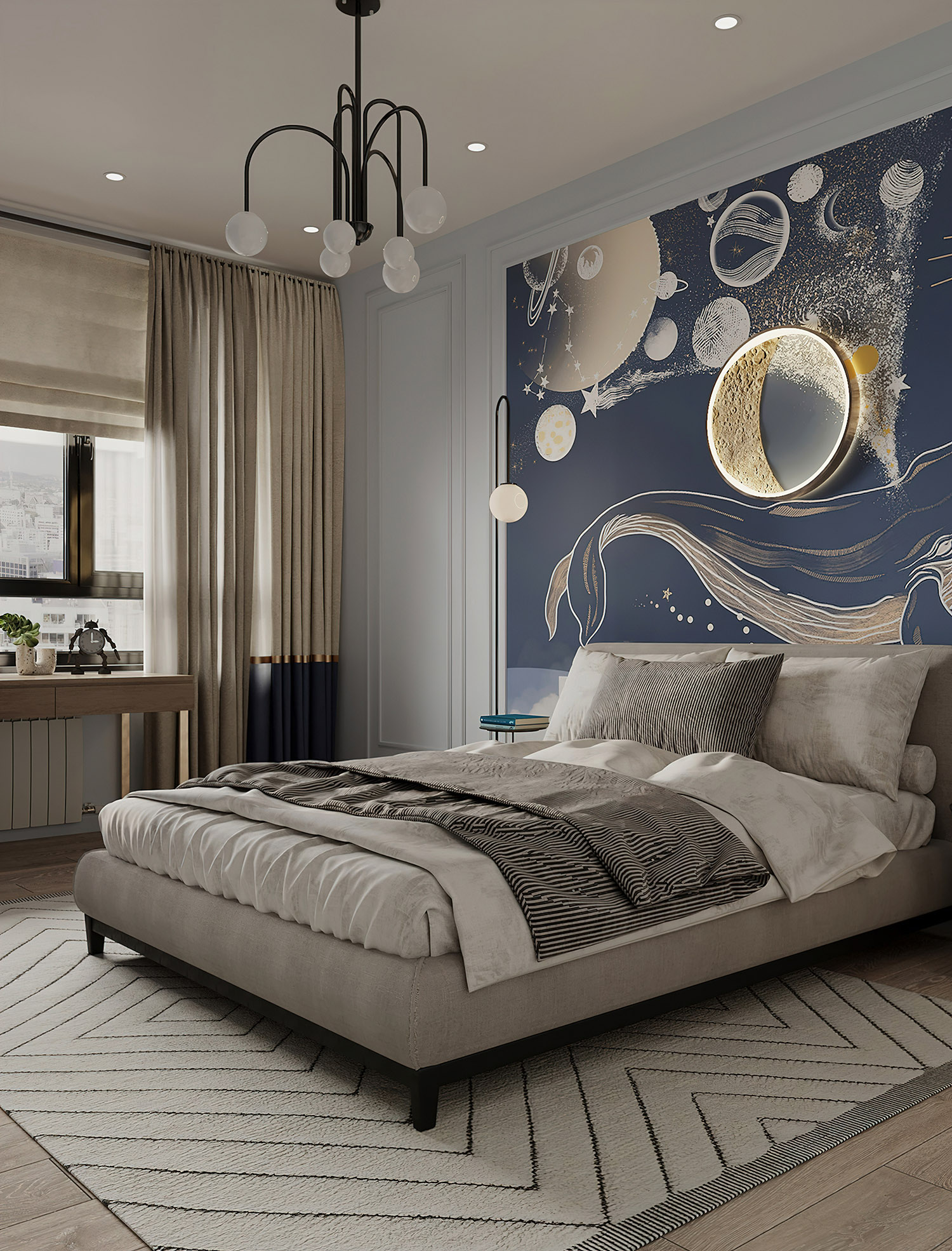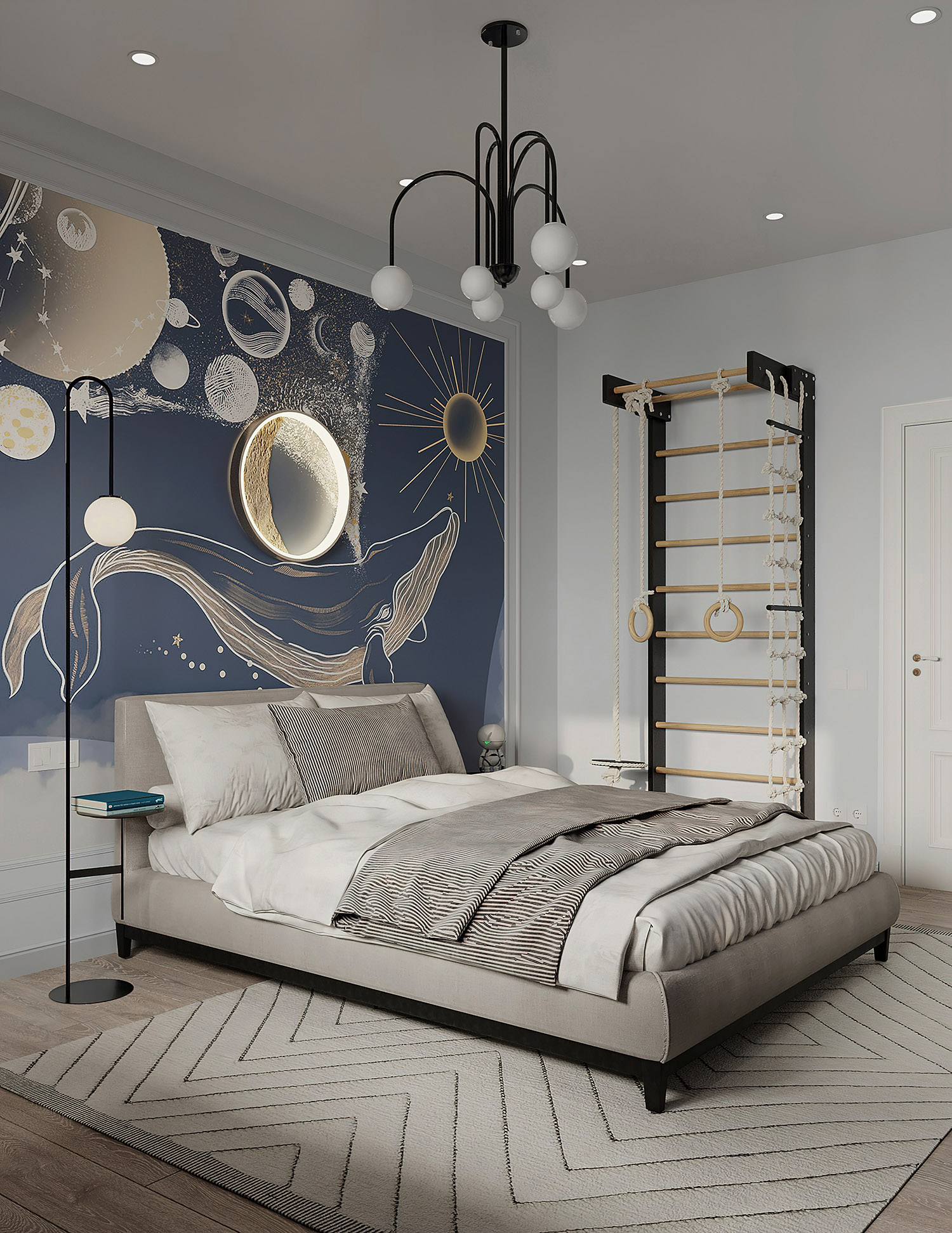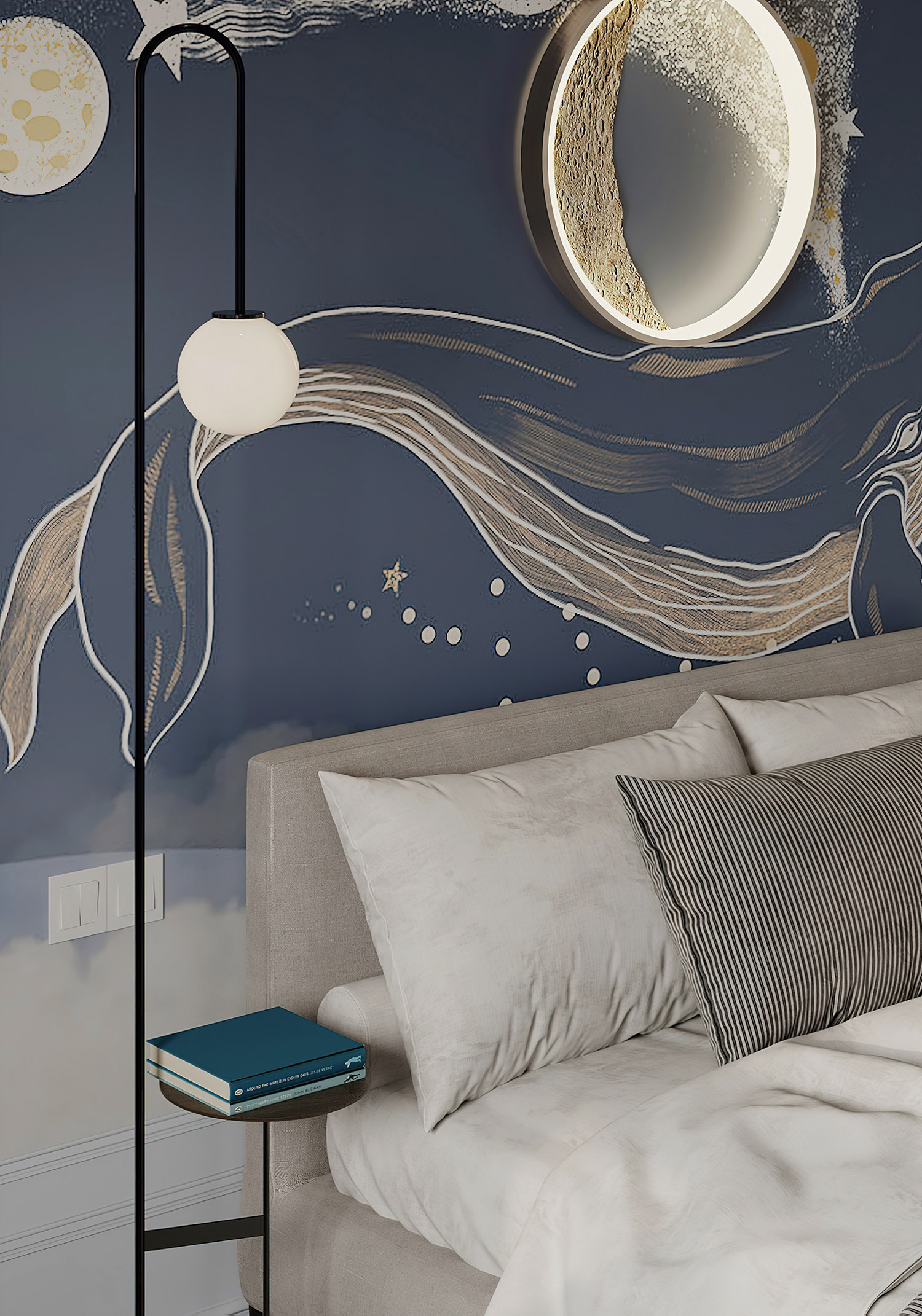 Кит в космосе — нереально красивый принт, и в данном проекте обои выступили больше как арт-объект, чем просто обои.