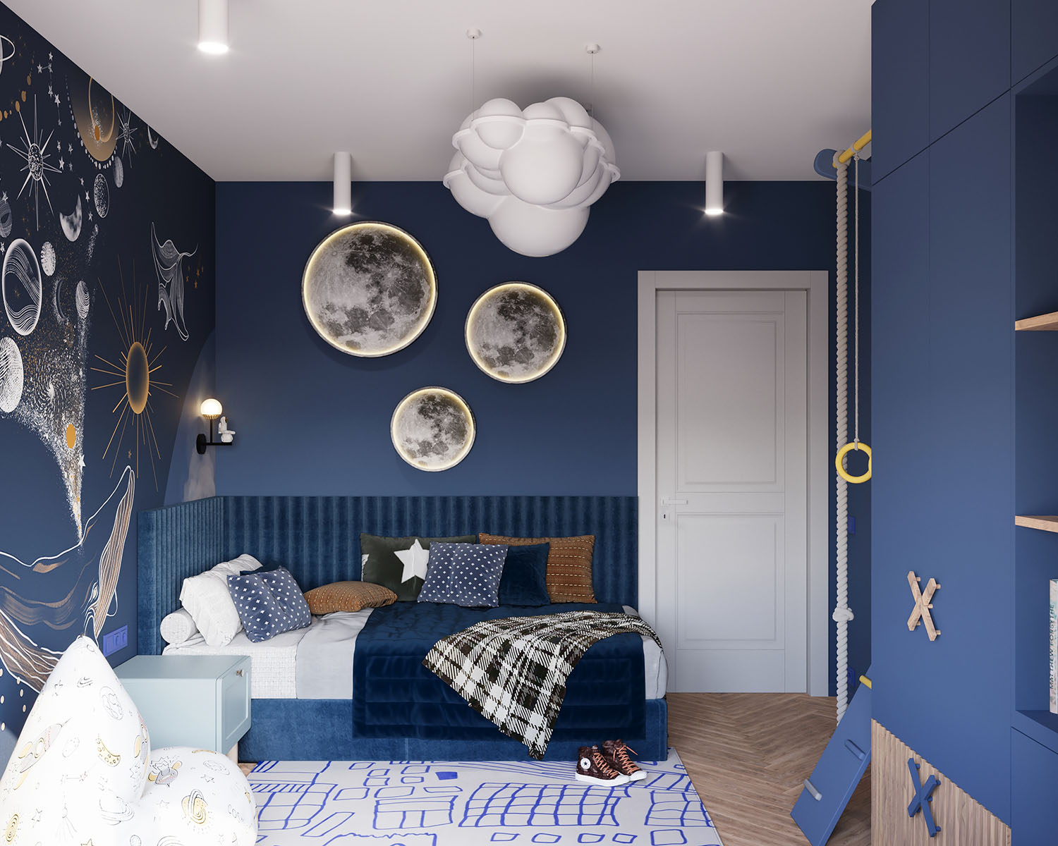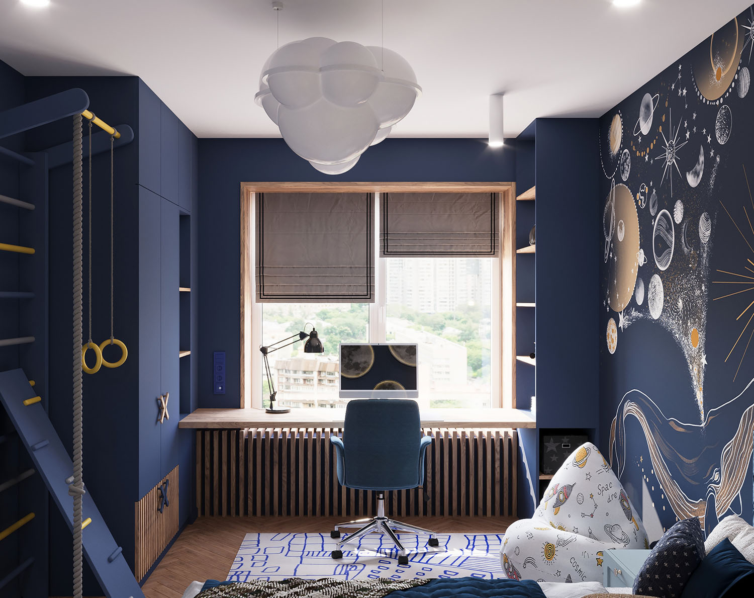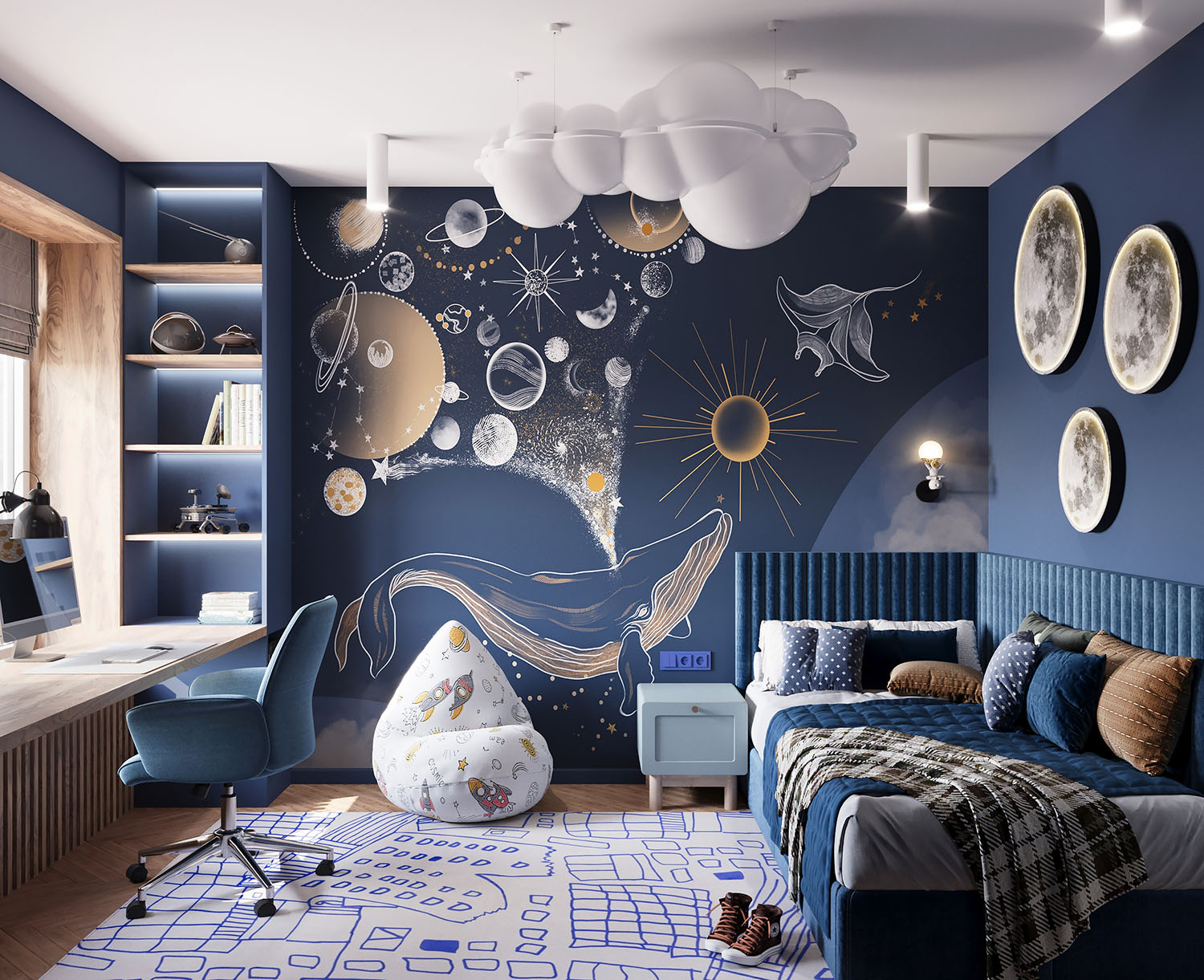 Детская комната площадью 11,7 м² для школьника в Москве. Обои из коллекции COSMOS. Мальчику очень нравится космос, поэтому все элементы и цветовую гамму выбрали соответствующую.