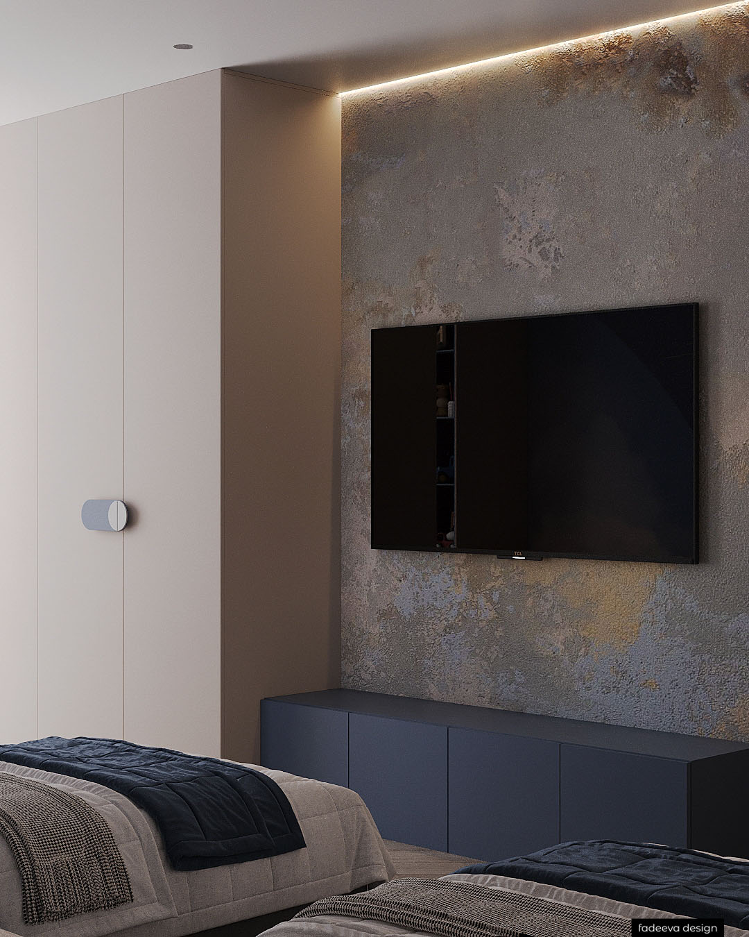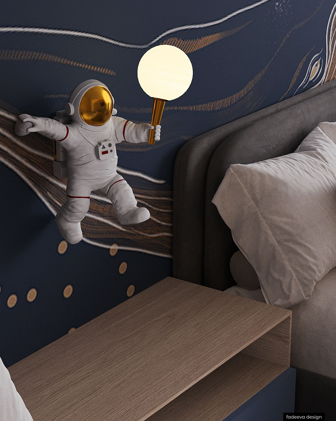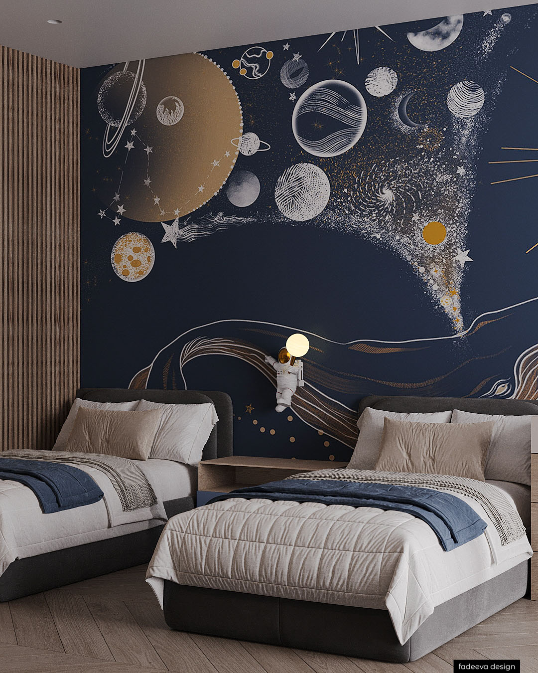 Проект детской комнаты, созданный для двух мальчиков, г. Владивосток. Увлечения ребят — море и космос. Вдохновением стали обои из коллекции COSMOS, которые отлично передали концепцию.