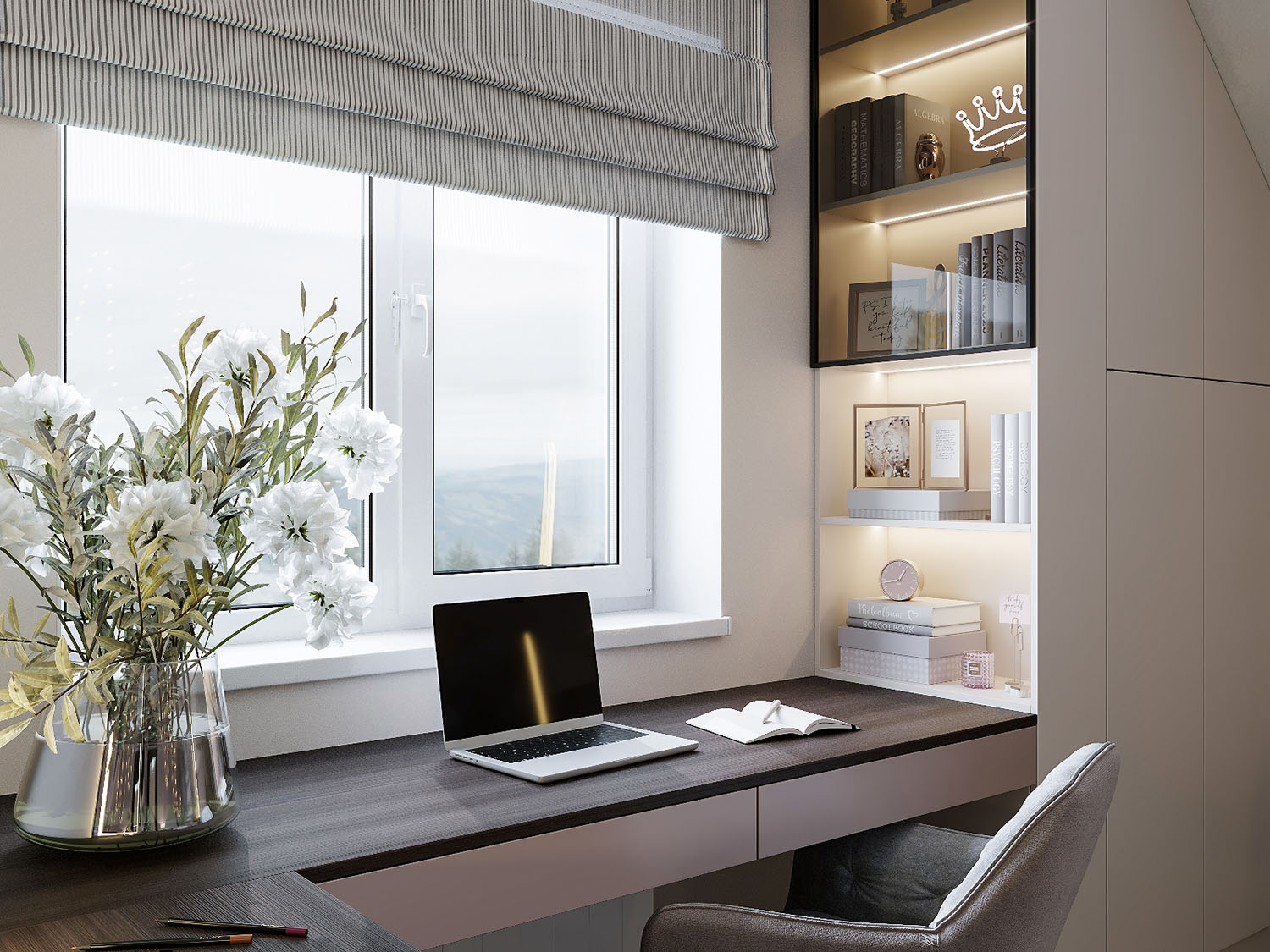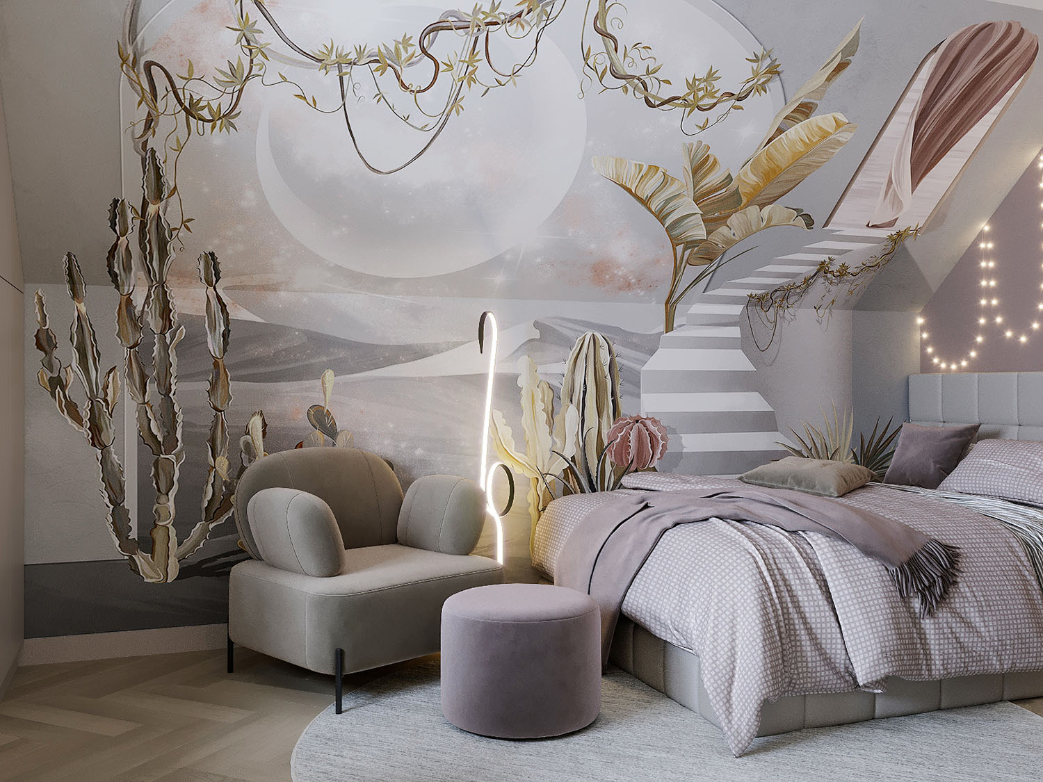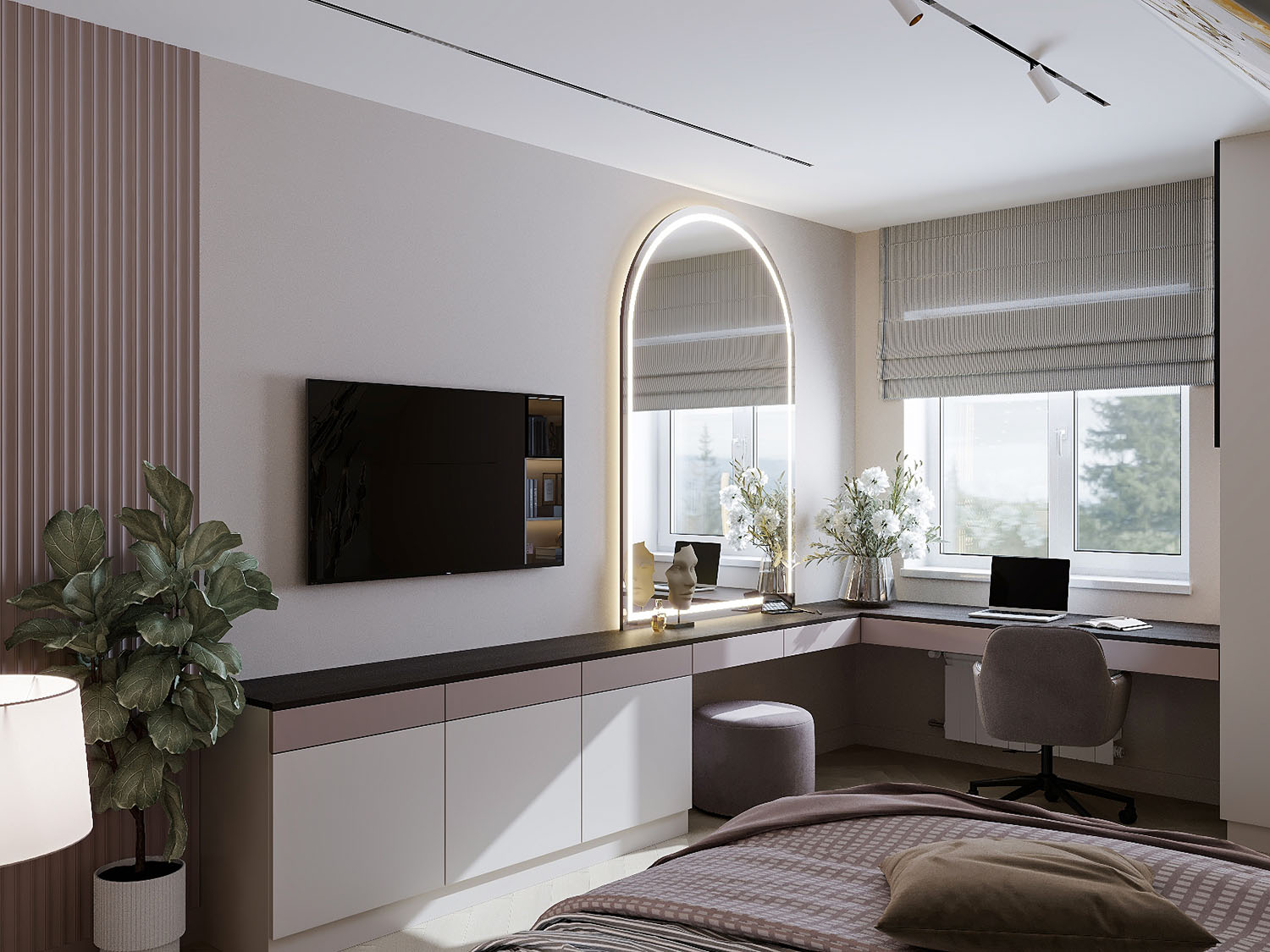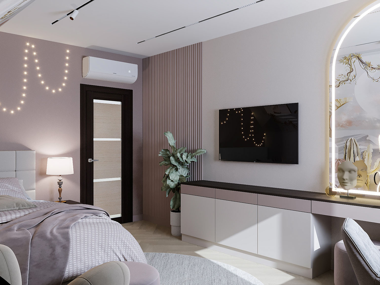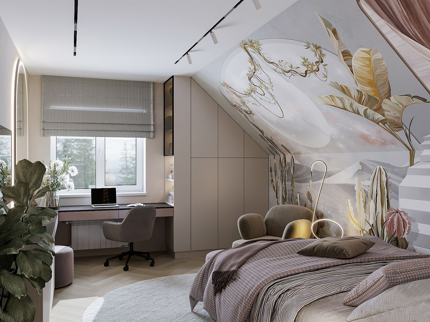 В этом проекте нужно было создать удобное и интересное пространство для творческой девушки, при этом сохранить существующие дверь, кровать и прикроватную тумбу.
