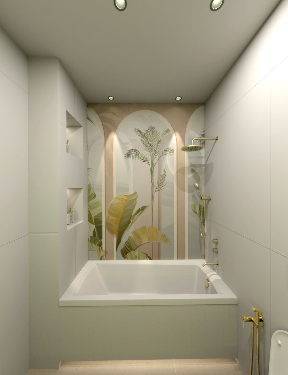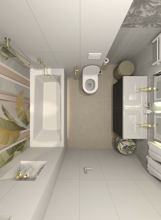 Дизайн ванной комнаты для двух принцесс: девочки-подростка и ее младшей сестры. Площадь помещения — 4,8 м². Заказчик просил максимально светлые спокойные тона интерьера в современном стиле.