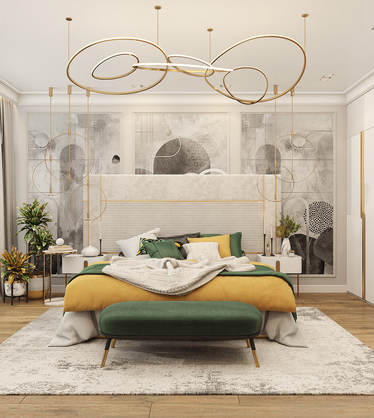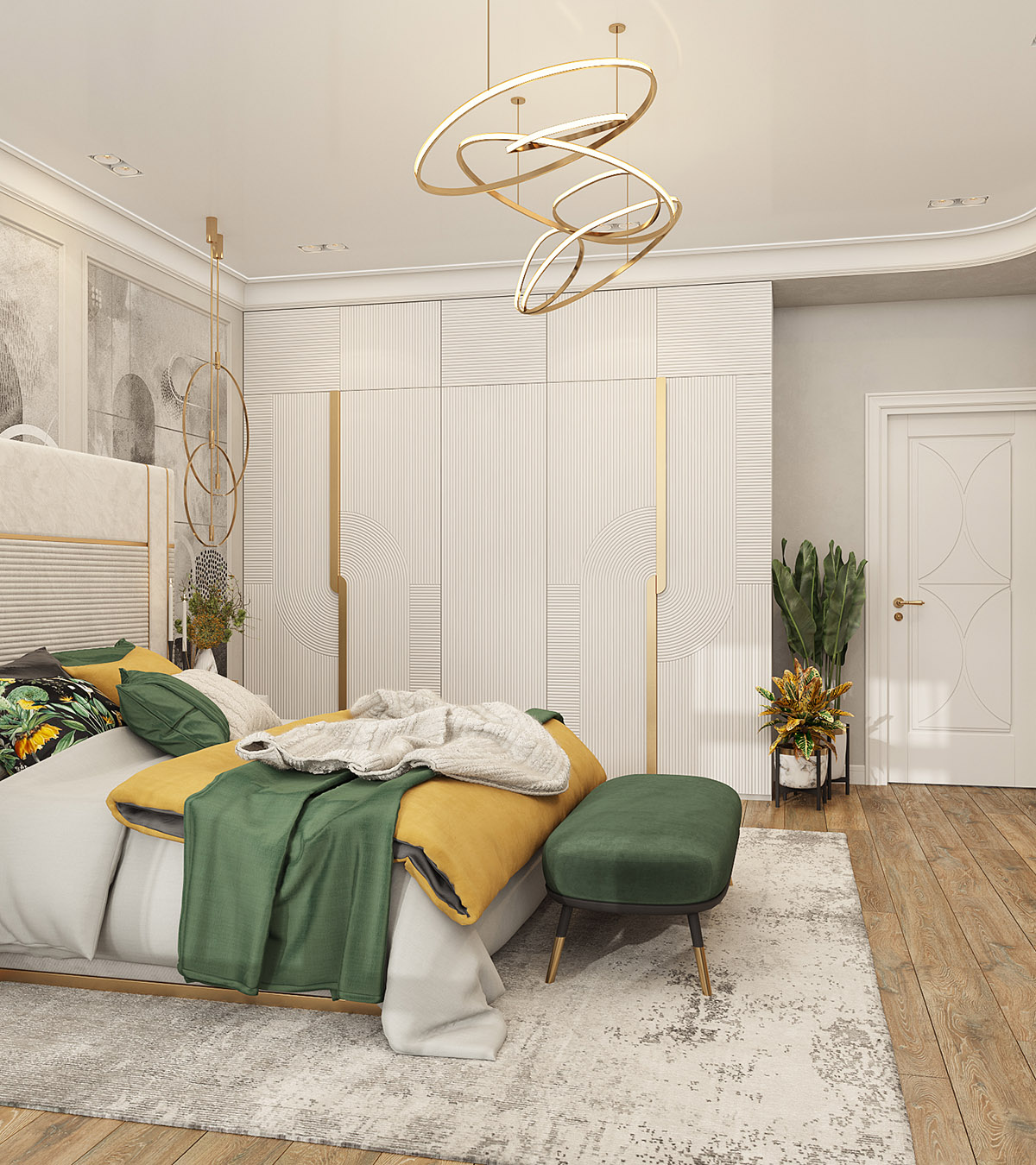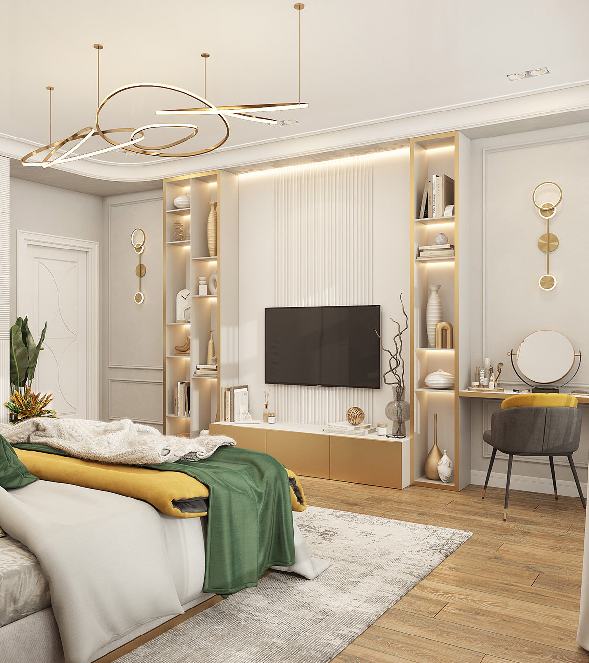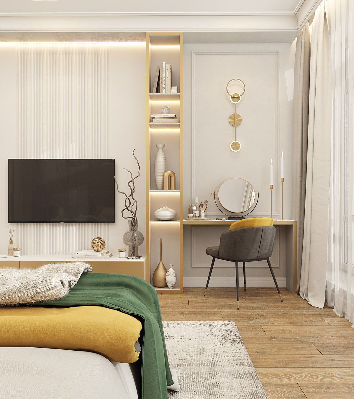 Это проект спальни площадью 25 м² в коттедже в г. Екатеринбург. Туалетный столик будет использоваться крайне редко, поэтому он достаточно узкий. Особую атмосферу спальне придали обои из коллекции «Deco».