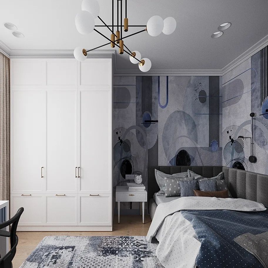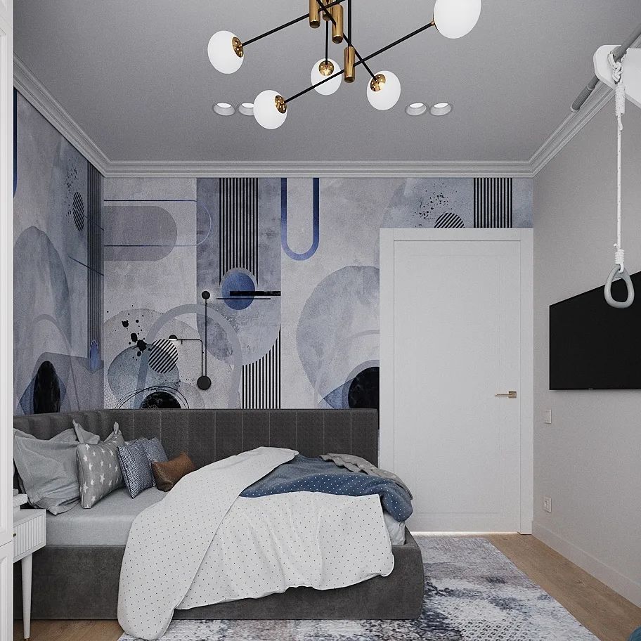 Детская комната с обоями из коллекции дизайнерских принтов «DECO». Дорогие оттенки, геометрический рисунок и смелое сочетание текстур – всё это вы найдёте в этой удивительной коллекции. Принты воплотили в себе роскошь ар-деко, графичные линии минимализма 60-х годов и современные тренды. Также здесь успешно объединились интересные текстуры штукатурки, бетона и золота с благородными оттенками серого, бежевого, розового, бирюзового, синего. Строгость и простота рисунка в сочетании со смелыми цветовыми решениями выигрышно украсят любой интерьер и гарантированно останутся в тренде на долгие годы!