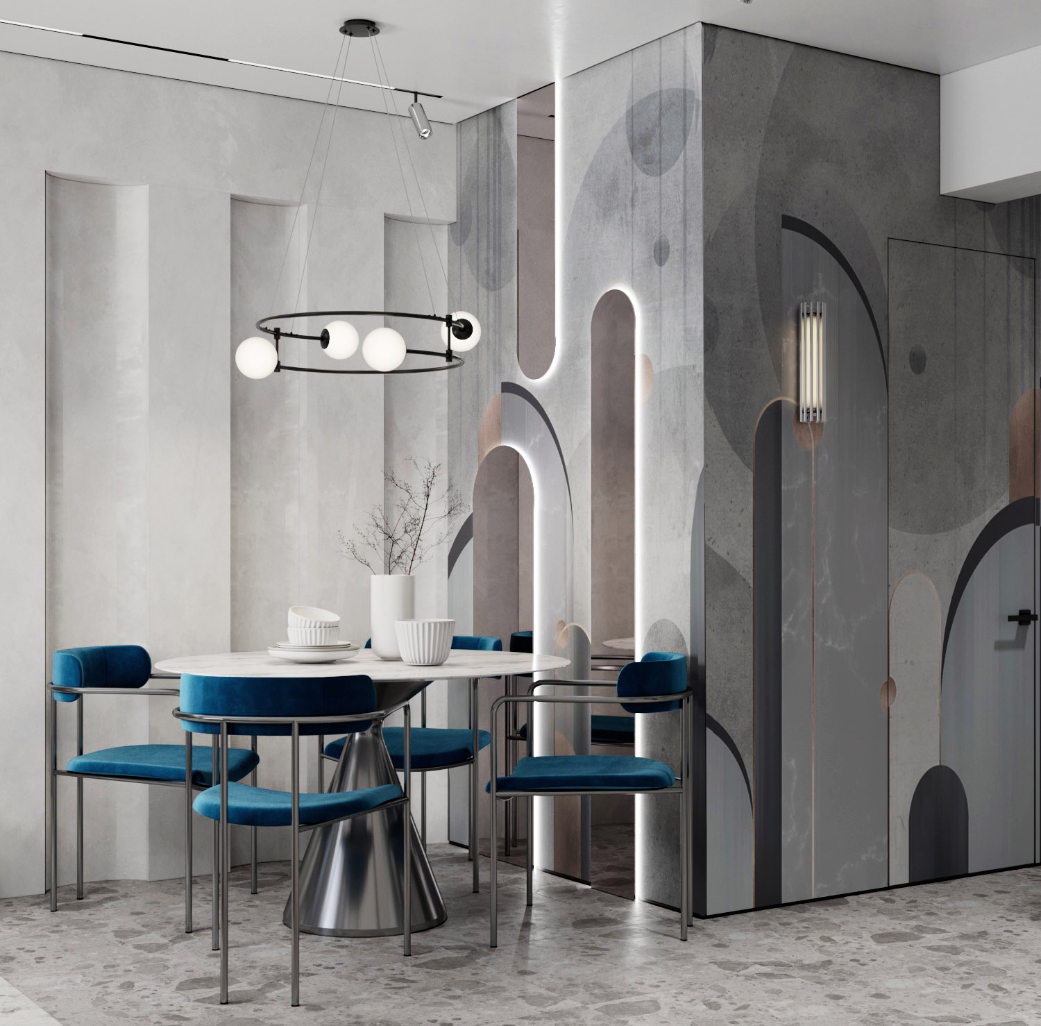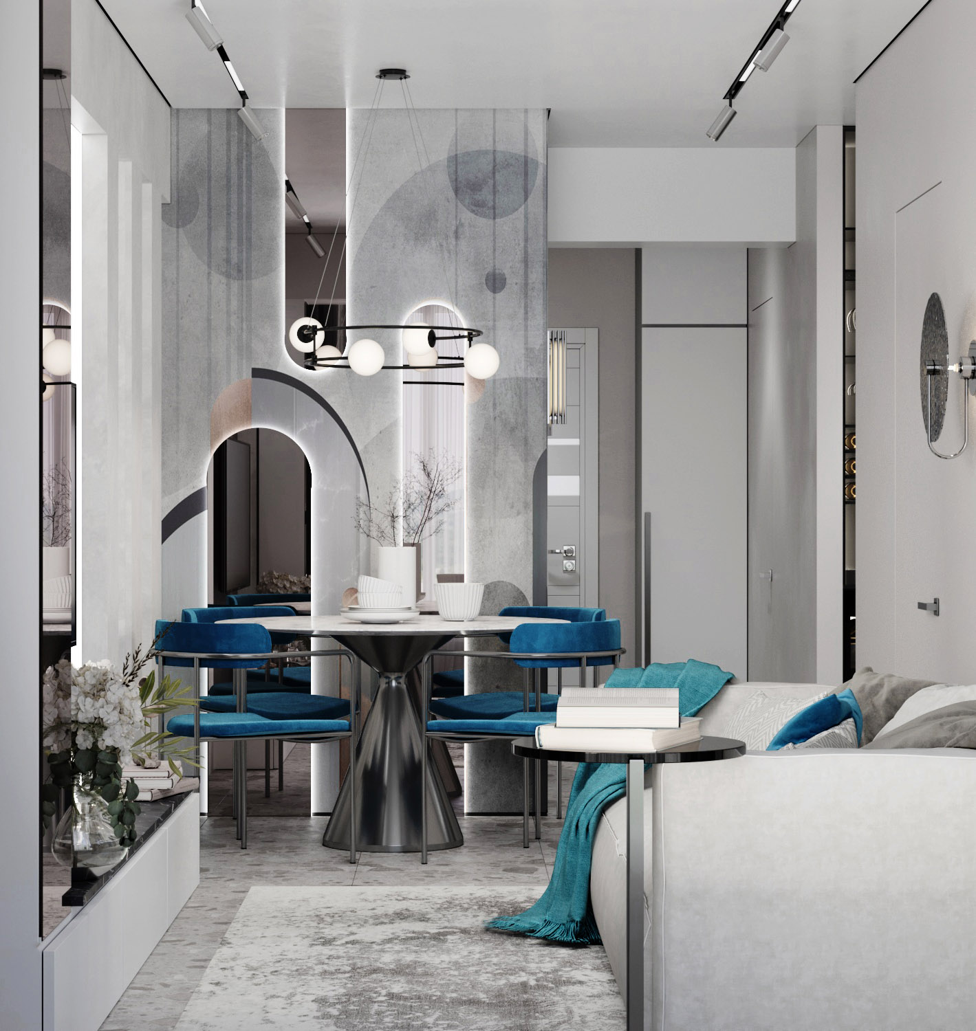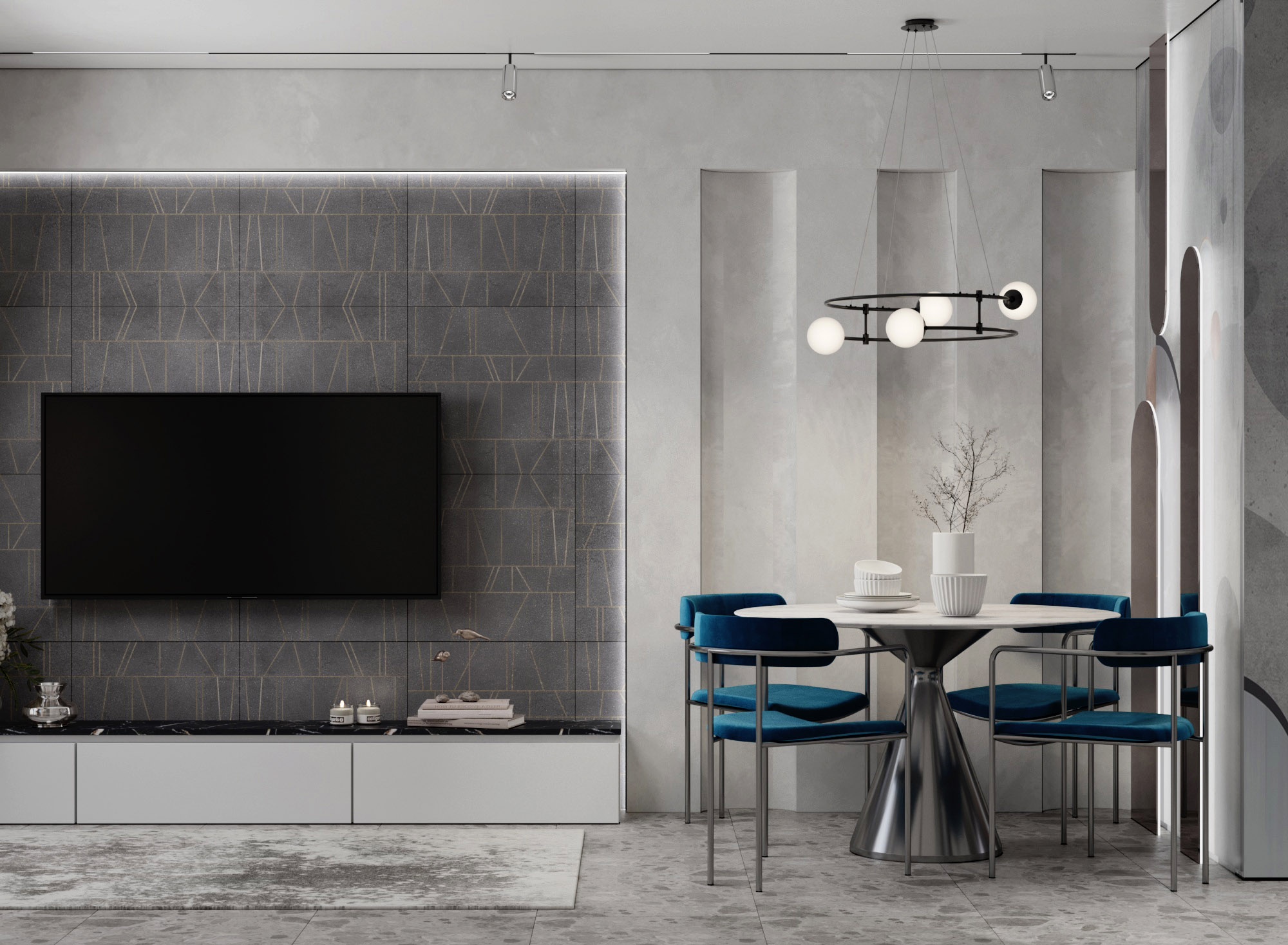 Проект кухни-гостиной в городе Сочи, площадь помещения — 20 м². Изначально концепцией был строгий минималистичный интерьер, но заказчикам захотелось акцента. Решили использовать обои «Deco», которые разбавили строгость картины, но в то же время поддержали общее настроение за счет текстуры под бетон и геометричных форм, которые еще и удалось поддержать зеркалами с подсветкой. В целом получился очень необычный эффект и композиция, которую хочется разглядывать.
