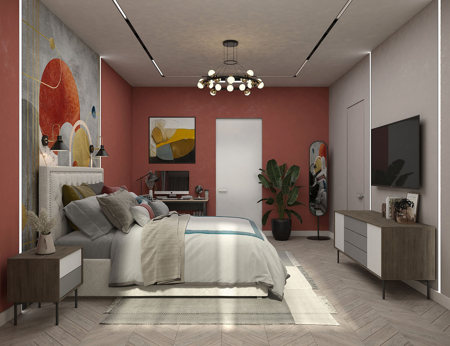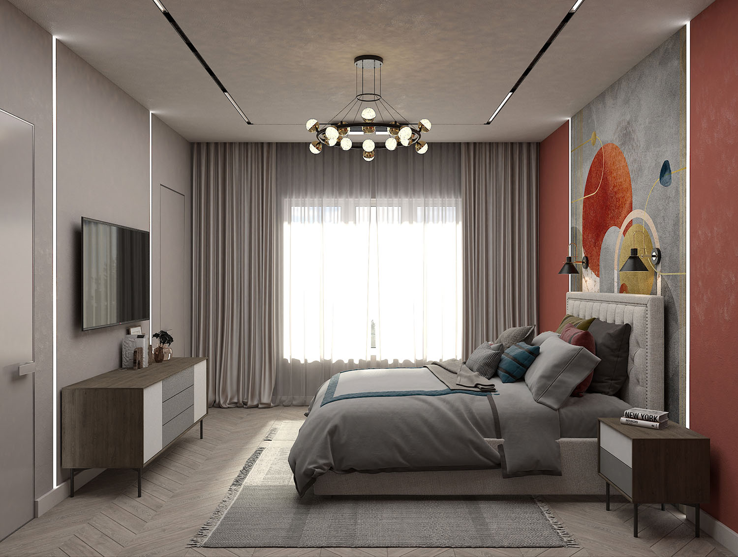 Спальня в загородном доме в Подмосковье для семьи с двумя детьми и бабушкой. Заказчица хотела очень яркий интерьер. В комнате за кроватью сделали яркую акцентную стену, в чем помогла коллекция DECO, и совместили с такими же яркими однотонными обоями.