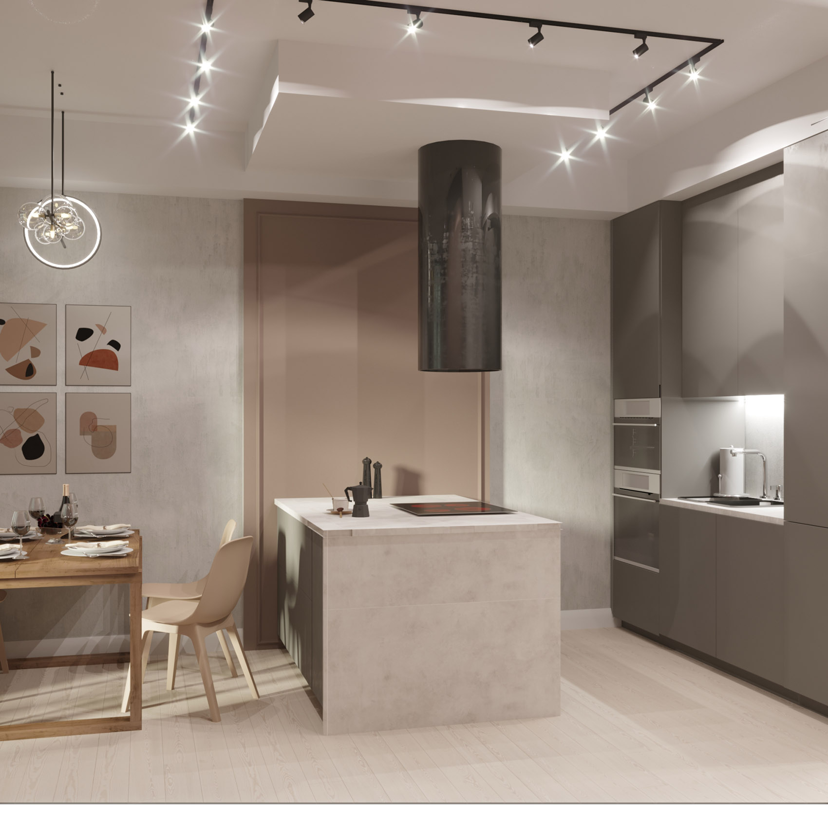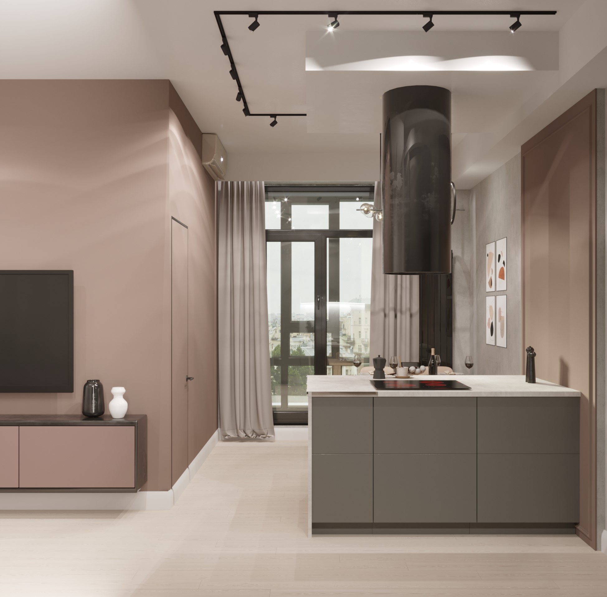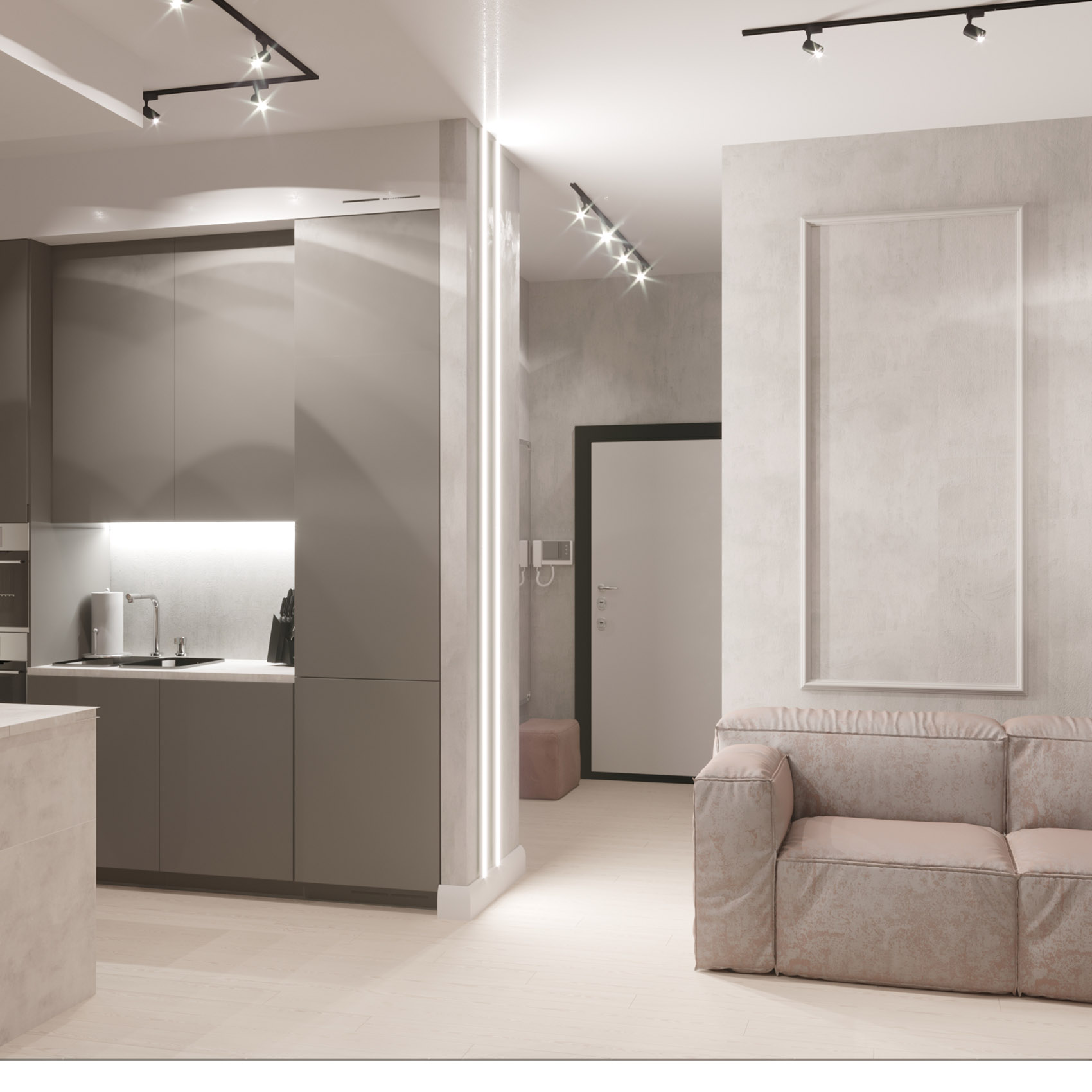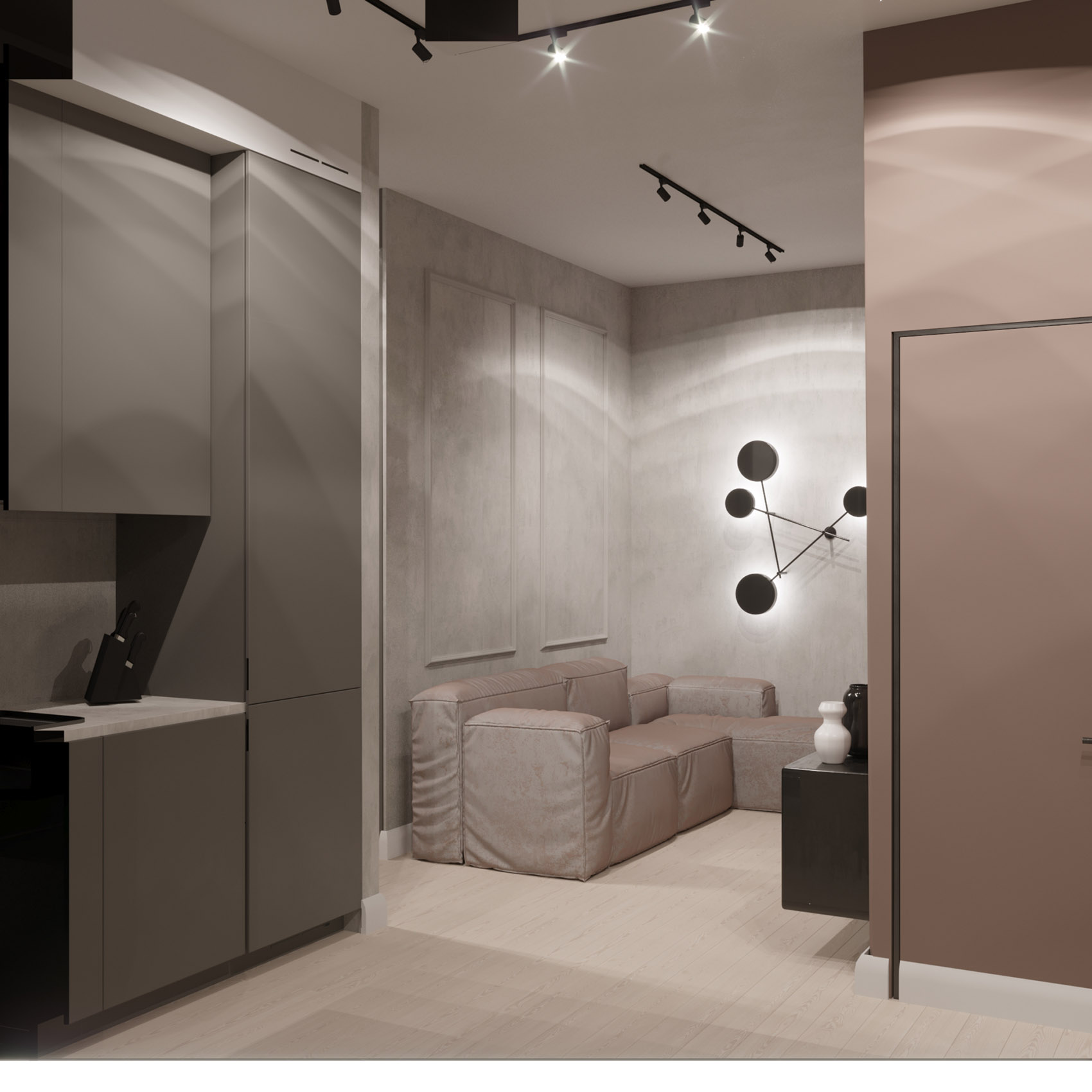 Квартира для сдачи в аренду. В студии выделили спальню, зону гостиной и кухни. Маленькую комнату проще всего украсить декоративными обоями, т.к. они не отнимают пространство, как остальной декор. Для этого проекта идеально подошла коллекция «Deco».