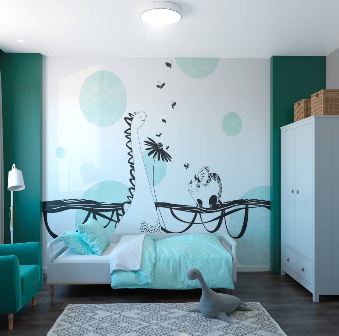 Детская в ЖК «Отражение». Обои из коллекции DINO RINO. Так как пол ребенка пока неизвестен, комната выполнена в универсальных цветах.