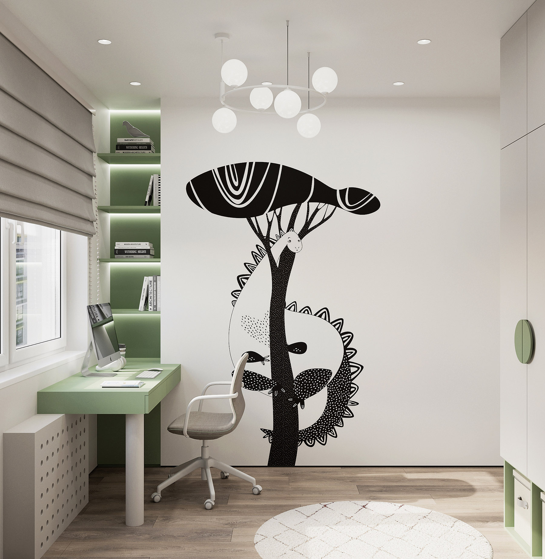Детская комната создавалась на вырост для ещё совсем крохи, поэтому на усмотрение родителей. Хотелось сделать светлую детскую, но также добавить интересный цвет для акцента. А в процессе подбора обоев с заказчиками, остановились на идее в качестве такого милого дракончика на дереве из коллекции «Dino Rino». Поэтому стена хоть и белая, но на ней словно большой рисунок, а не обои!