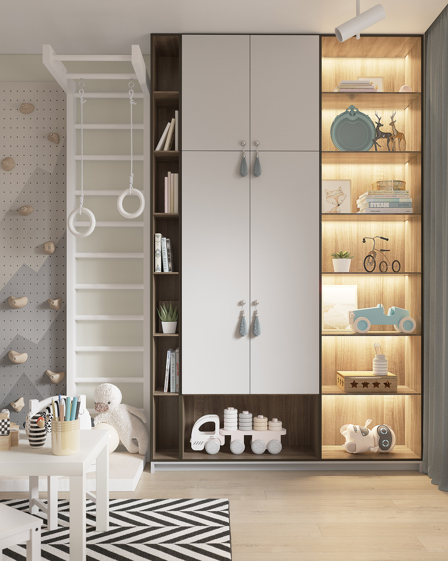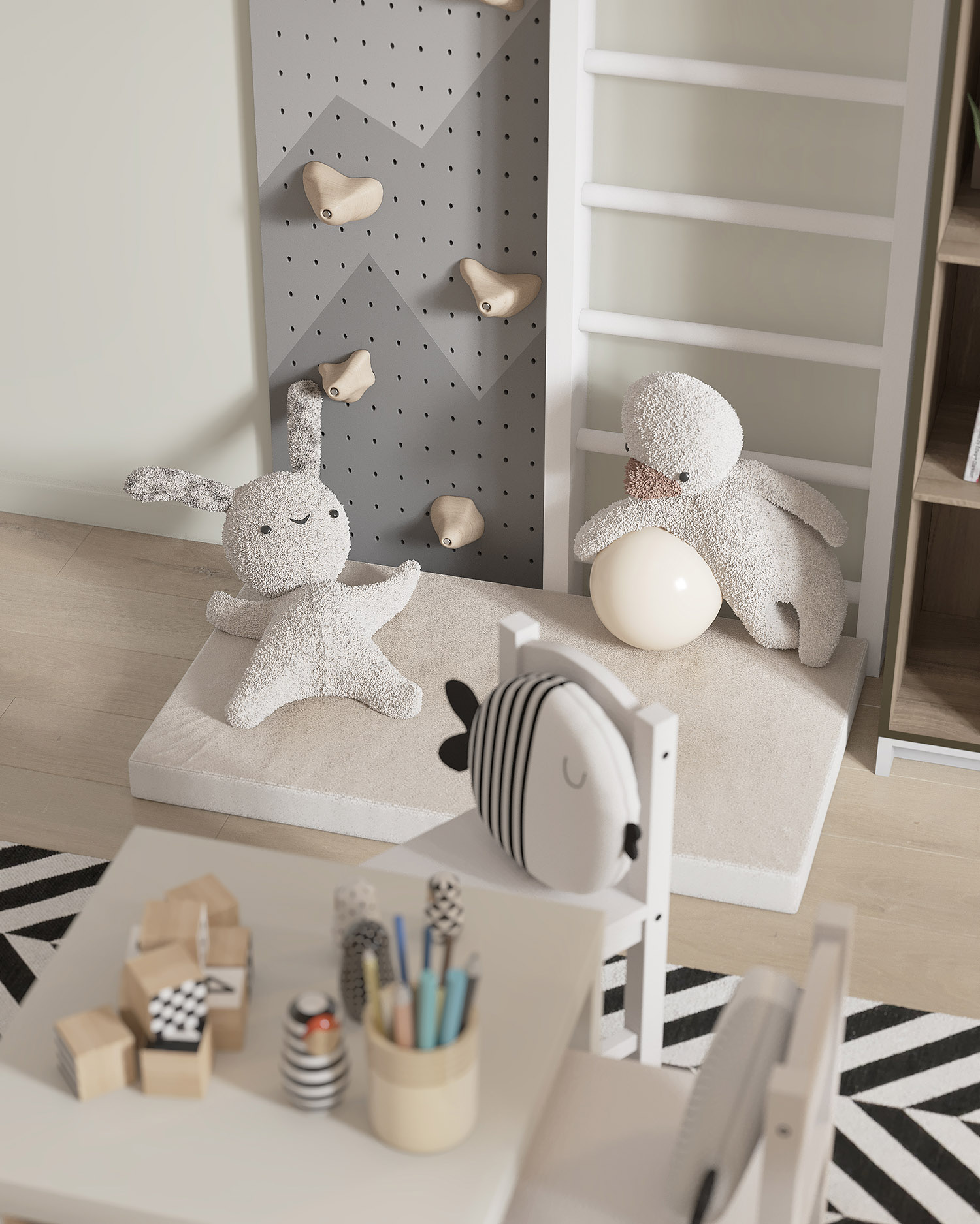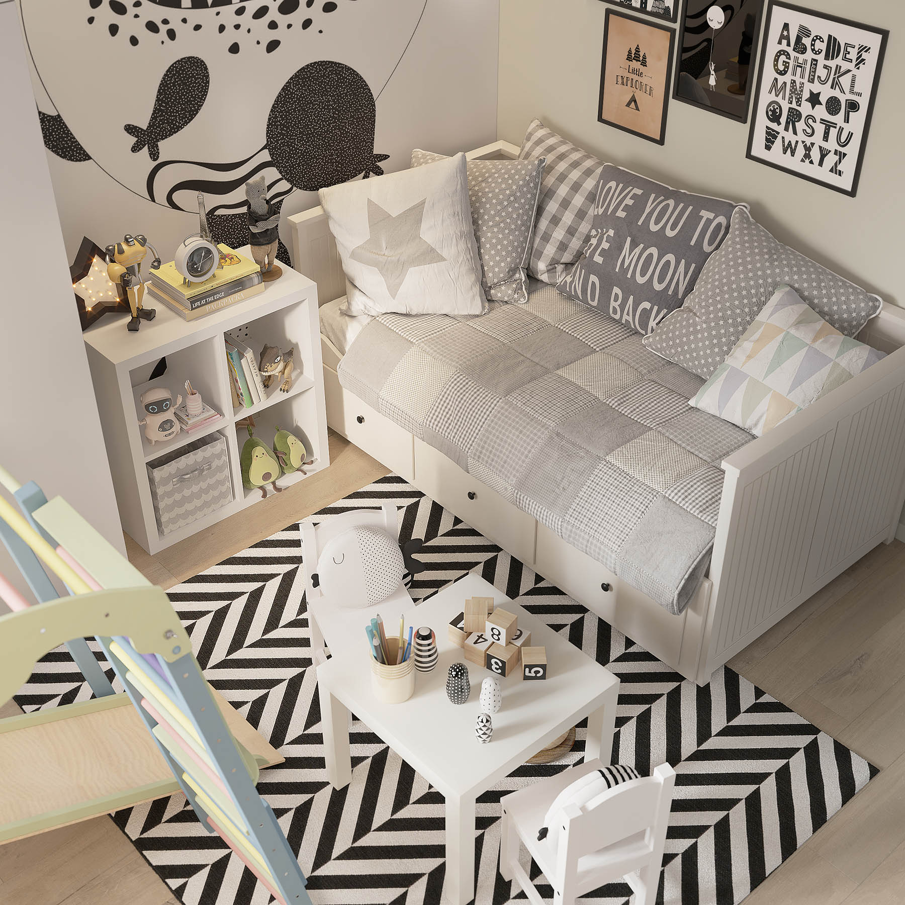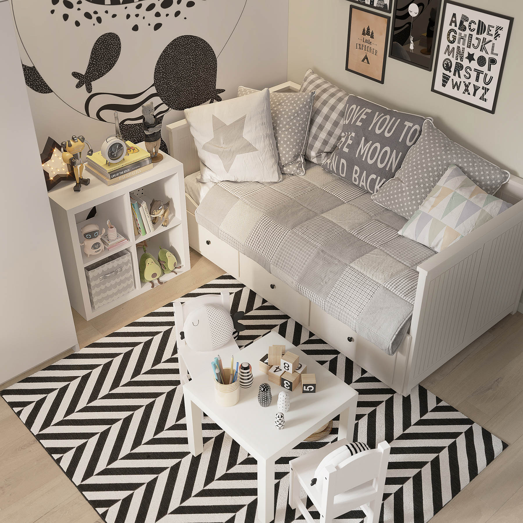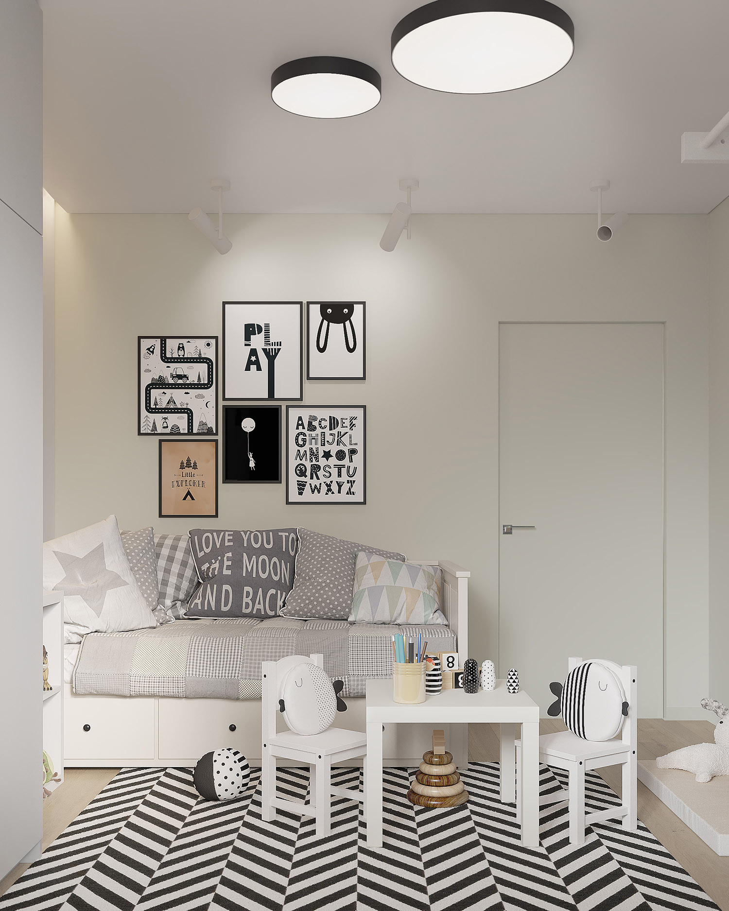Комната площадью 13,6 м² для двухлетнего мальчика. Уютная детская в нейтральных оттенках сканди с яркими чёрно-белыми деталями. Основные пожелания заказчиков были — возможность установки в будущем двухъярусной кровати и письменного стола.