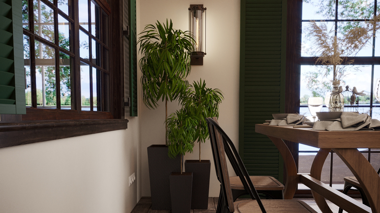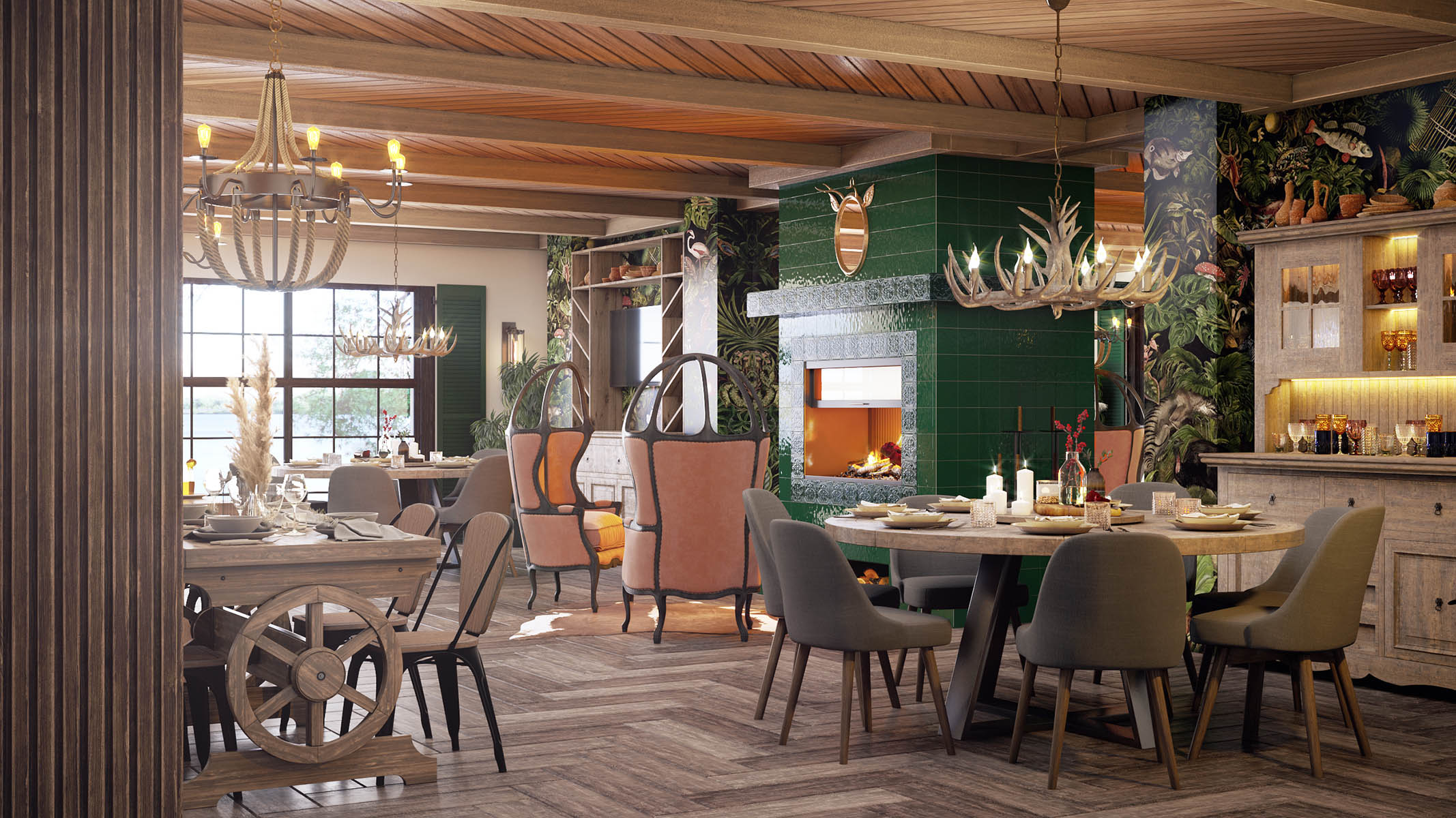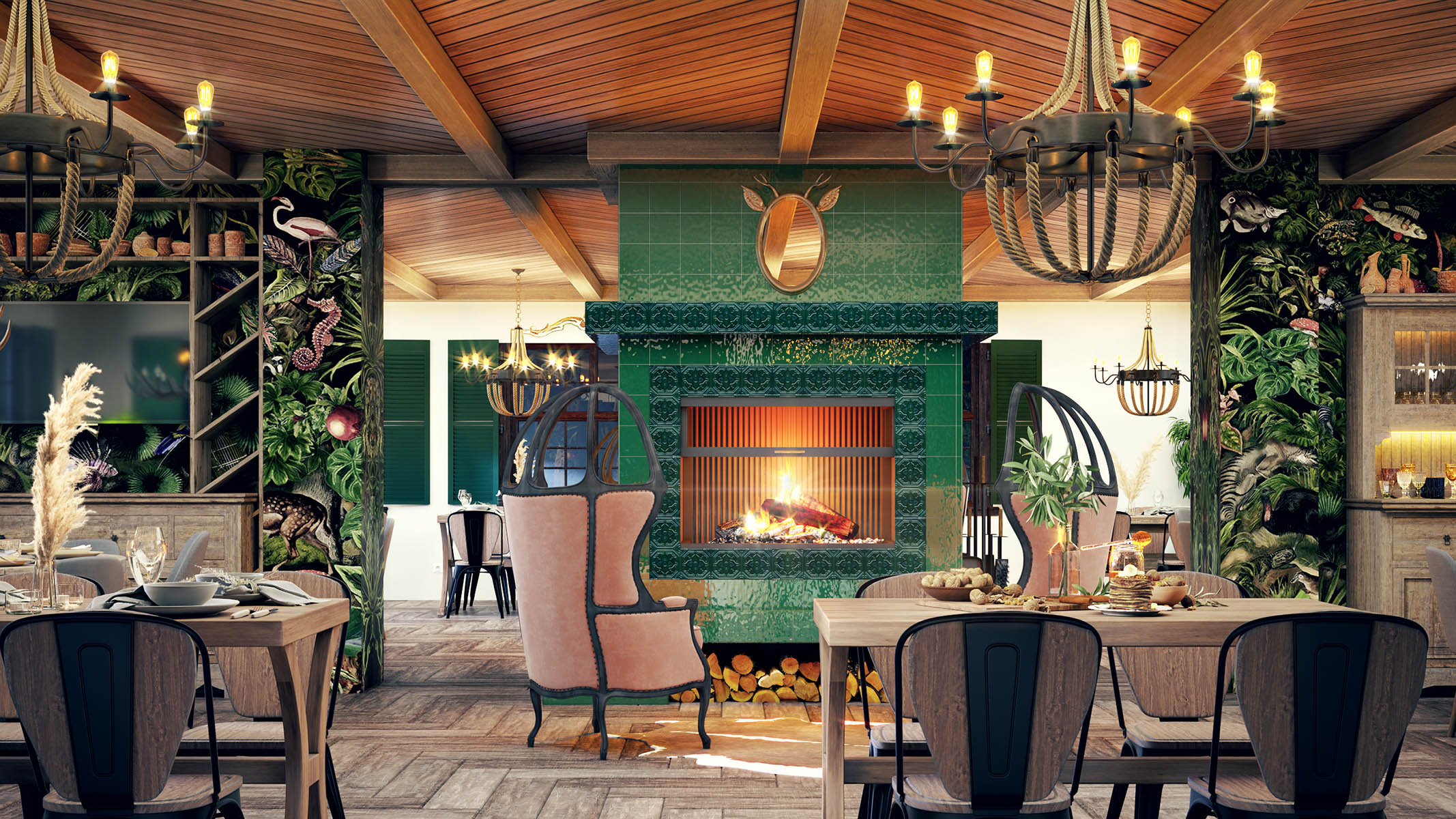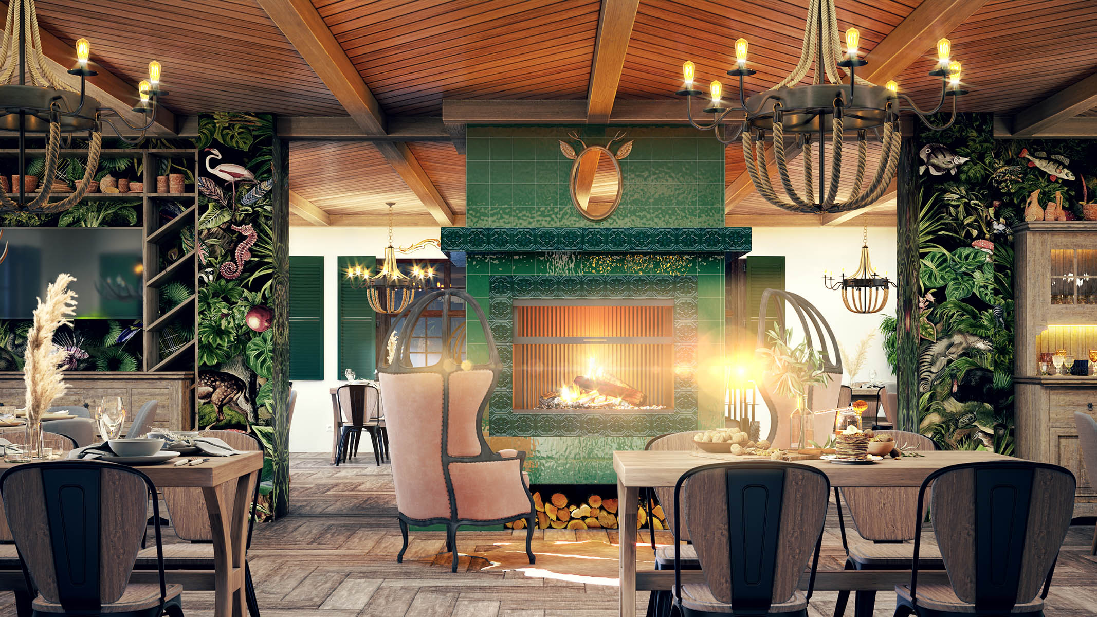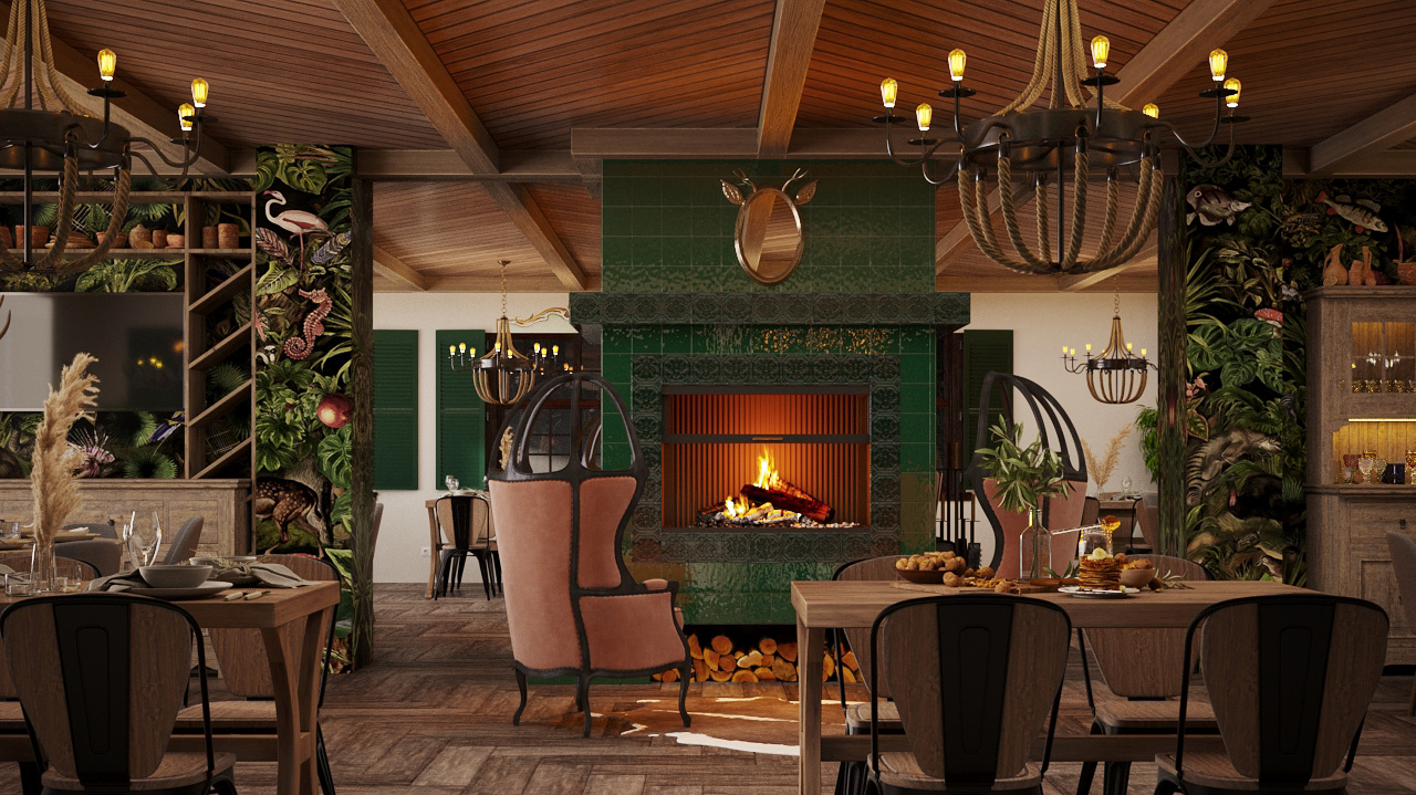 Интерьер кафе напоминает немного баварский фермерский стиль. Стены оформлены обоями с изображением животных, птиц, рыб и экзотических растений. Тема растительного мира продолжается в оформлении камина: его обрамляет глазурованная плитка с объемным растительным рисунком. Наличие настоящего дровяного камина обеспечит приток посетителей не только в летнее время, но и в зимние периоды. Уютная зона у камина скорее всего будет излюбленным местом гостей.