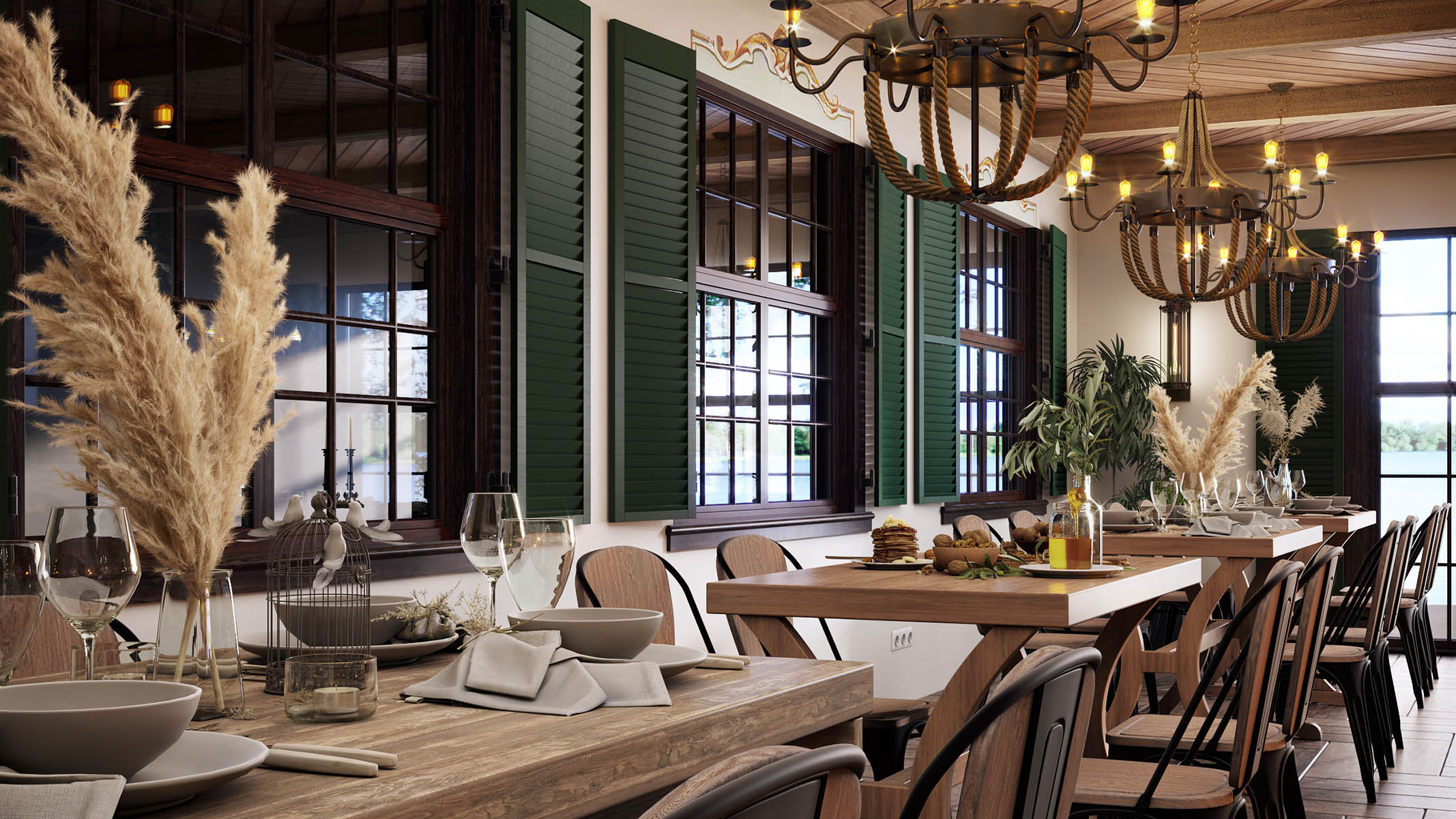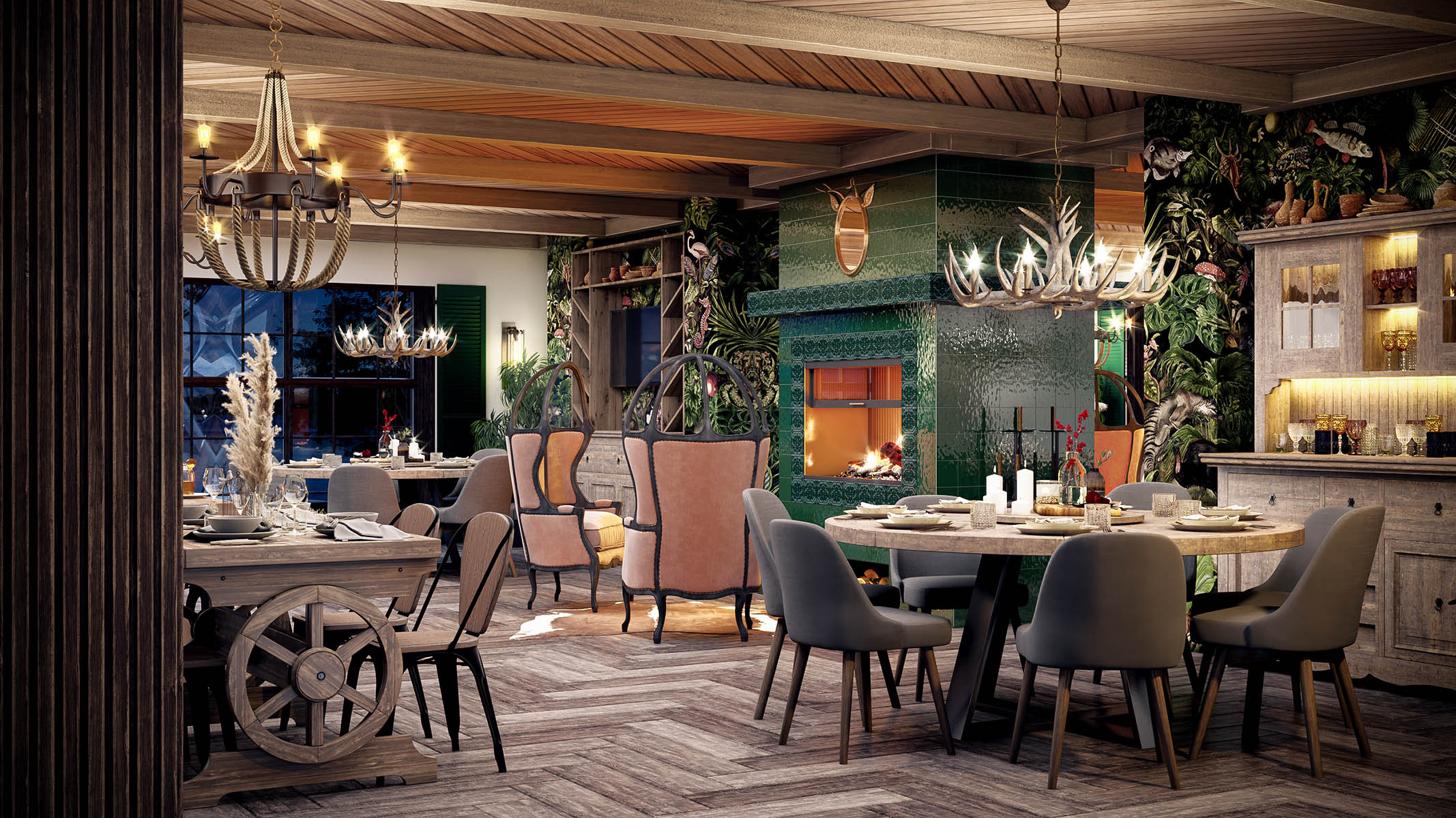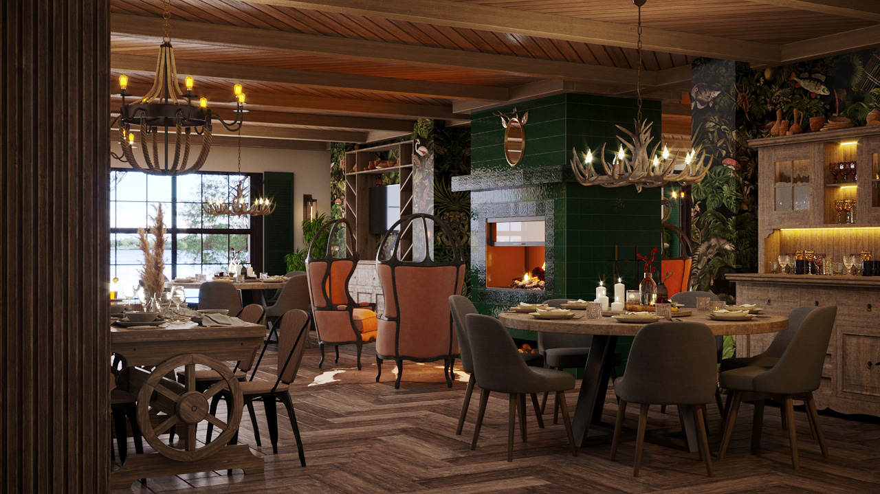 Состаренное дерево на балках, деревянная тяжелая брутальная мебель, люстры в форме рогов, мягкое пламя свечей, отсвет от камина, мягкие сидения стульев, классическая музыка, европейская сытная кухня с запечёным мясом, слоеными пирогами, домашними сосисками и колбасами, изысканные десерты… Всё вместе будет расслаблять, обволакивать, располагать к неспешной негромкой беседе.