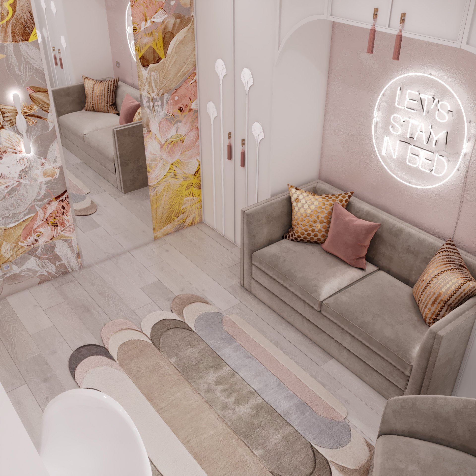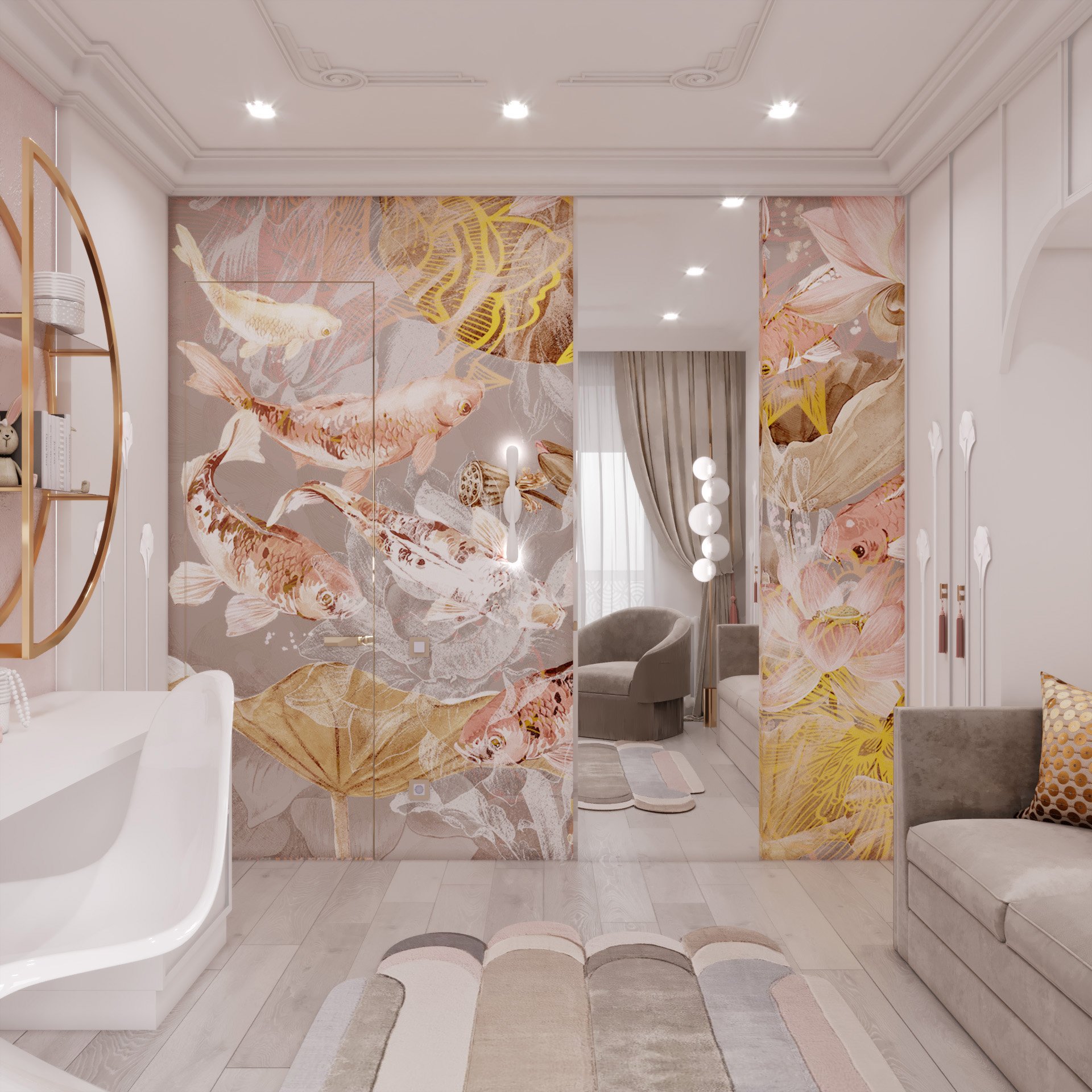 Детская комната для старшеклассницы из города Казань. Обои с рыбками из коллекции «Eden». Гедонистическая и сочная, эта коллекция забирает всё внимание на происходящее на ней. Райские сады, тропические джунгли, отсылка к Иерониму Босху и его Саду Земного наслаждения… Мы погружаемся в удивительный сон, в котором сады султанских дворцов наполнены разнообразными животными и птицами, где бассейн, наполненный драгоценными красными карпами, дарит покой и наслаждение мирской жизнью.