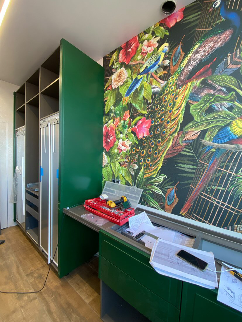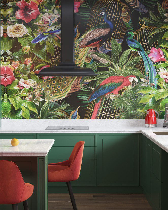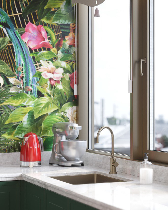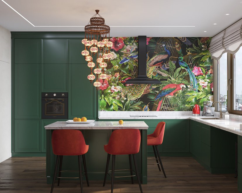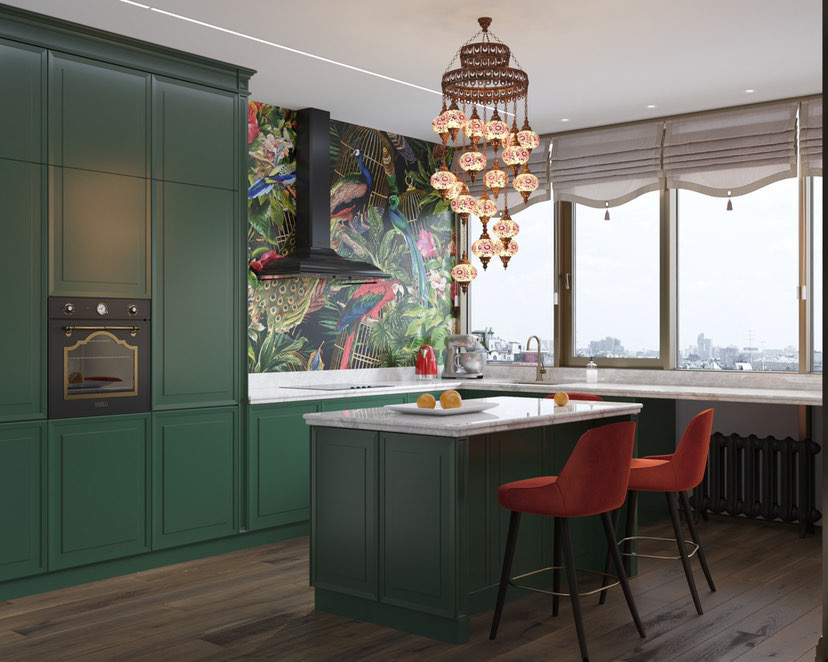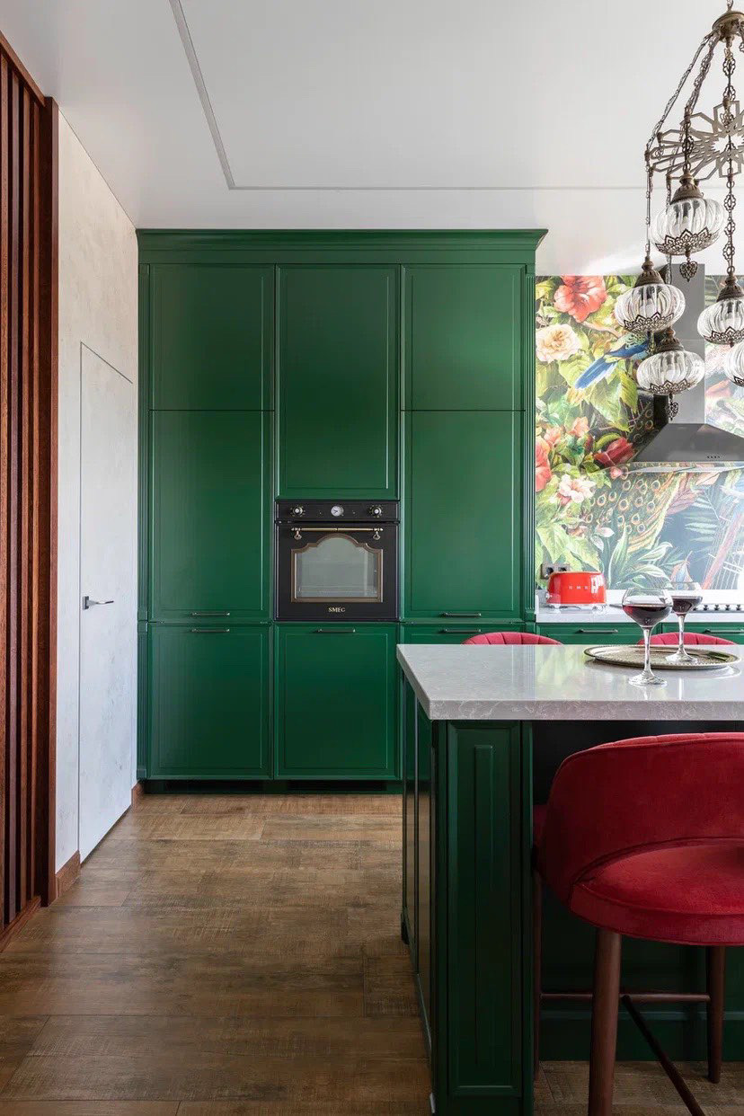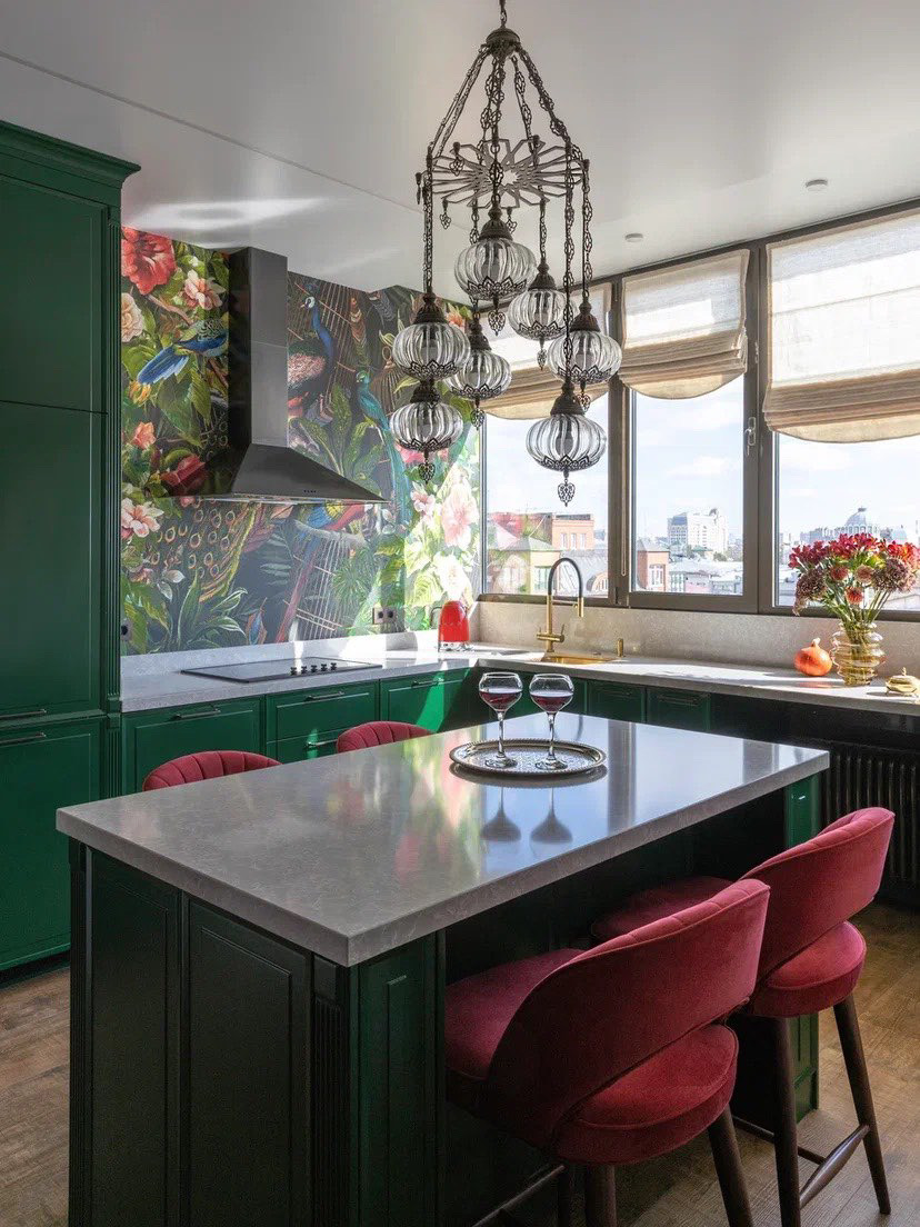 Интерьер кухни в современном стиле, в котором уместны восточные нотки и яркие цветовые акценты. Глубокий зелёный цвет в фасадах гарнитура, полубарные стулья винного оттенка, люстра с восточным характером прямиком из Марокко, оригинальные дизайнерский обои, столешница из композитного материала — все это притягивает внимание и не может оставить равнодушным.