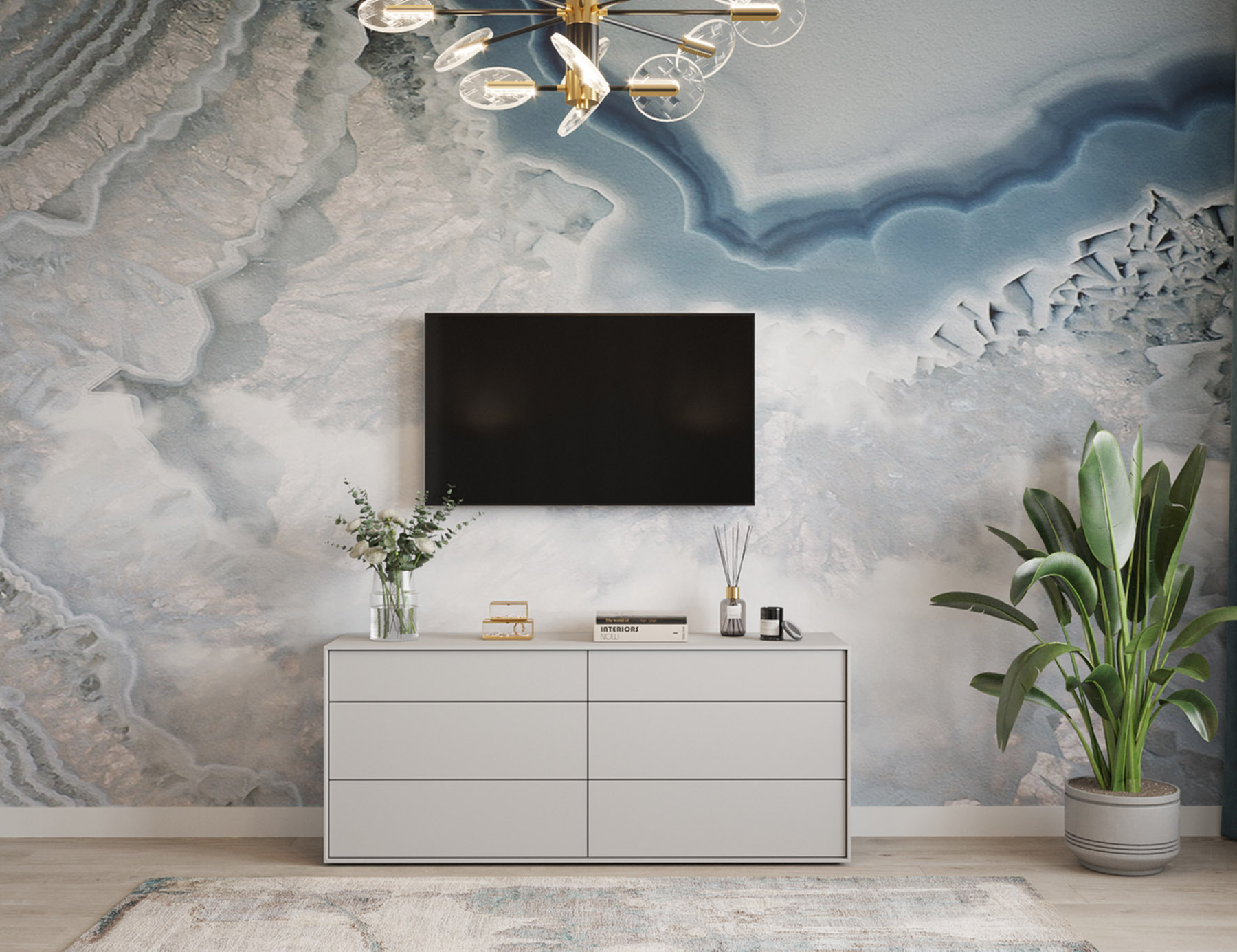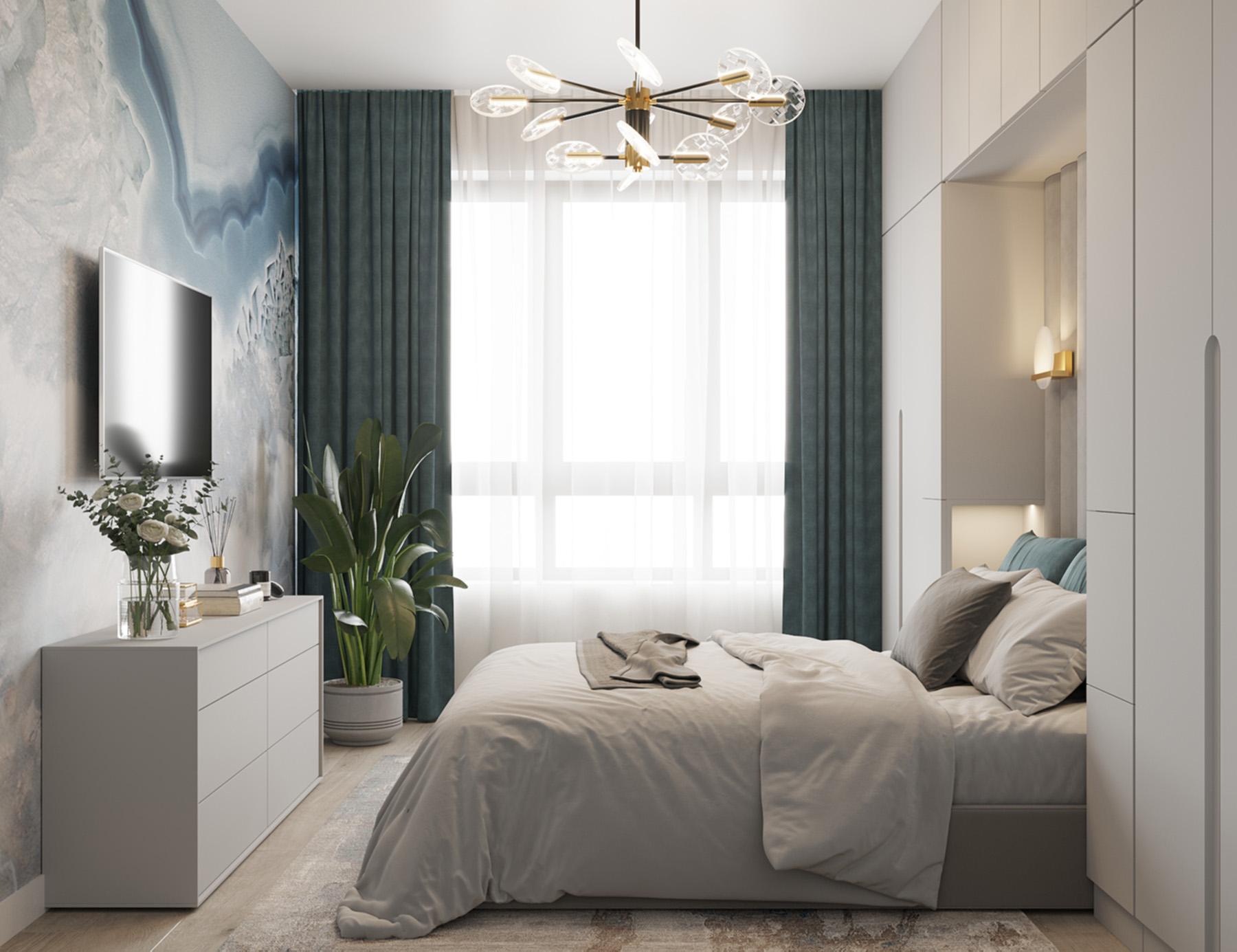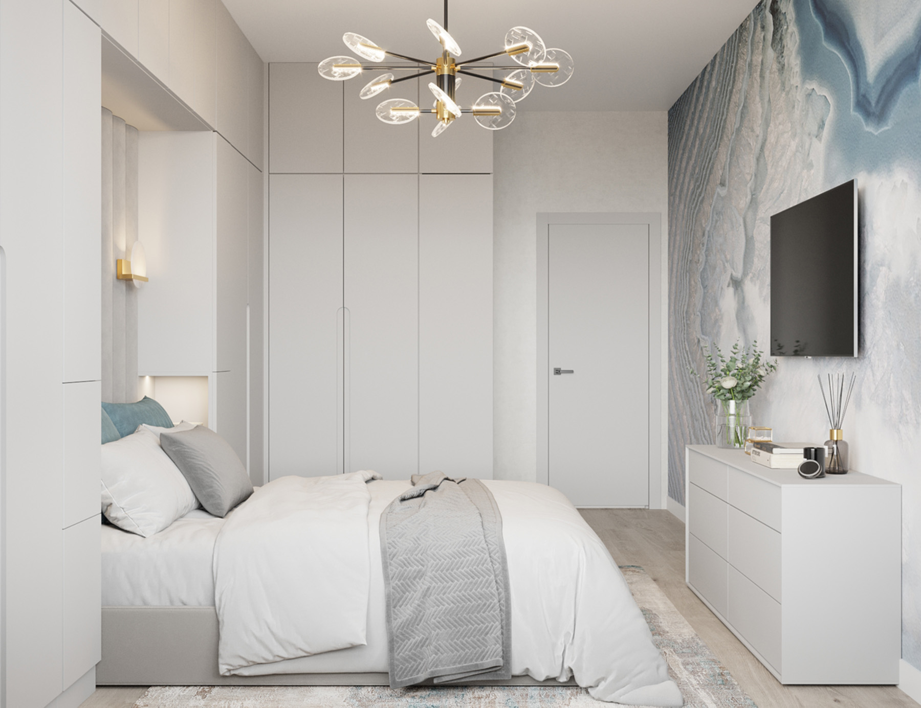 Проект для молодой пары, которая предпочитает яркие цвета и интересные акценты. Ребята любят морские оттенки и уникальные решения, поэтому в качестве акцента в спальне были выбраны обои Elegant 12. Природная красота камня сделала интерьер поистине роскошным!