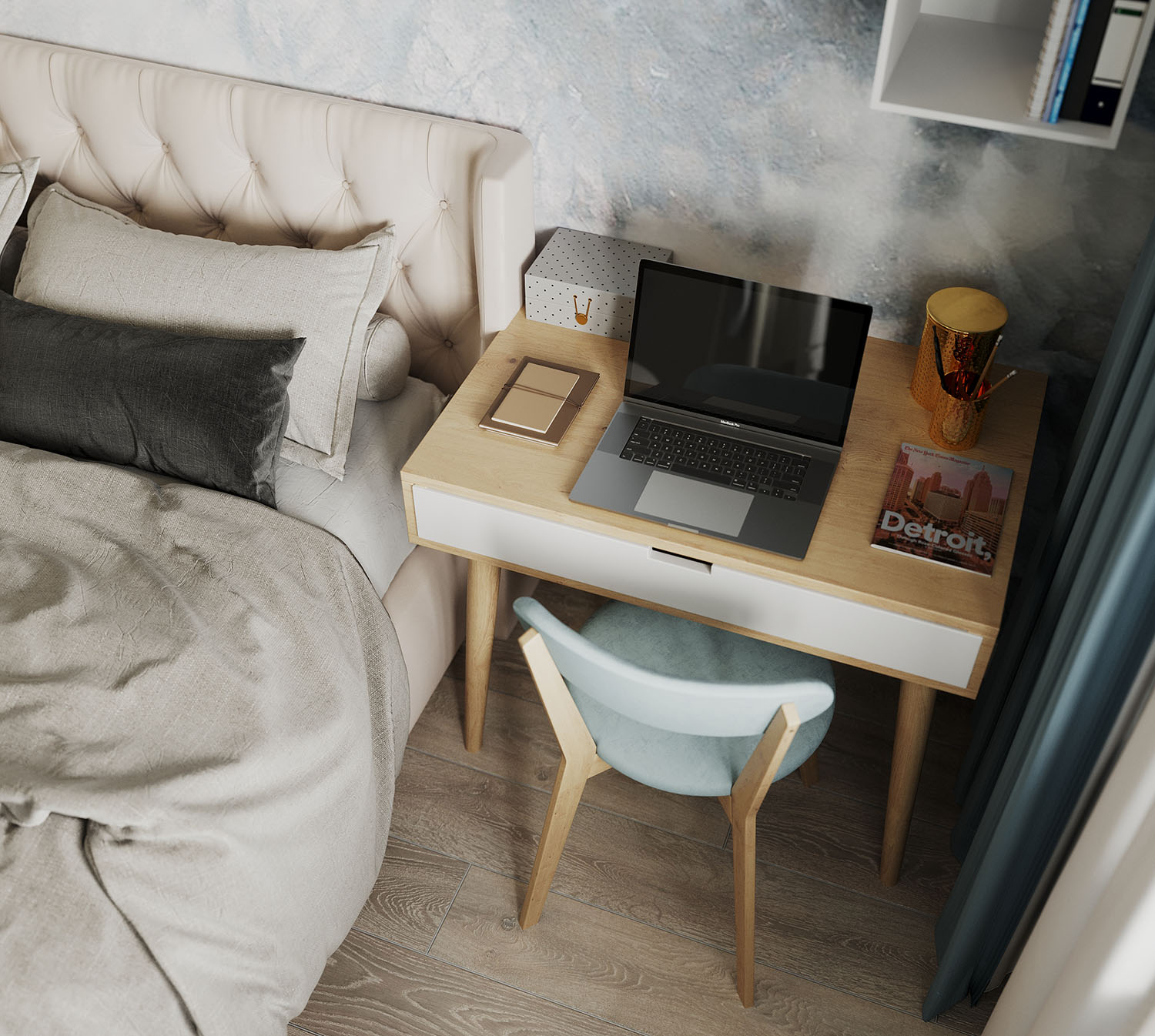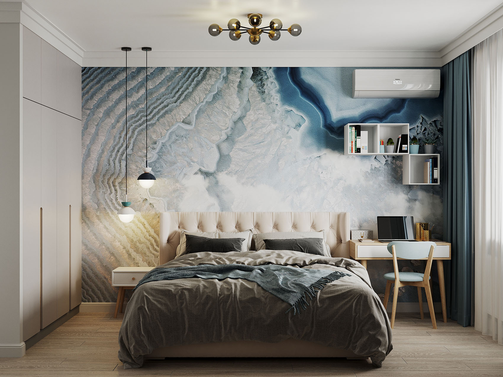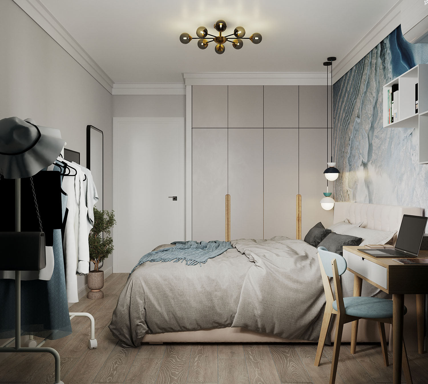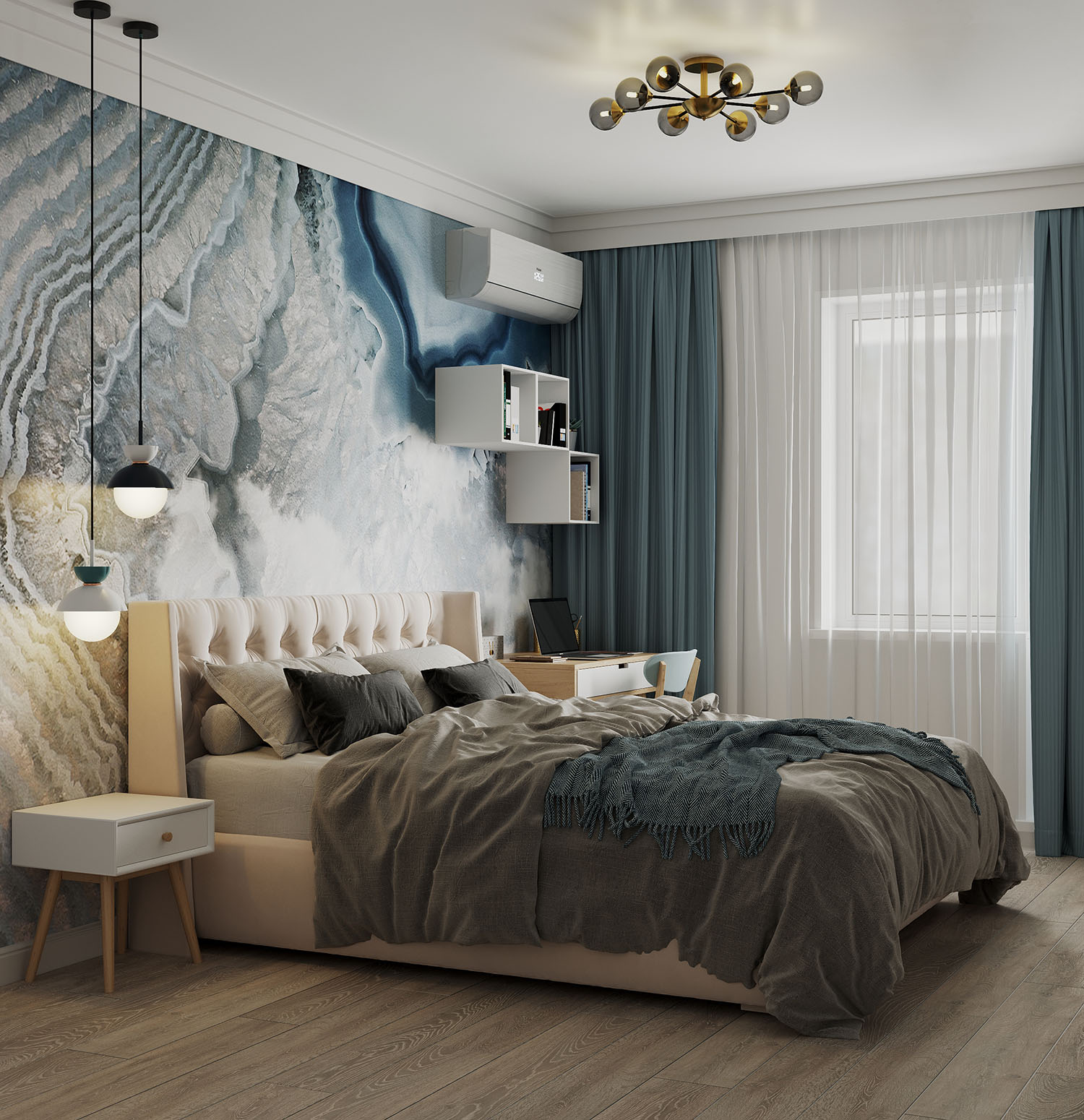 Дизайн-проект спальни площадью 13 кв.м. Вот что пишет о проекте дизайнер: «Моей задачей было создать уютный, освежающий, спокойный интерьер для молодой семейной пары из города Краснодар. Заказчица очень любит зеленовато-синие оттенки цвета, поэтому они присутствуют в текстиле, освещении и декоре. А фреска Elegant помогла объединить все элементы воедино и сделать притягивающий взгляд акцент.»