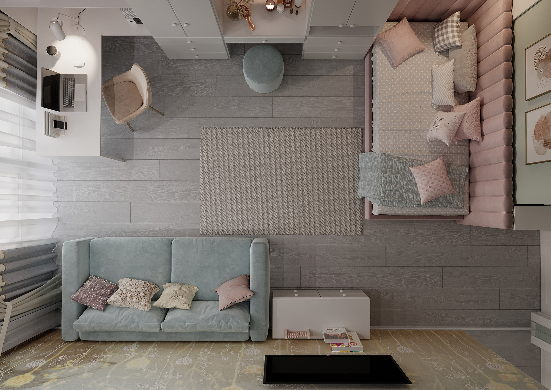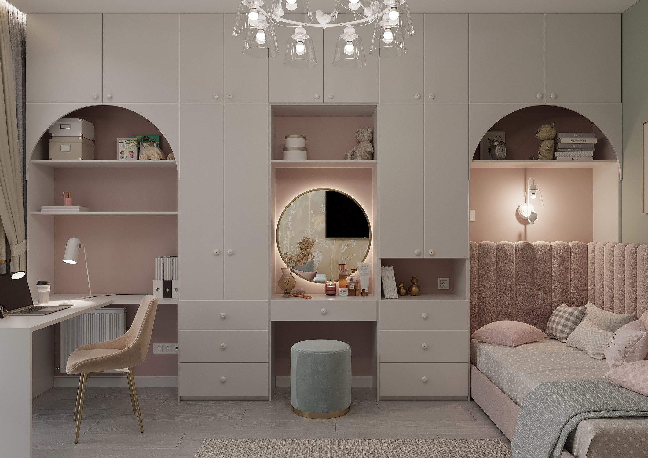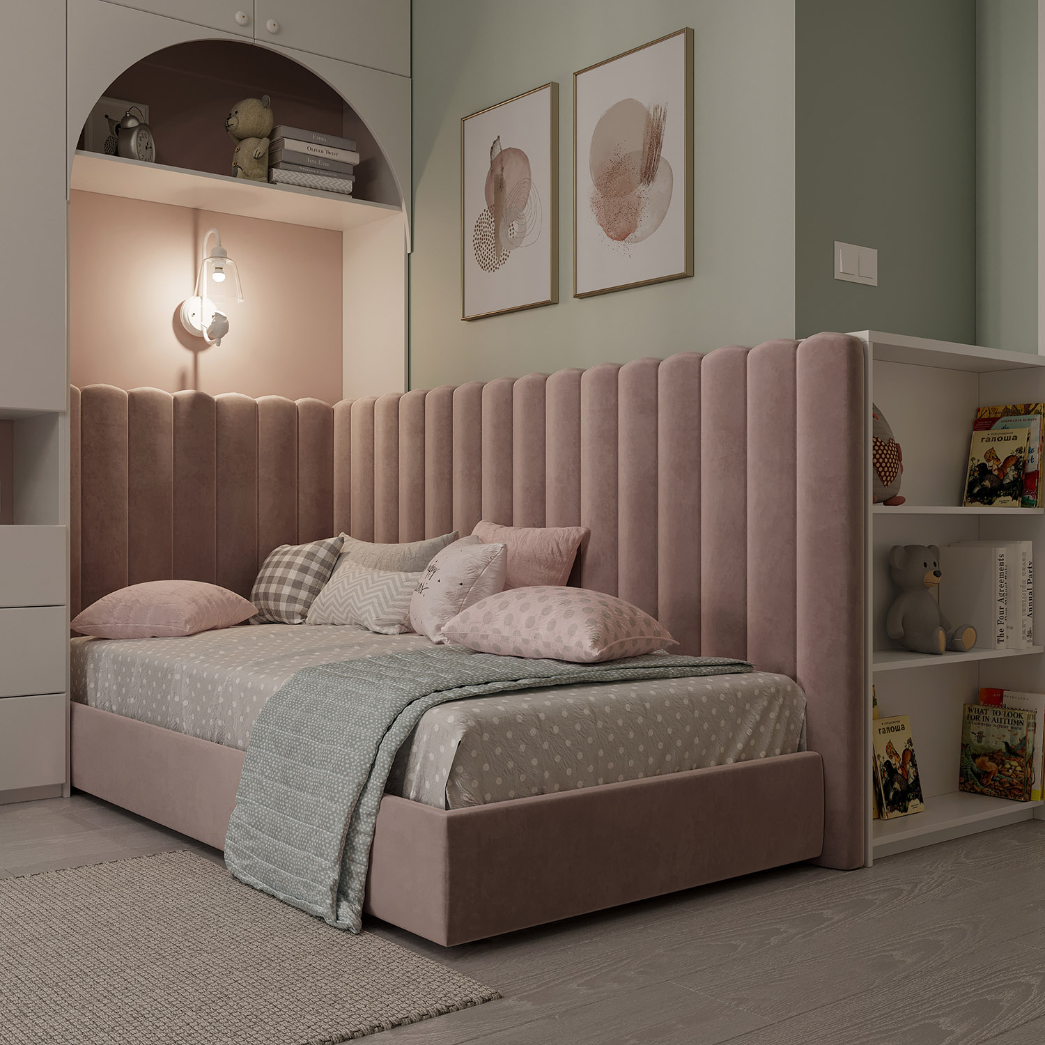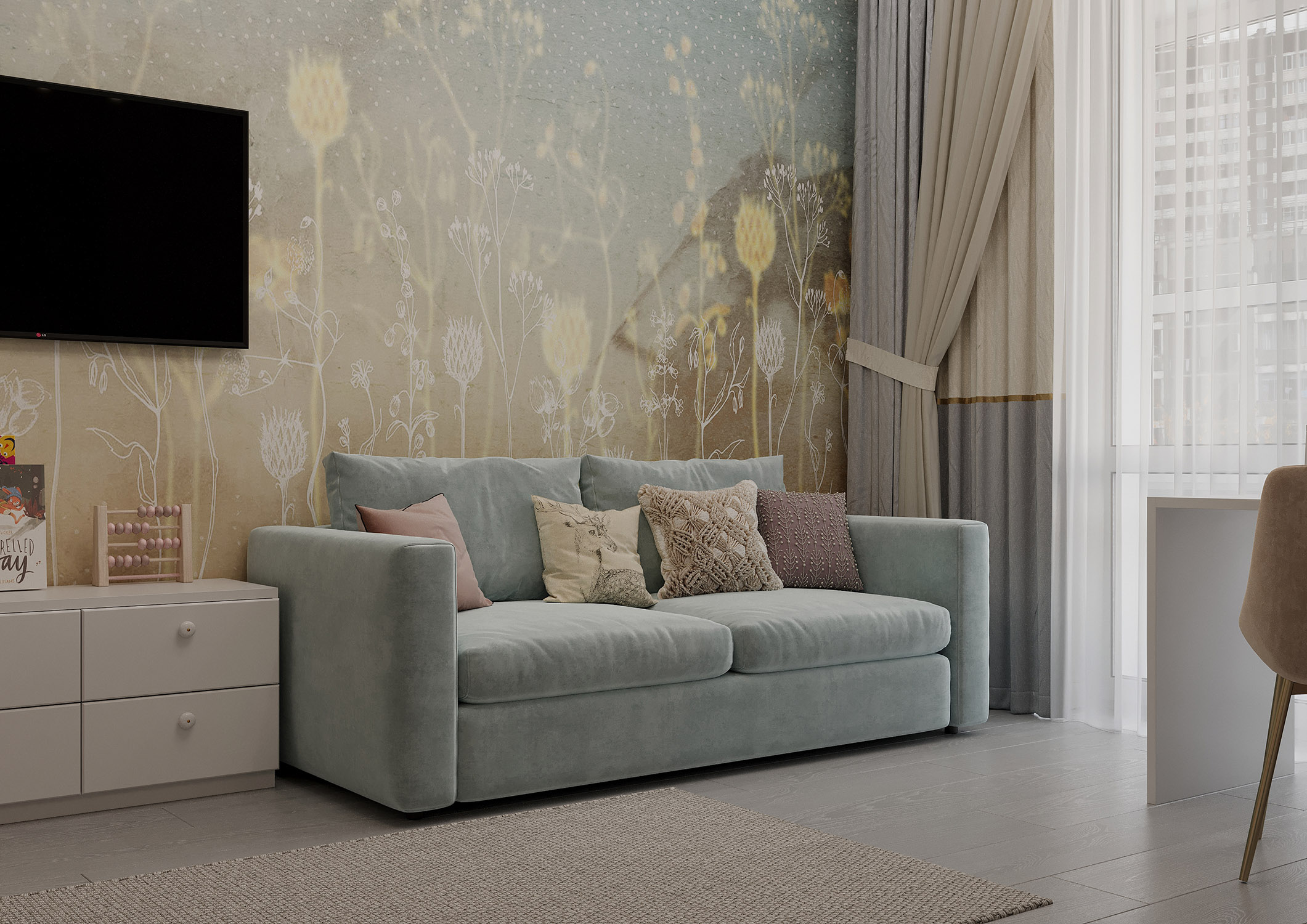 В дизайне этой детской комнаты была выбрана коллекция «Essence». О чем эта коллекция? Она как первое воспоминание о лете и природных метаморфозах, когда совершается таинство пробуждения ранней весны. А сухоцветы, которые стоят ещё с прошлого года, на раннем рассвете позволяют вновь окунуться в настроение лета, которое мы для вас приготовили.