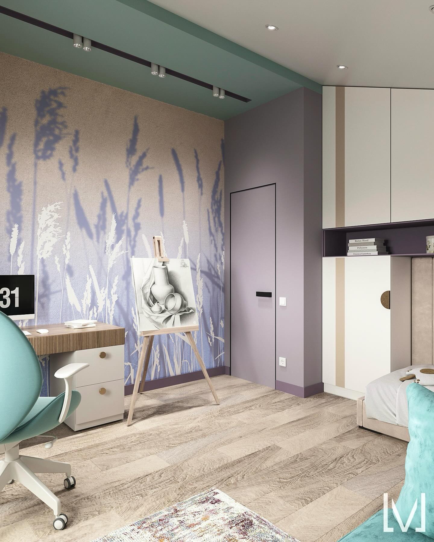 Детская комната площадью 15 м² для юной художницы. Обои из коллекции ESSENCE. О чем эта коллекция? Она как первое воспоминание о лете и природных метаморфозах, когда совершается таинство пробуждения ранней весны. А сухоцветы, которые стоят ещё с прошлого года, на раннем рассвете позволяют вновь окунуться в настроение лета.