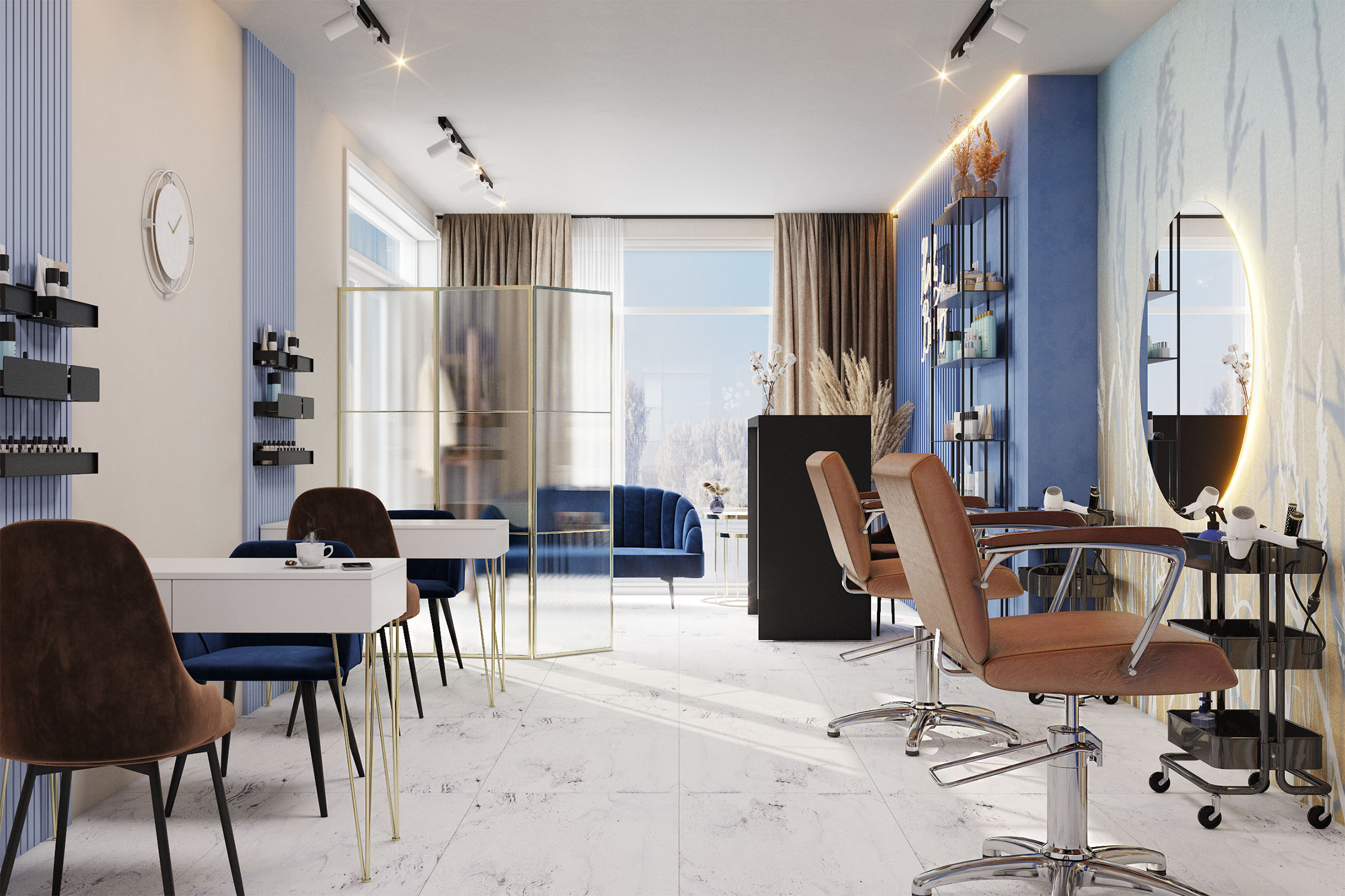 Особыми пожеланиями были сухоцветы вместо цветов для простоты в уходе. Этим и обоснован выбор именно такого рисунка обоев, который позволил добавить желаемый уют, эффектность и стиль. Также пожеланием заказчицы был зеркальный вместительный шкаф для стерилизации, хранения и кофейного оборудования, а также большие зеркала с подсветкой.