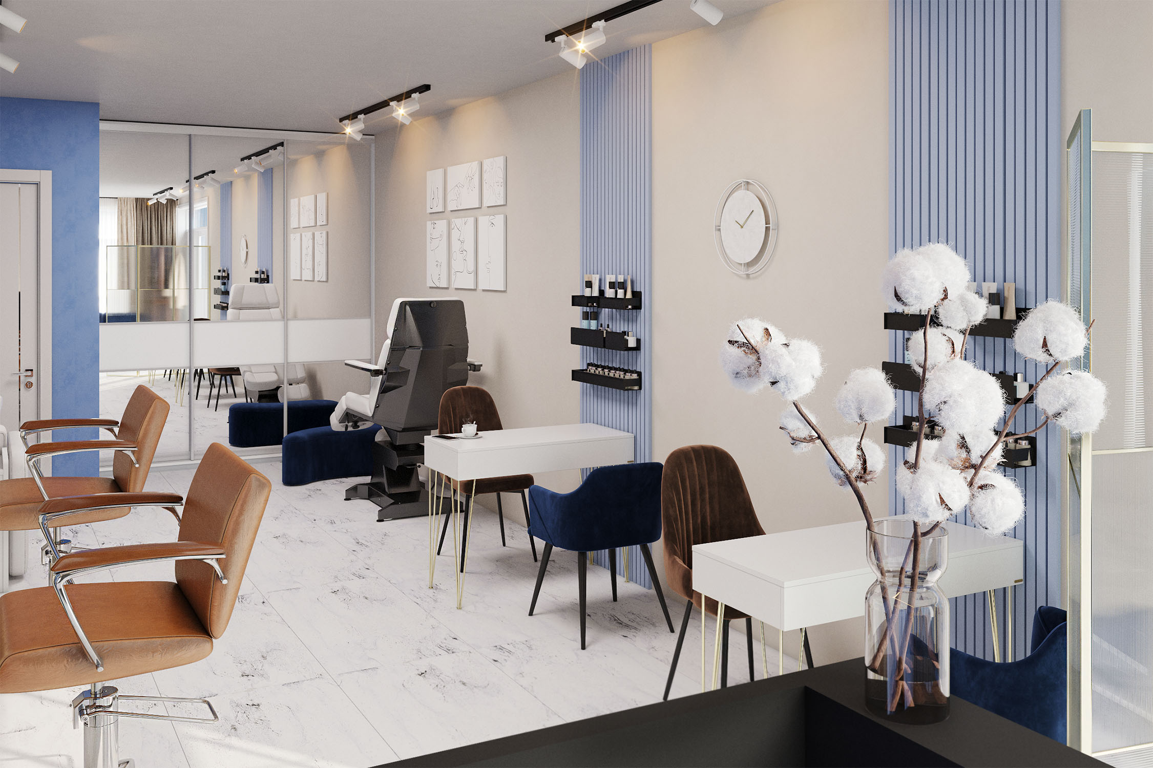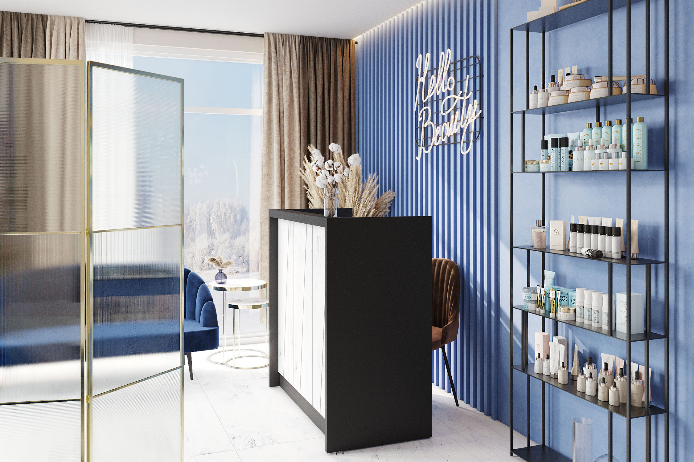 Дизайн-проект салона красоты в Крыму. Заказчица хотела уложиться в определенный бюджет и не тратить много средств на отделку арендованного помещения, но в то же время должно было быть стильно и эффектно. В этом помогла акцентная стена с использованием обоев «Essence».