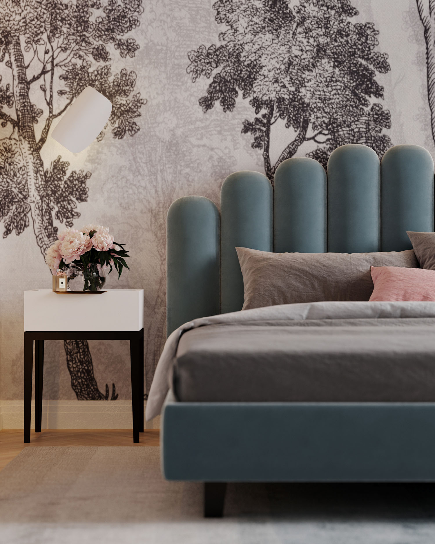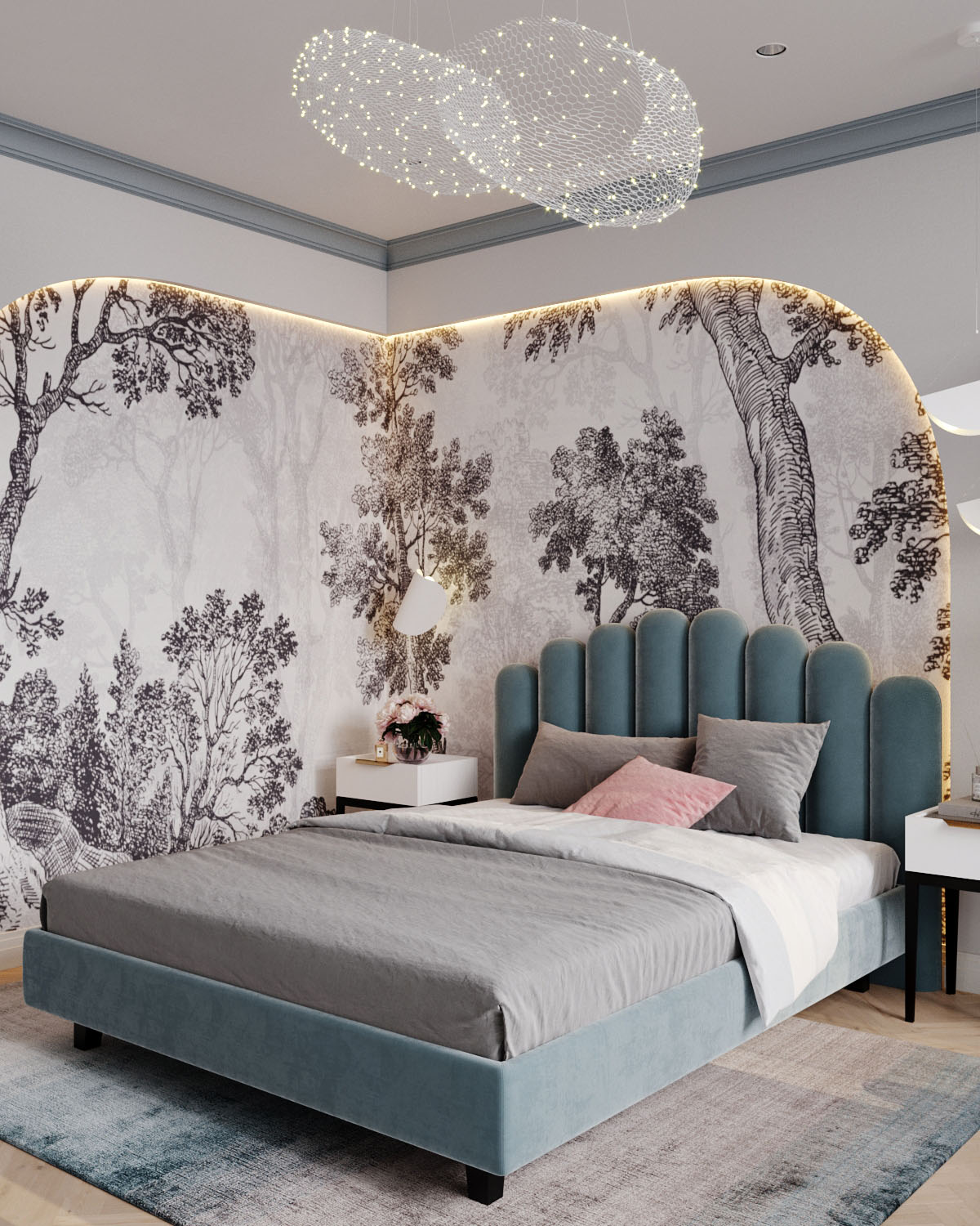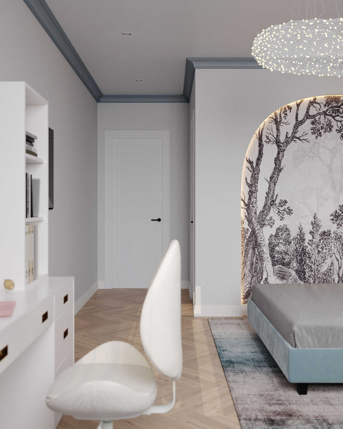 Спальня площадью 20 м² для девочки подросткового возраста, г. Сочи. Обои из коллекции ESTAMPE. Словно скрытые за лёгкой пеленой, её принты напоминают иллюстрации из старинной книги про путешествия. Едва заметные силуэты загадочных растений приглашают задержаться ненадолго в их необычных лесах и отвлечься от привычных забот.