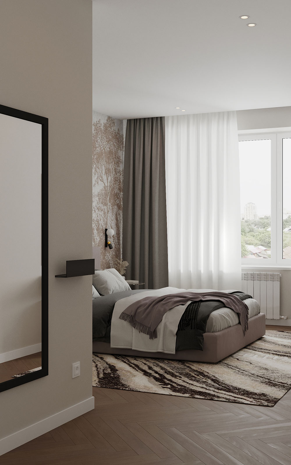 Проект разработан в городе Чебоксары для семьи с двумя детьми, ЖК Воскресенская горка. На рендерах нежная мастер-спальня с использованием контрастных элементов. В этой спальне приятно расслабится и провести и провести время. Обои с изображением леса создают особую атмосферу.