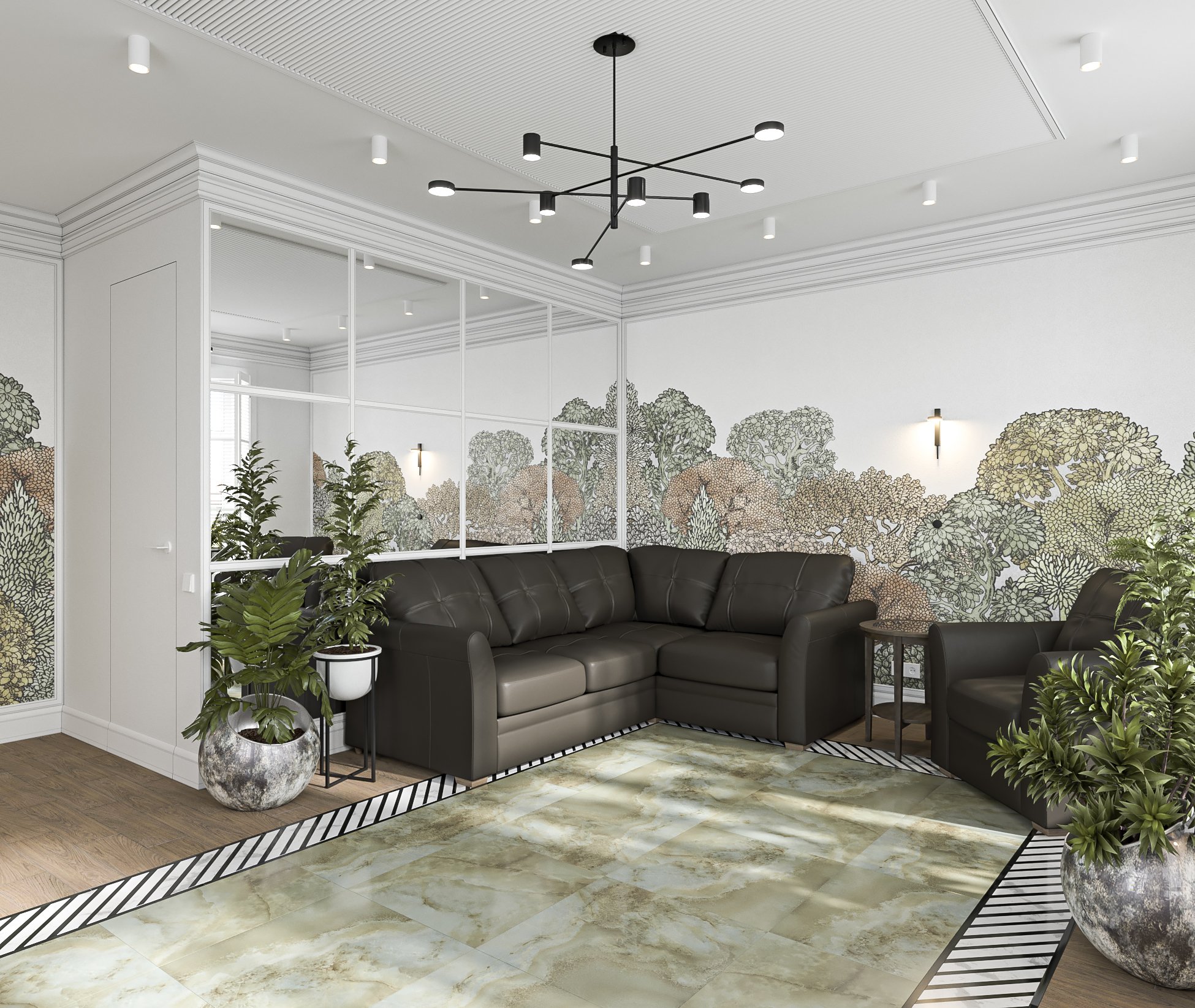 Проект дачного дома для пары в возрасте. Светлую просторную атмосферу помогли создать обои из коллекции «Estampe». Удобный диван заказчики попросили оставить и вписать его в новый интерьер.