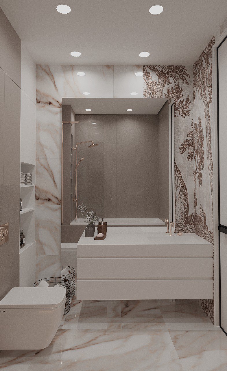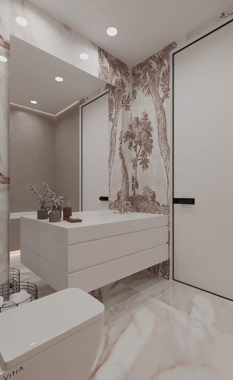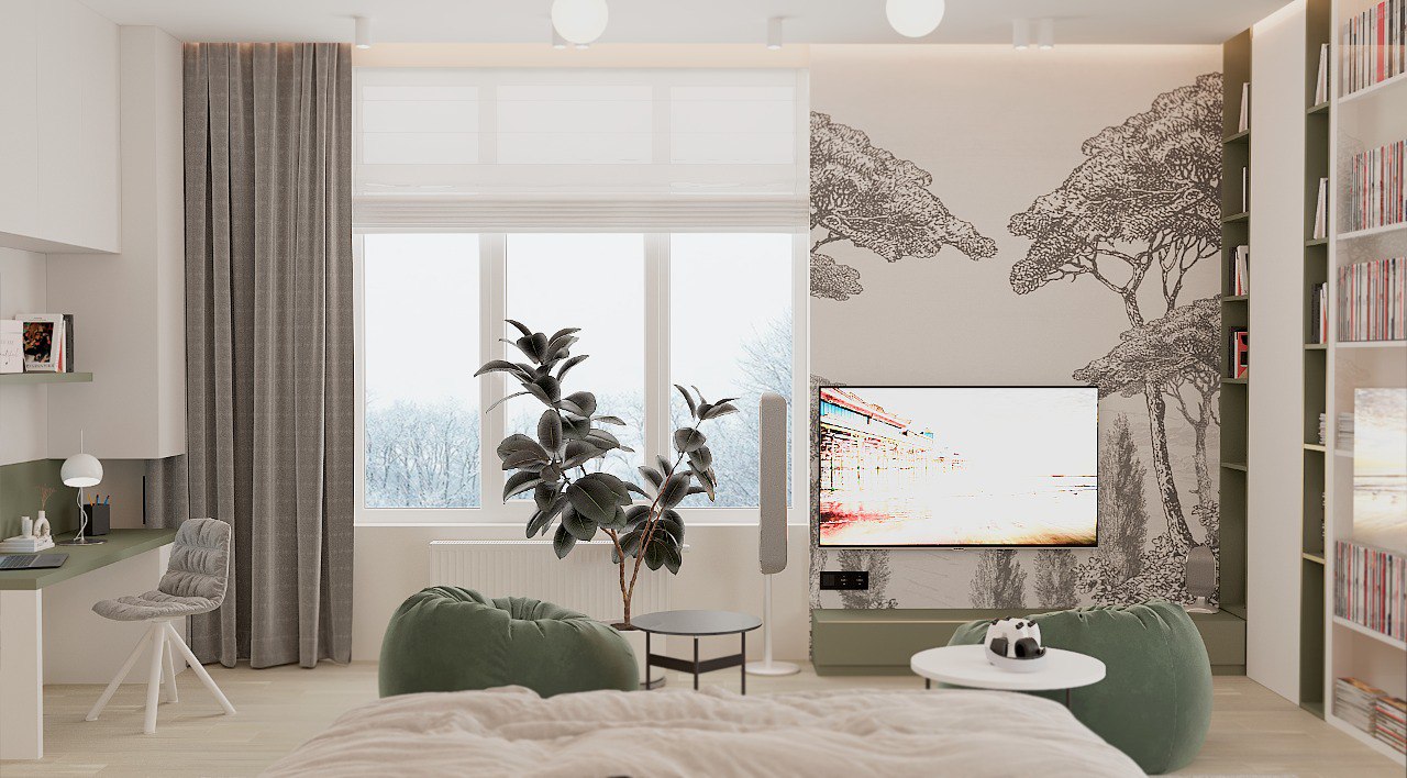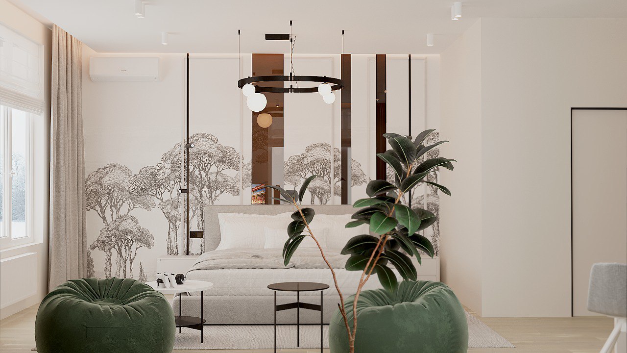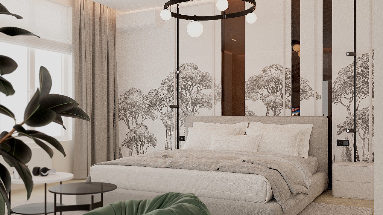 Спальня в ЖК Заман, Атырау. Обои из коллекции ESTAMPE. Словно скрытые за лёгкой пеленой, её принты напоминают иллюстрации из старинной книги про путешествия. Едва заметные силуэты загадочных растений приглашают задержаться ненадолго в их необычных лесах и отвлечься от привычных забот.