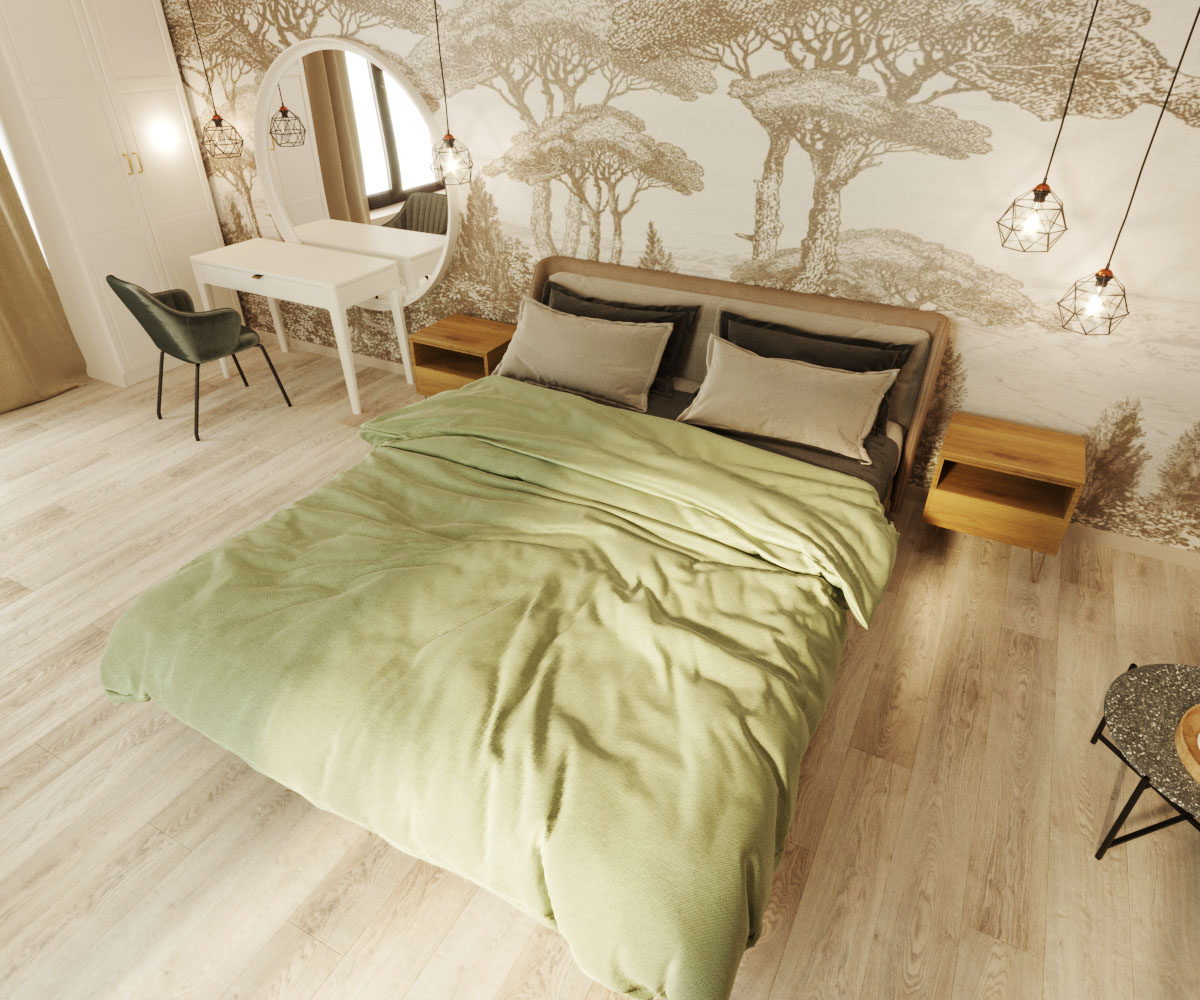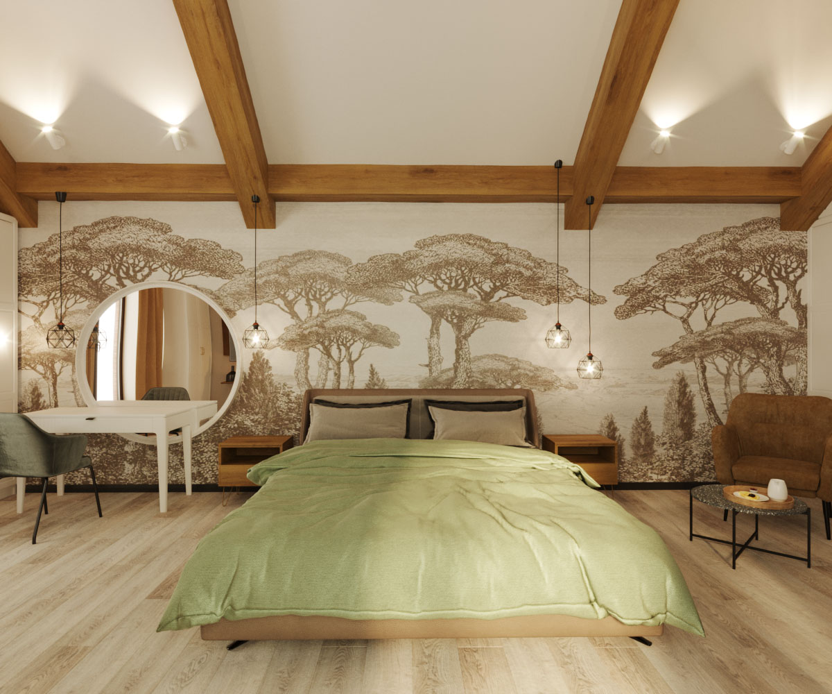 Спальня на втором этаже загородного дома в городе Брянск. Это комната площадью примерно 40 м² для многодетных родителей, которые хотели создать уютную, просторную и светлую спальню. Обои из коллекции ESTAMPE помогли расширить пространство и создать гармоничную спокойную атмосферу.