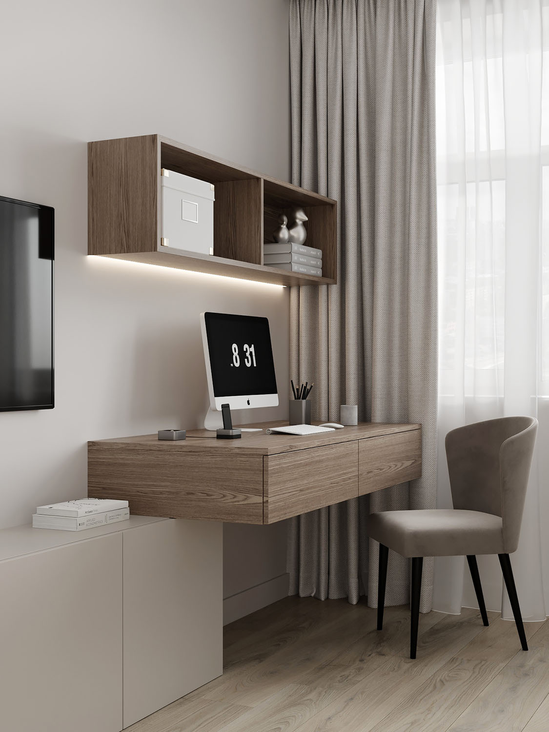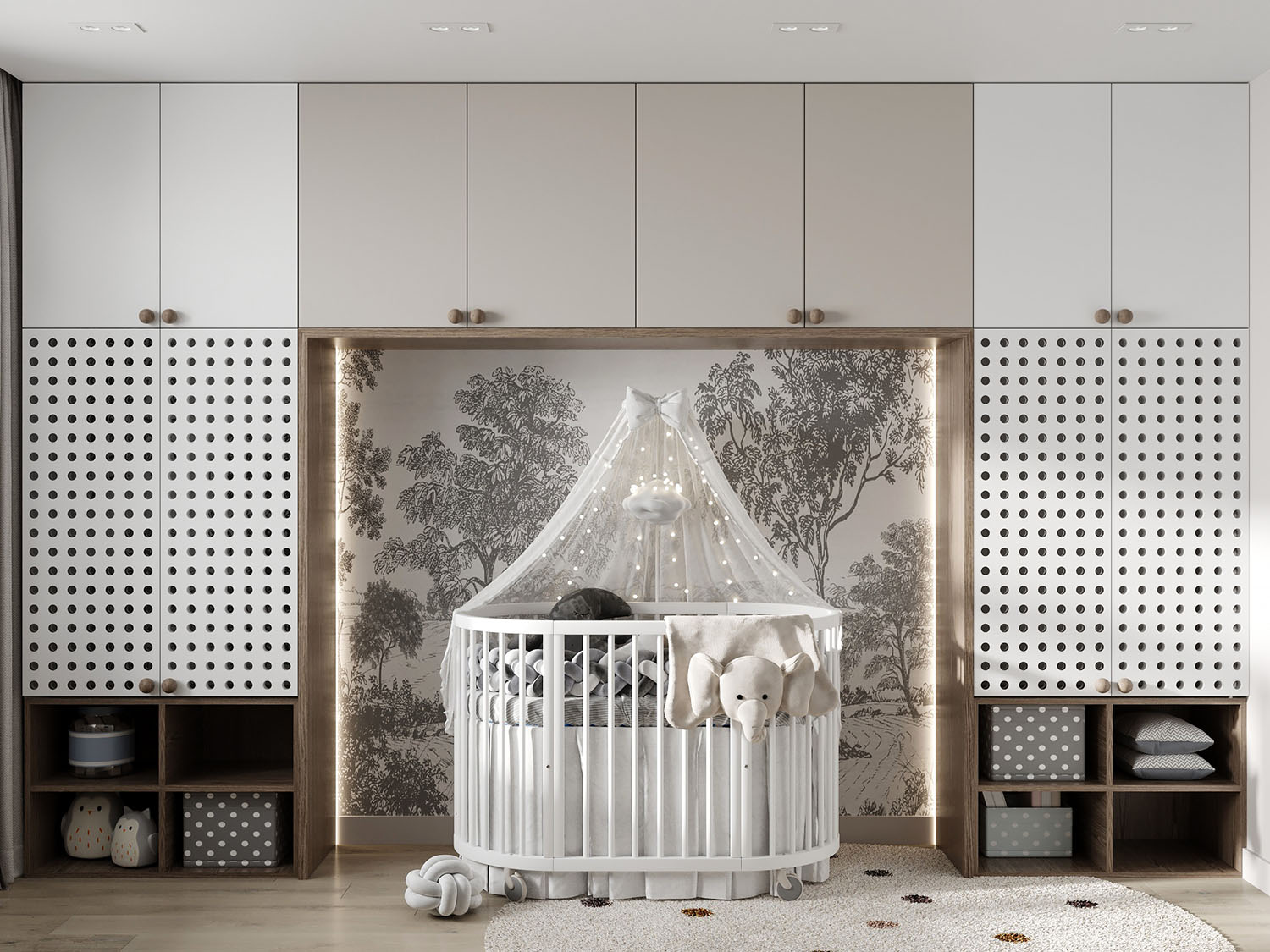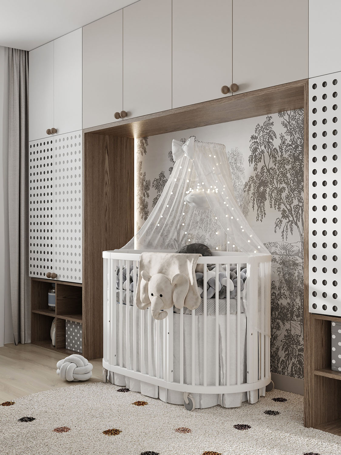 В данной детской будет жить ребёнок, пол которого ещё не известен. Именно поэтому подбор цветового решения был универсальным и легко может быть дополнен акцентным цветом, будь то мальчик или девочка. Кровать-люлька легко заменяется на более подростковую. Ведь для нее заранее заложено место!