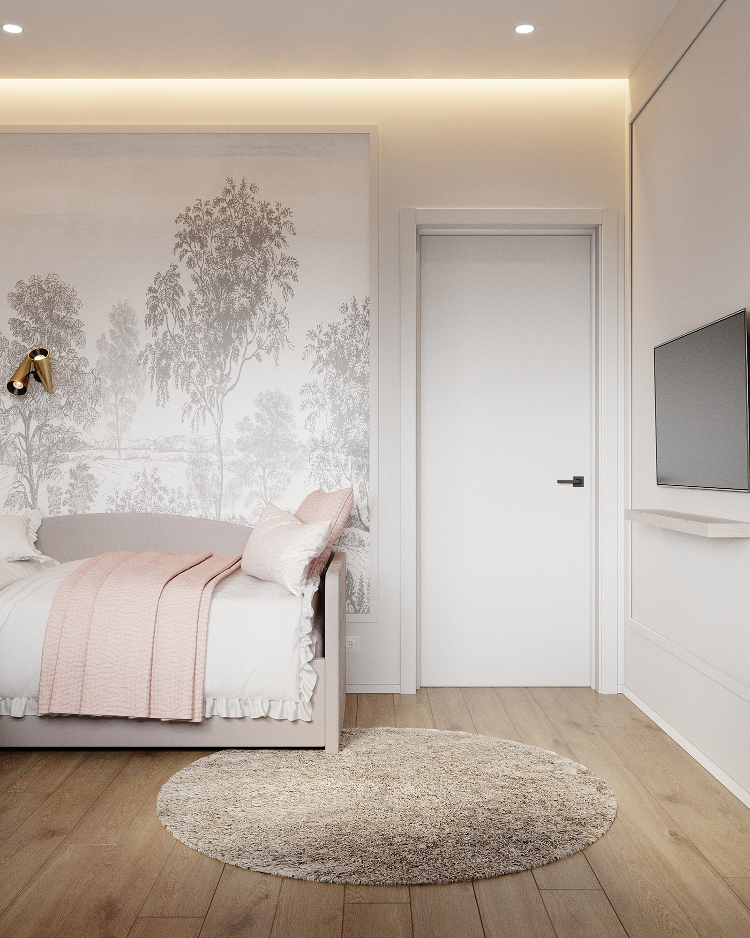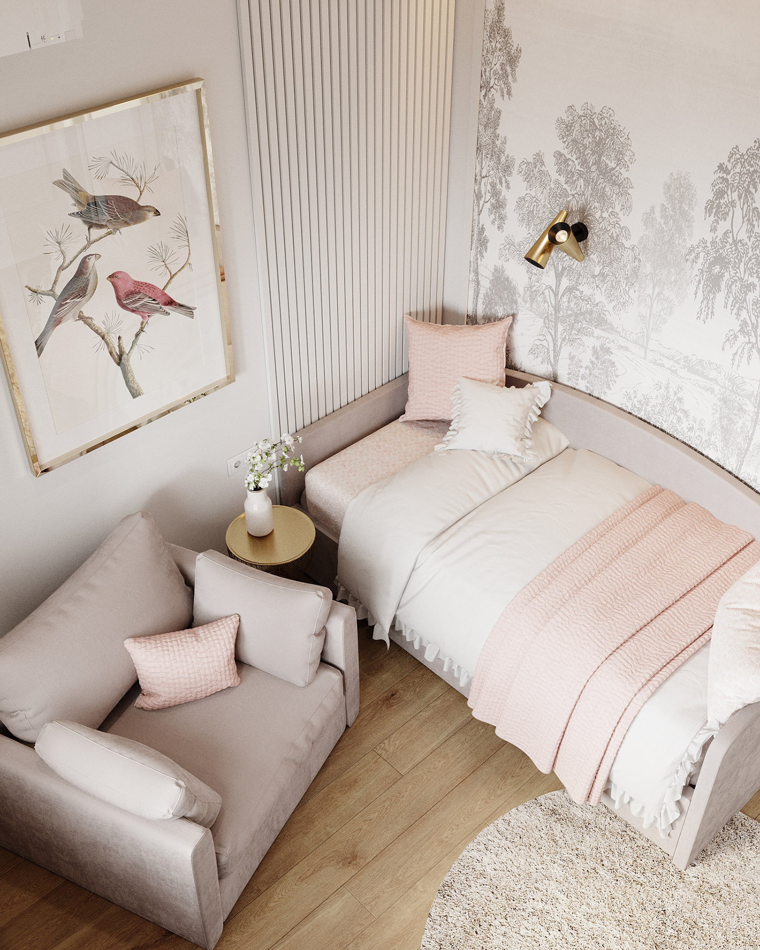 Детская для девочки-подростка в частном доме, г. Симферополь. Площадь комнаты — 12 м². Заказчики полностью доверились вкусу дизайнера. Комната вышла в нейтральных оттенках, акцентом стала фреска из коллекции дизайнерских принтов «Estampe».