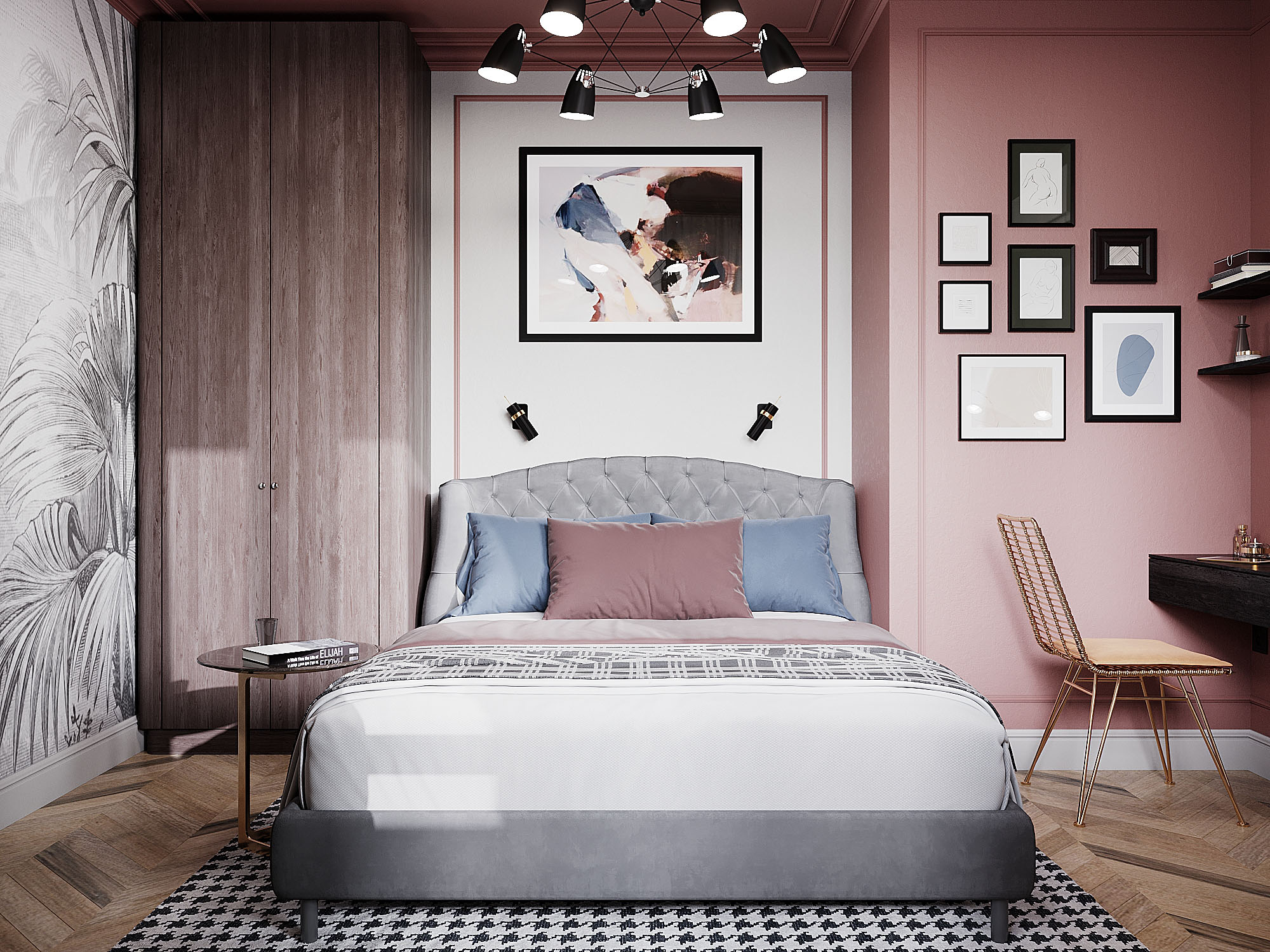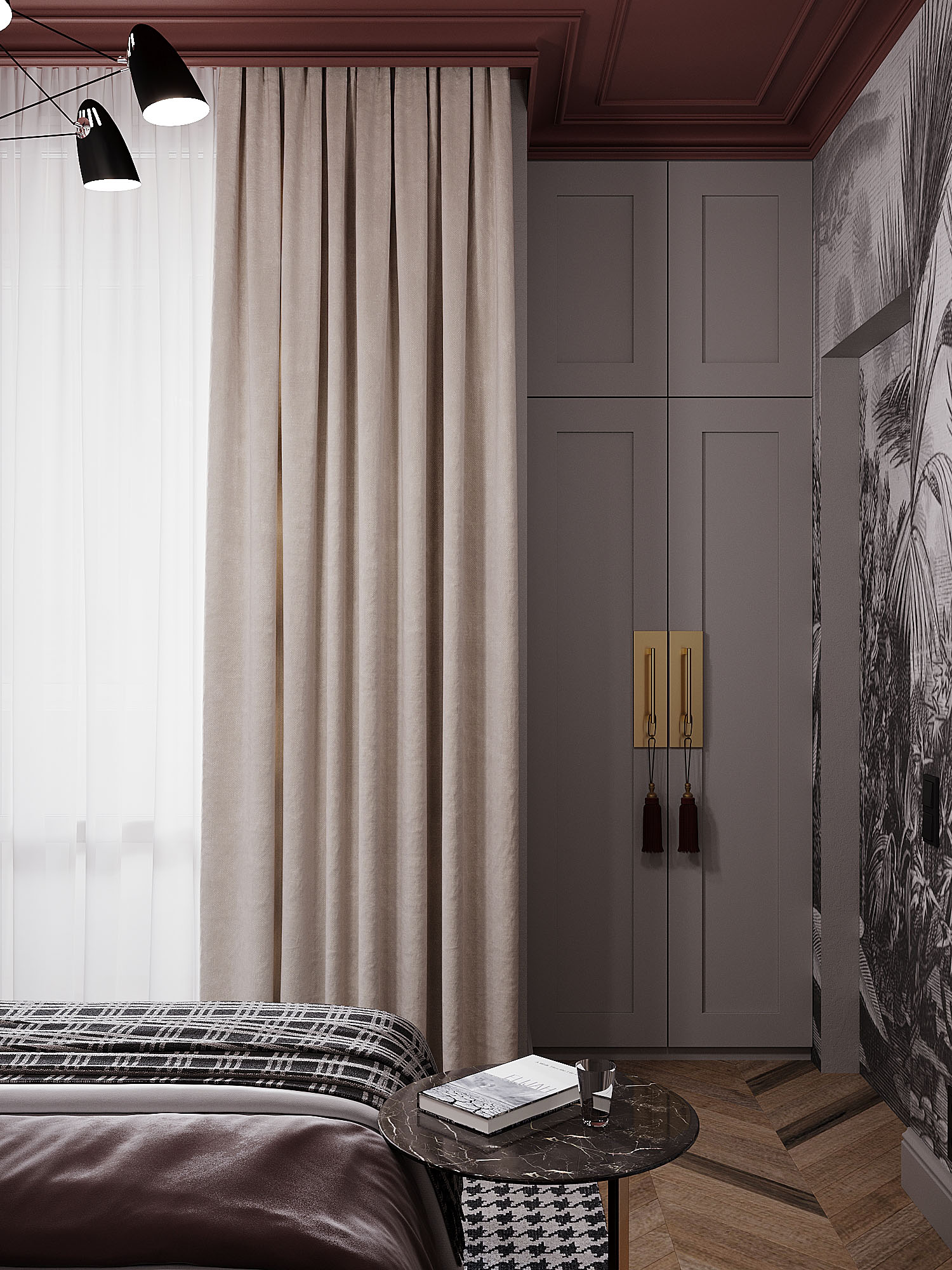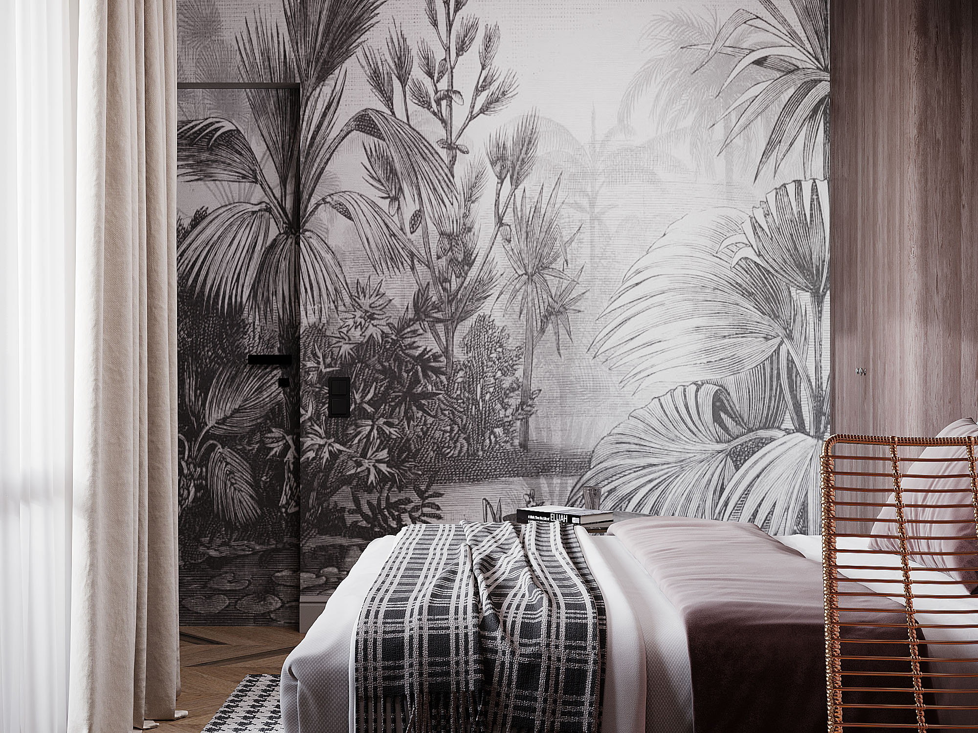 Смелый, яркий и эклектичный интерьер спальни в ЖК Вестердам. Обои из коллекции Estampe. Её принты напоминают иллюстрации из старинной книги про путешествия. Едва заметные силуэты загадочных растений приглашают задержаться ненадолго в их необычных лесах и отвлечься от привычных забот.