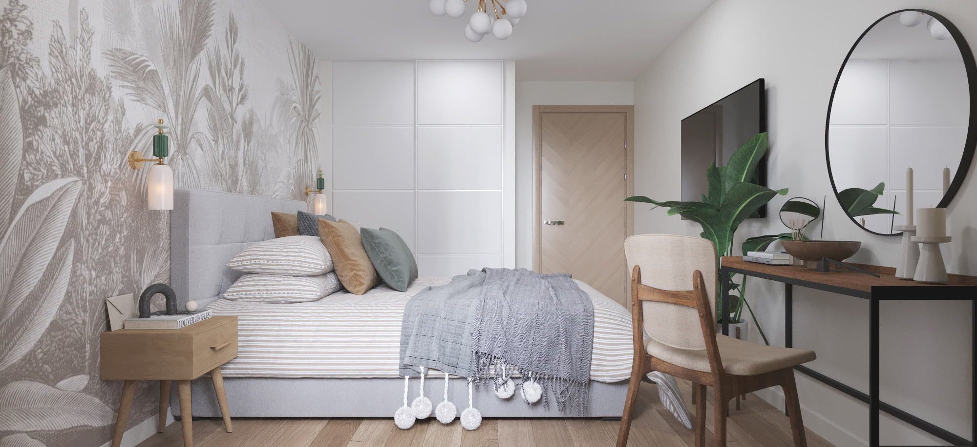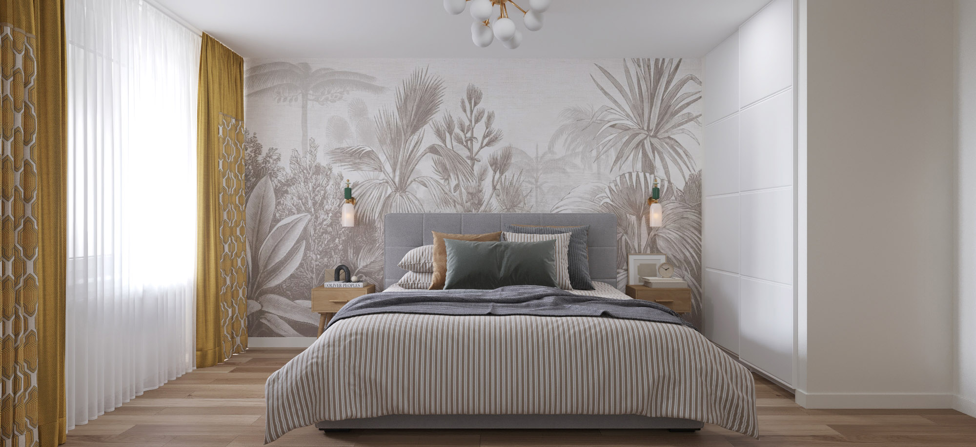 Заказчикам очень нравятся современные интерьеры с нотками ретро стиля, что и отразилось в данном проекте. Для спальни выбрали обои из коллекции ESTAMPE, они помогли придать комнате нужное настроение.