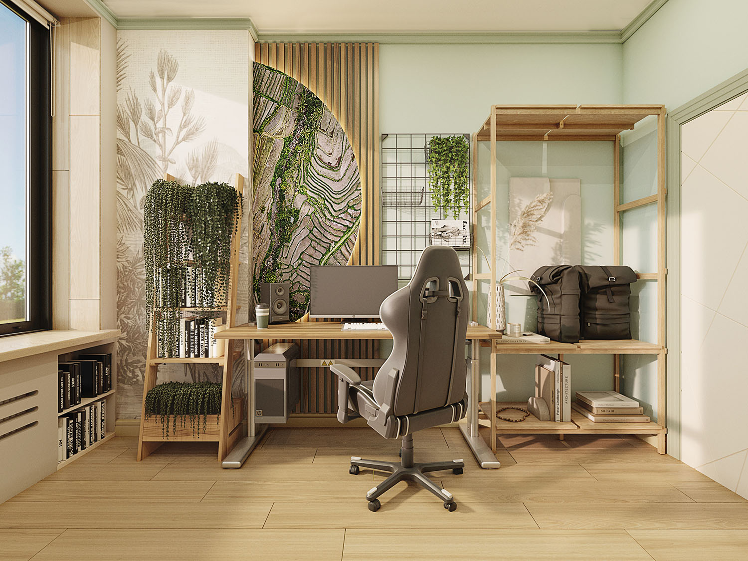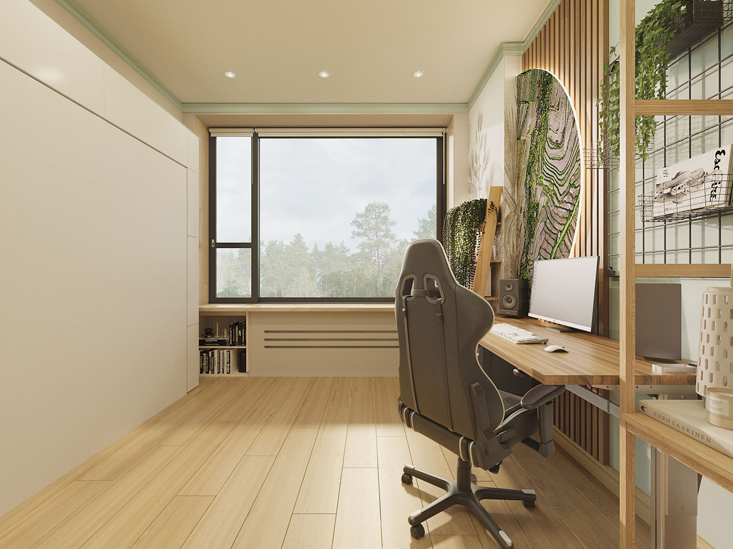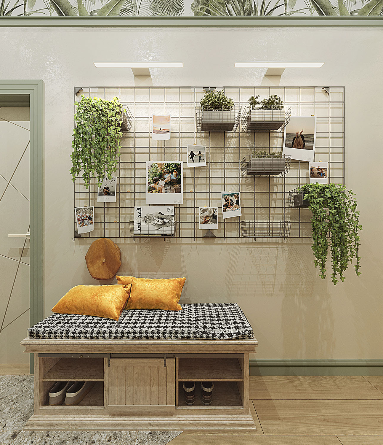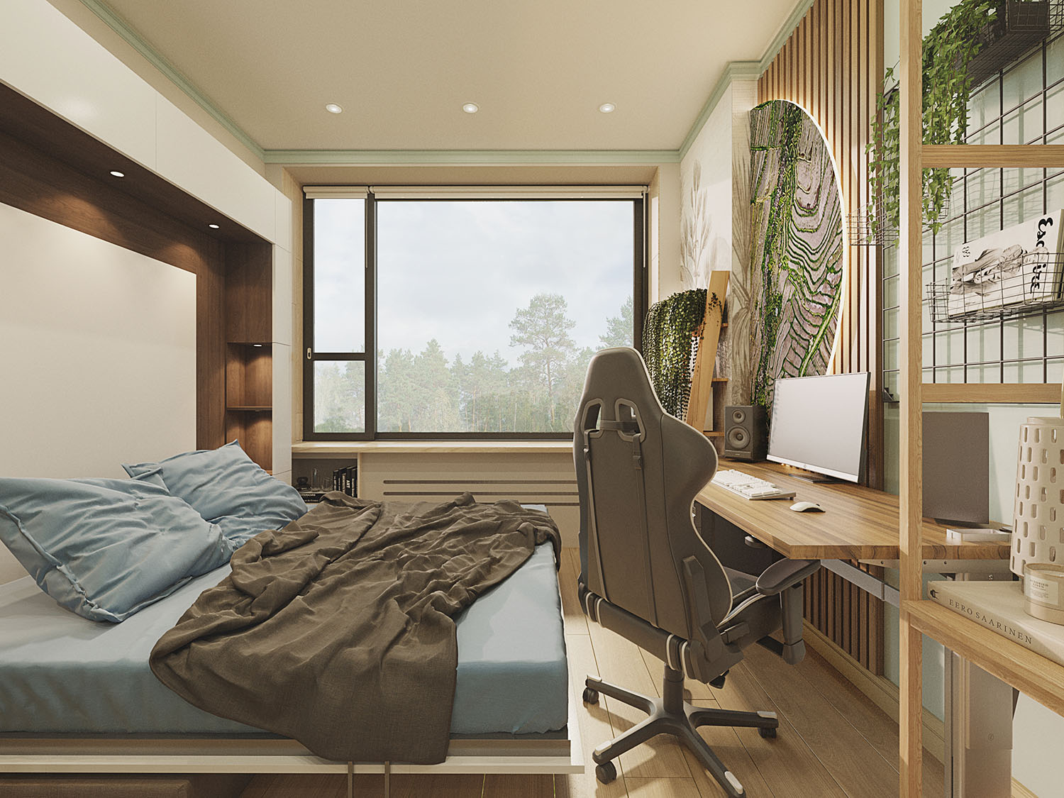 Спальня и коридор из проекта двухкомнатной квартиры в зеленом районе Москвы. Заказчики — путешественники, влюбленные в пейзажи экваториальной и субтропической зоны: мягкий песок побережья, сочные струящиеся зеленью влажные леса, красивый древесный отлив, бирюзу рифового океанического побережья, выступающие камни и скалы, и некоторые нотки Африки: теплые соломенные цвета сухости и буша, мягкие песочно-кремовые тона. Все это легло в основу концепции. Для каждого помещения — свое настроение: прихожая, как преддверие джунглей, встречает песочными оттенками с вкраплениями травы на обоях, ванная — сочные джунгли с обилием растений и зелени, гостиная — саванна, теплая и сухая по атмосфере, а спальня с тропическими обоями и волбордом из коллекции Bird see — побережье со свежестью океана и теплотой песка.