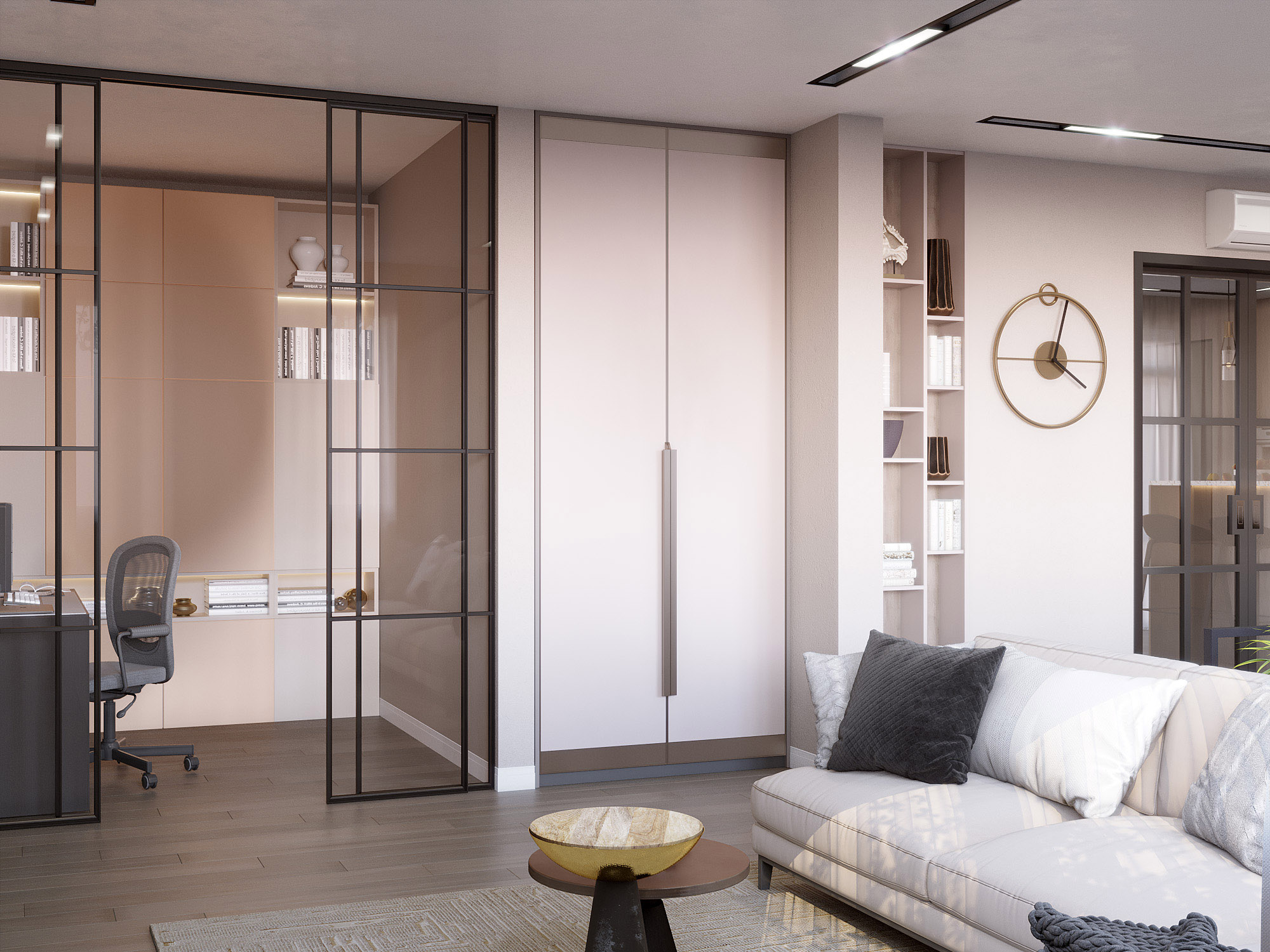 Это квартира свободной планировки площадью 140 м². Такое пространство даёт небывалый простор для творчества дизайнера. Перед Вами объединенная кухня-гостиная (около 50 м².), в которой нашлось место для зоны столовой и даже отдельного кабинета за стеклянными перегородками.