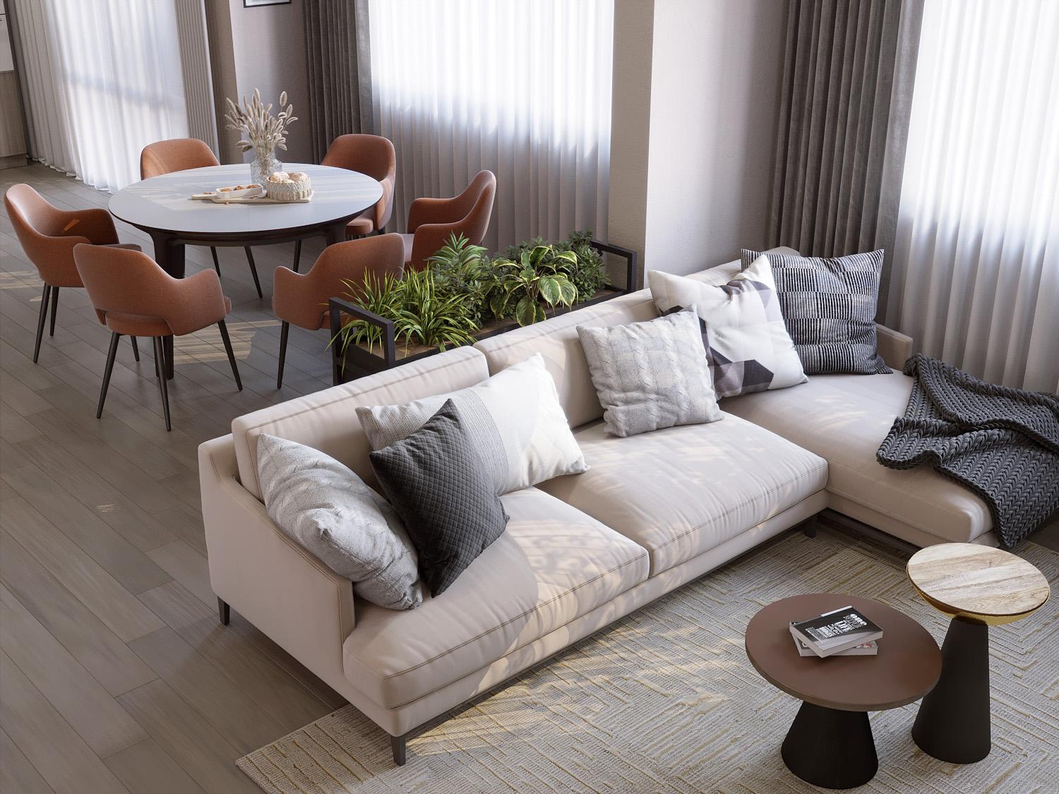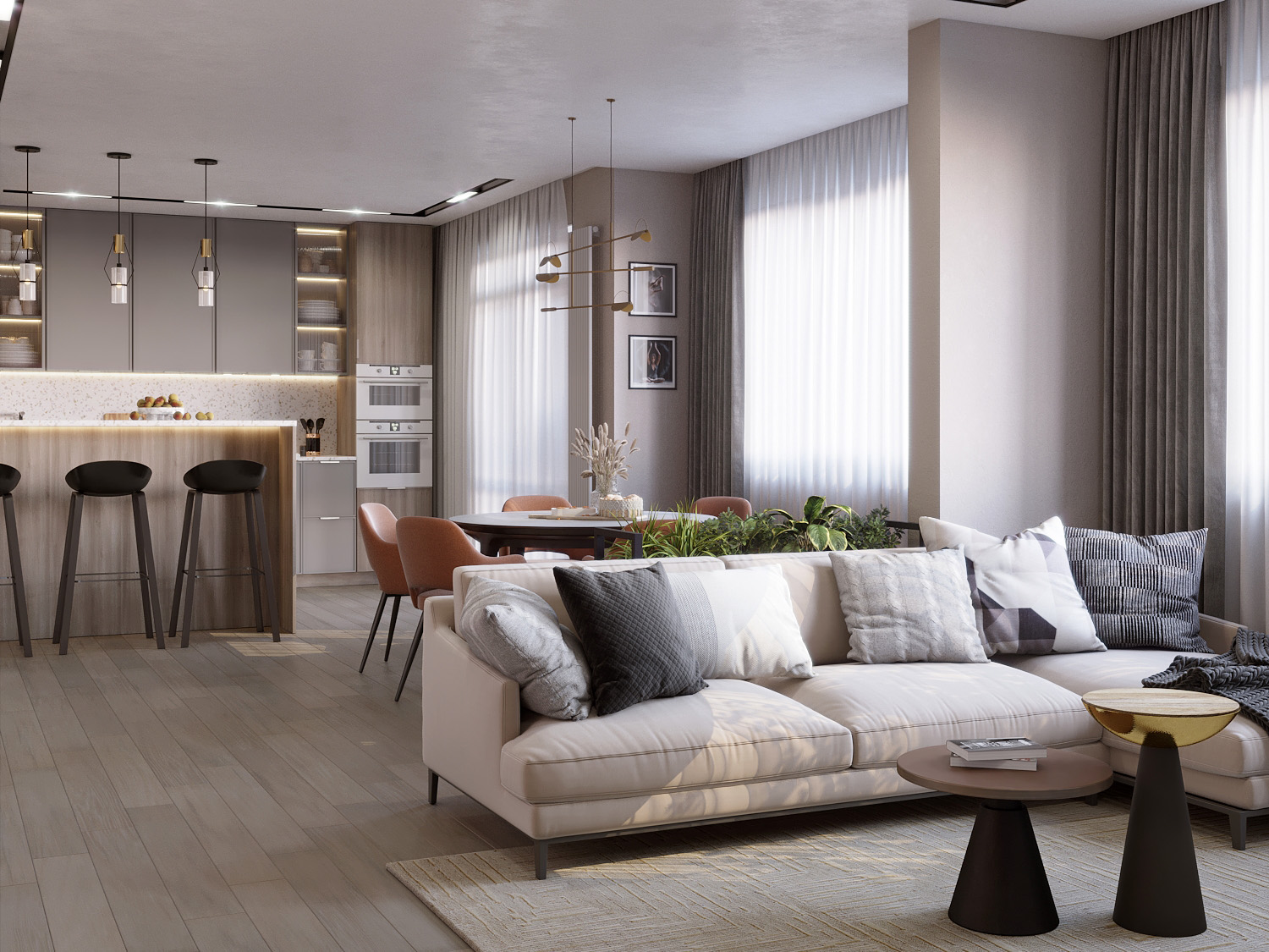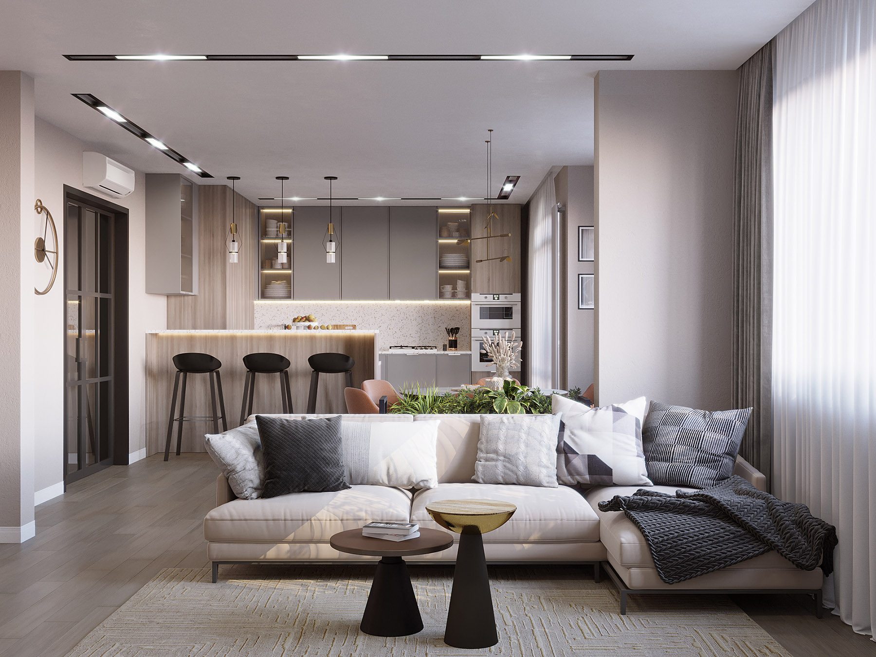 И несмотря на то, что пространство общее и функционально наполненное, здесь нет никакого перегруза! Простор, воздух, много естественного света, приятная цветовая гамма и природные материалы непременно повлияют на то, что эта кухня-гостиная станет излюбленным местом времяпровождения для всех членов семьи!