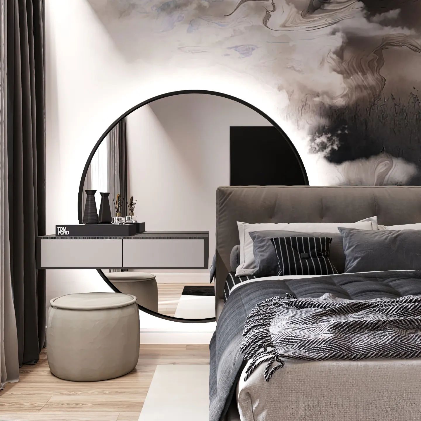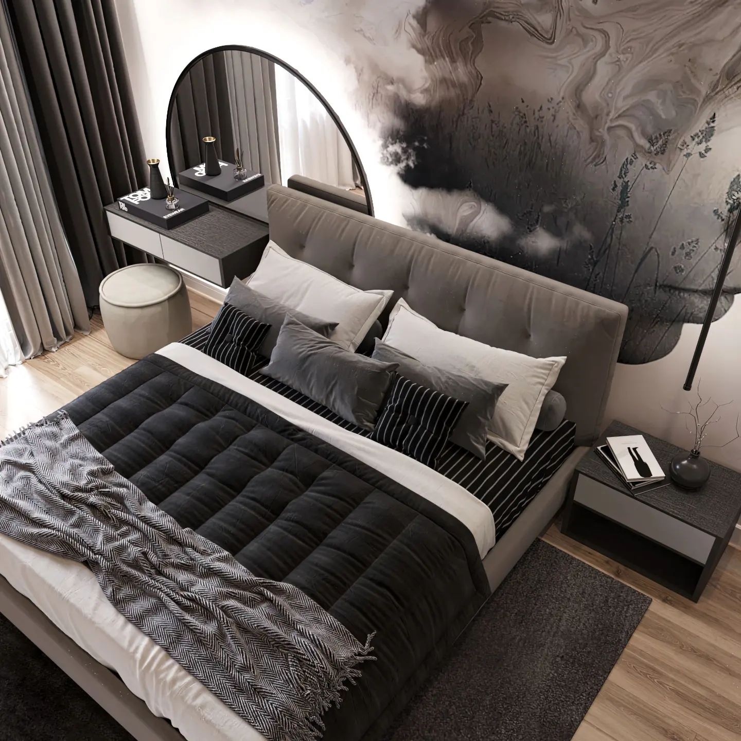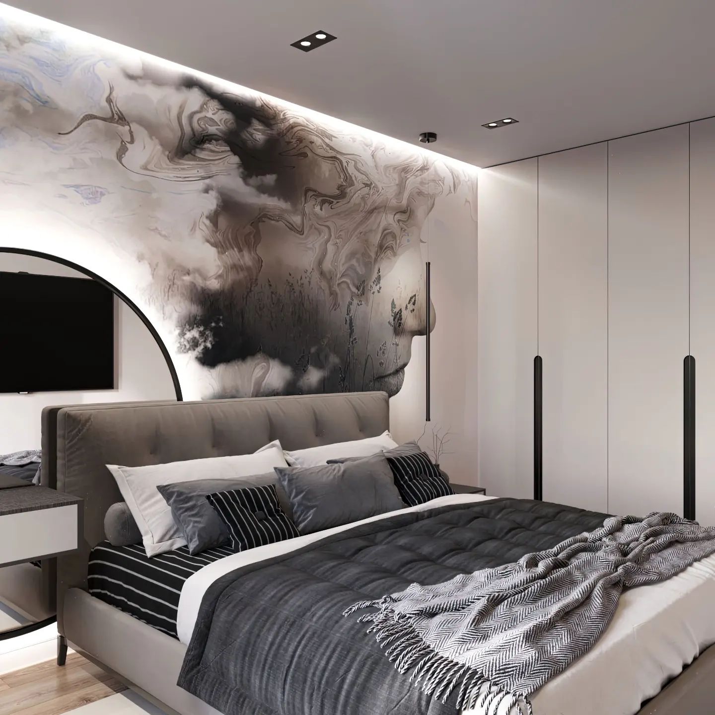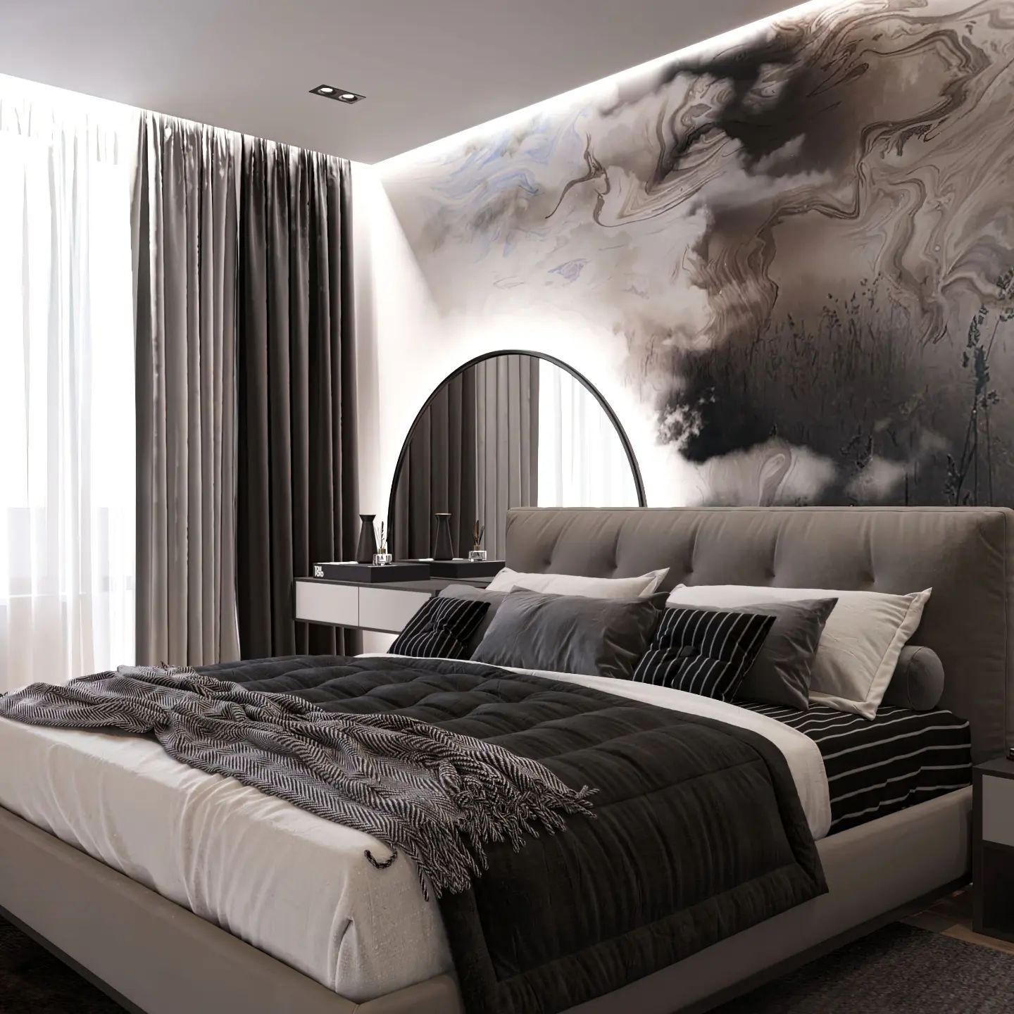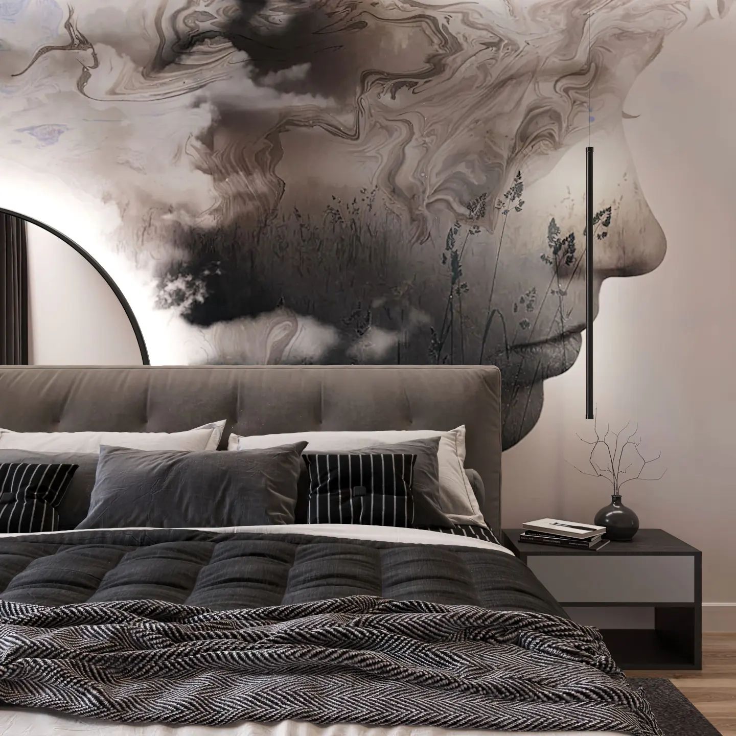 Интерьер спальни для молодой пары. Обои из коллекции «Euphoria 2019». Дымчатая, воздушная, она словно скрыта едва заметной пеленой. Призрачные изображения создают эффект лёгкого движения, наполняя пространство воздухом и стирая видимые границы. А игра цвета в оттенках дыма и облаков будто рисует замысловатые образы и силуэты на ваших стенах.