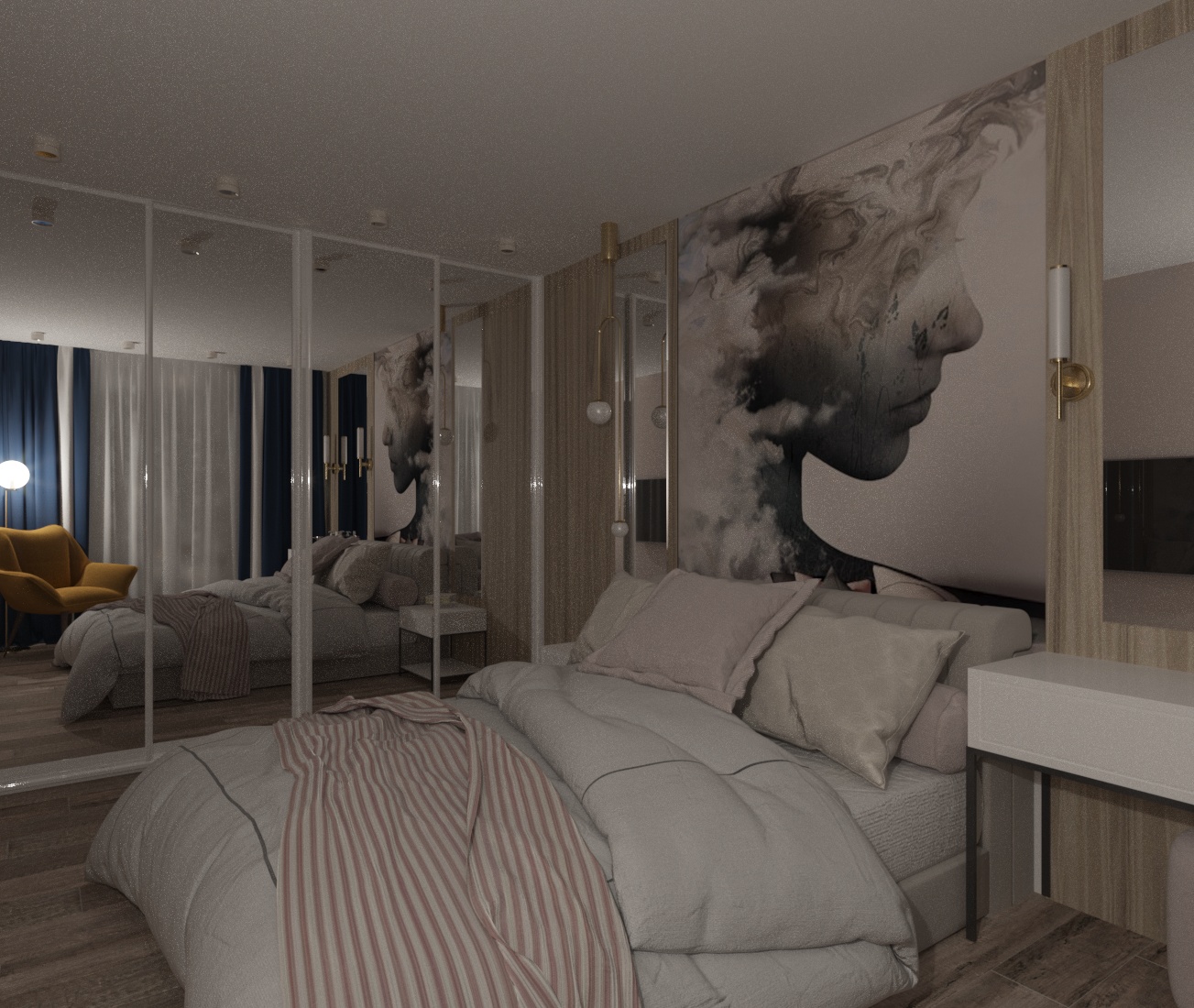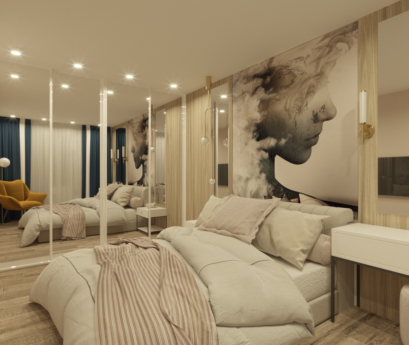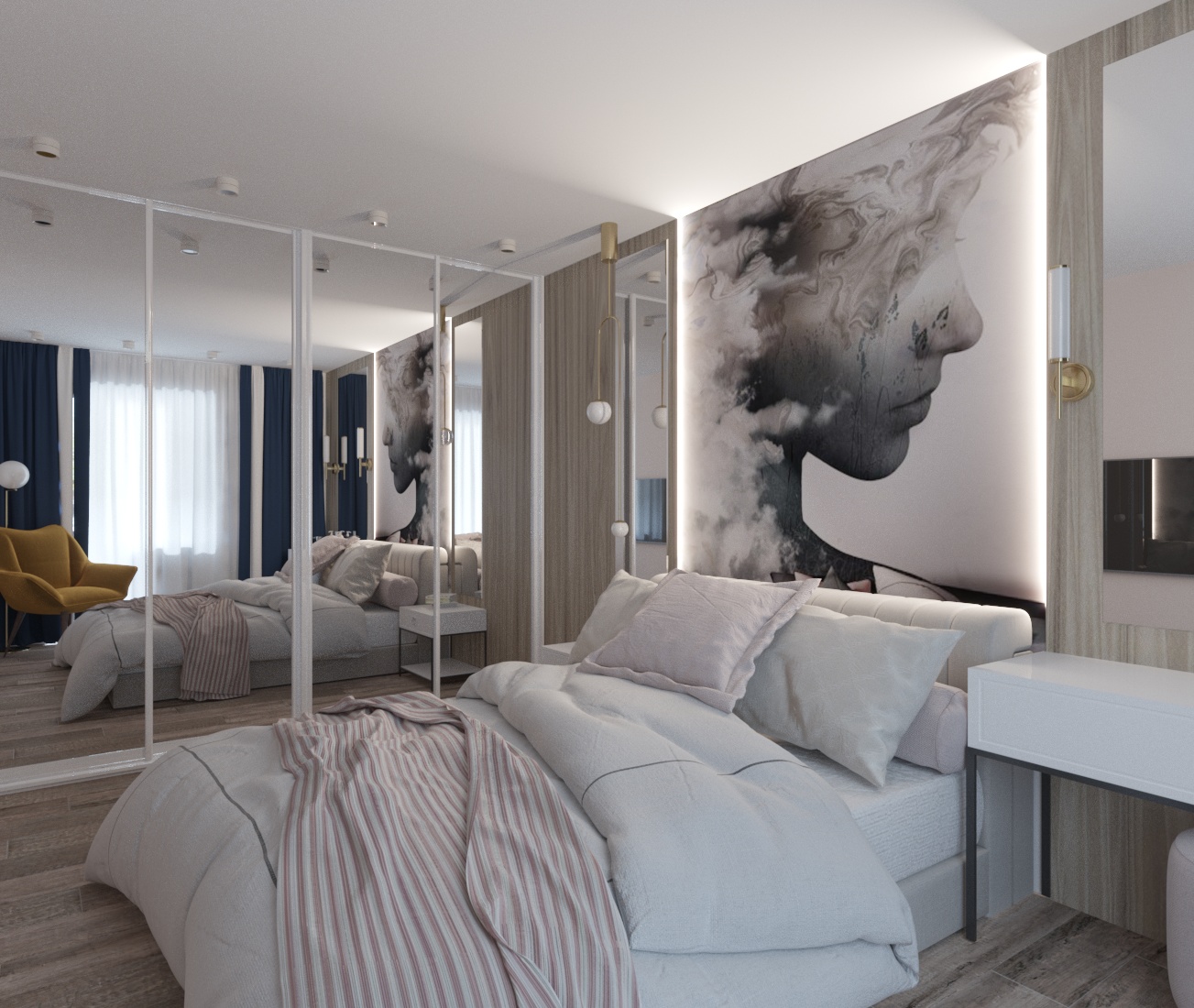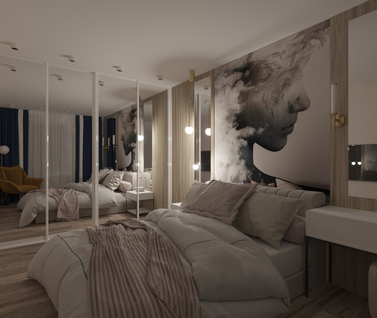 Спальня в ЖК Династия, г. Ярославль. Площадь комнаты — 10 м². Пожеланием заказчицы было — добиться полного уюта, комфорта и функциональности.